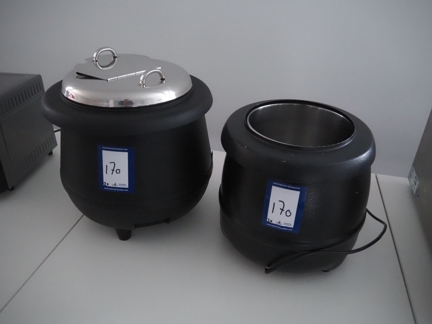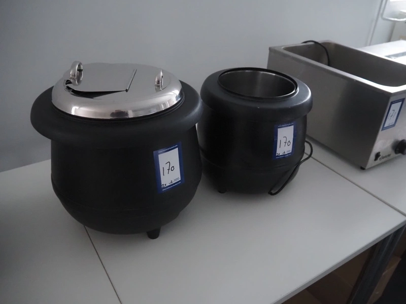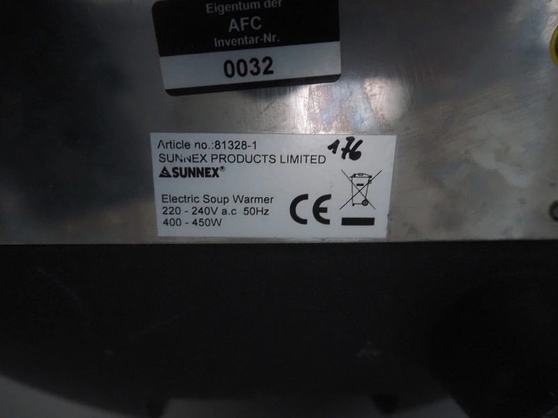 2 Bartscher GmbH / Sunnex soup kettles, type: RDS-100, number: 100061, 230 V, 50 Hz, 400 W, dimensions: 380 mm x 380 mm x 400 mm, Sunnex soup kettle, number: 81328-1, 220/240 V, 50 Hz, 400/450 W, dimensions: 320 mm x 320 mm x 330 mm.