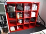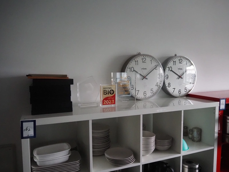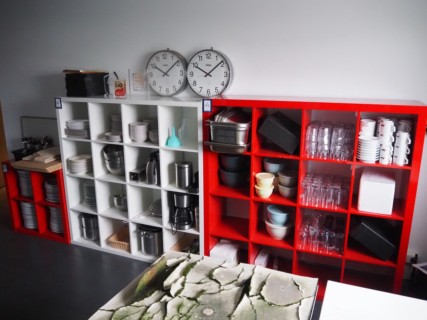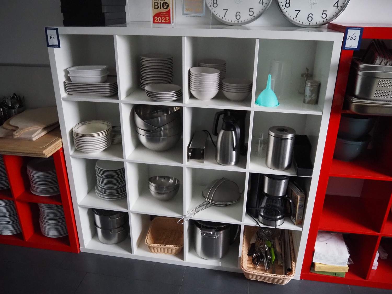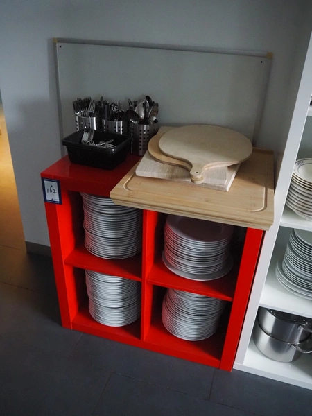 3 cabinets with large amount of kitchen equipment, among others: plates, cutlery, and drinking glasses, total dimensions: 3800 mm x 400 mm x 1470 mm.