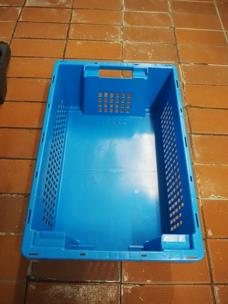 Pallet with plastic crates, each crate dimensions: 600 mm x 400 mm x 200 mm.