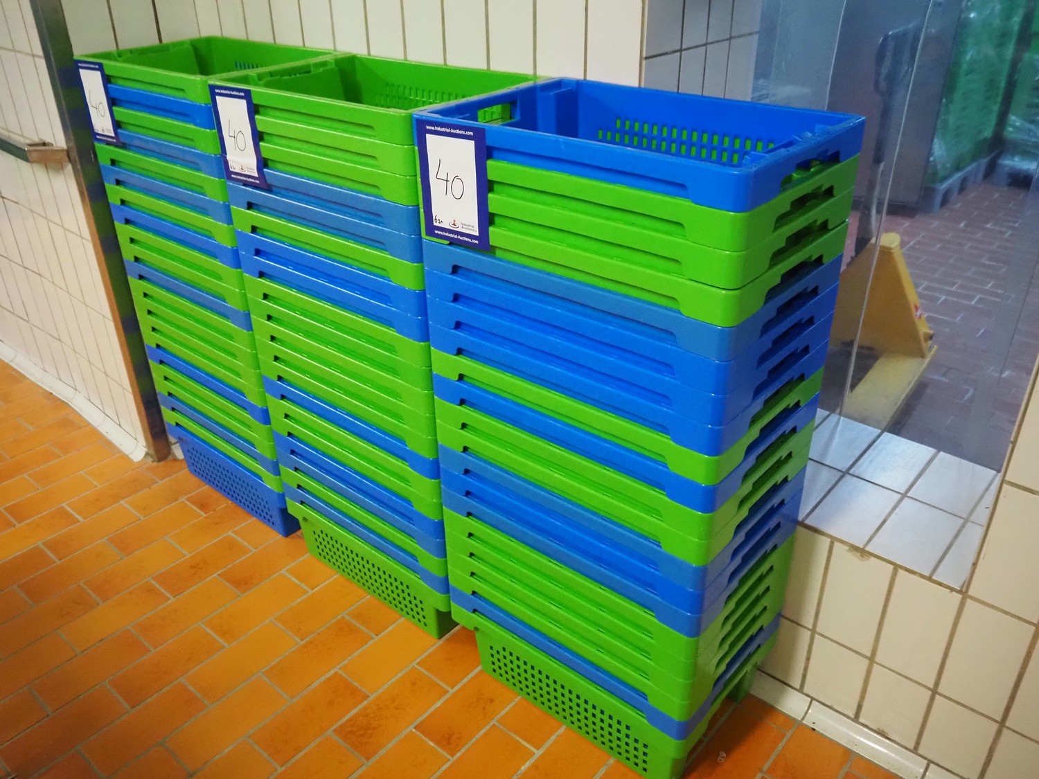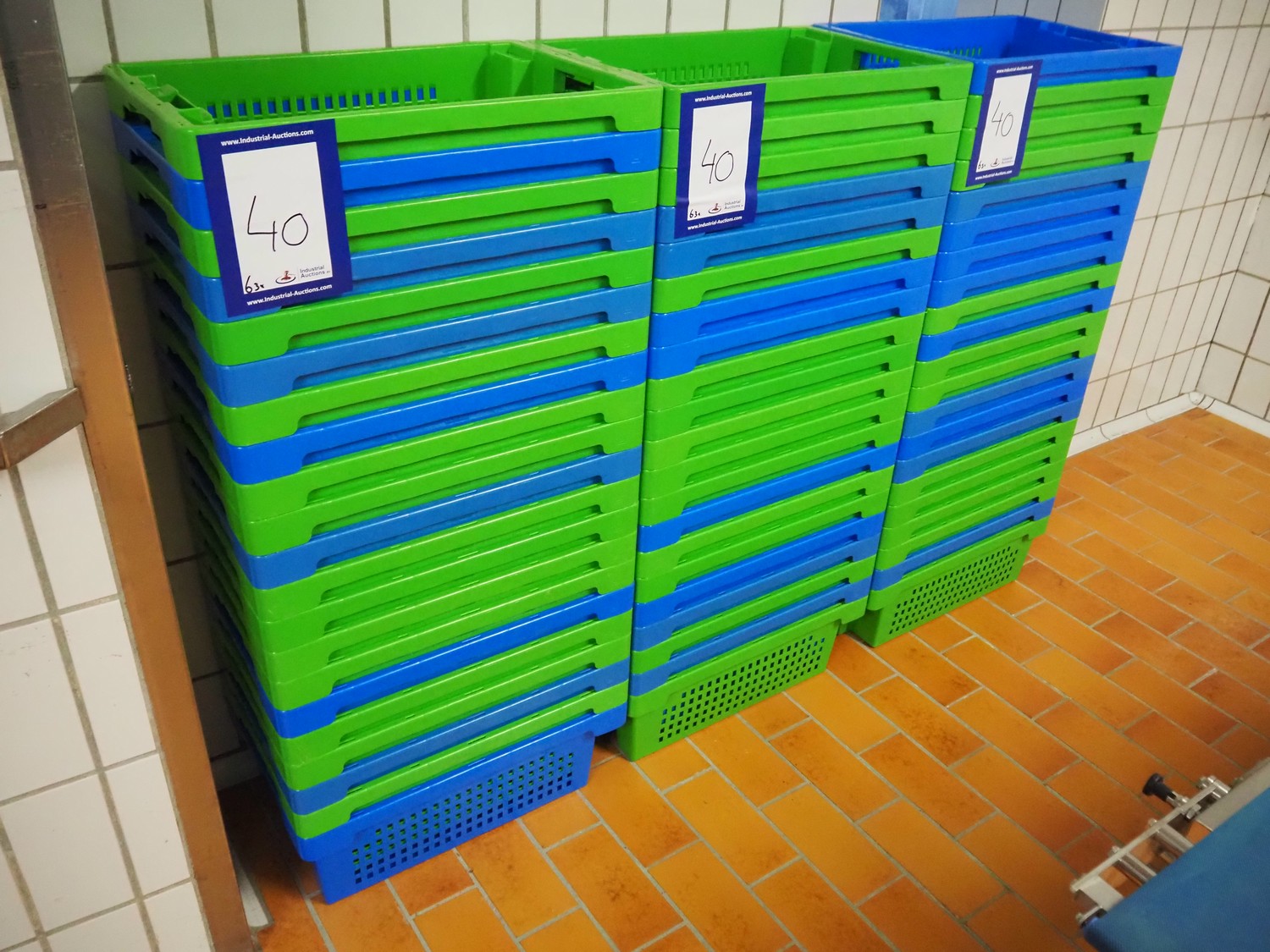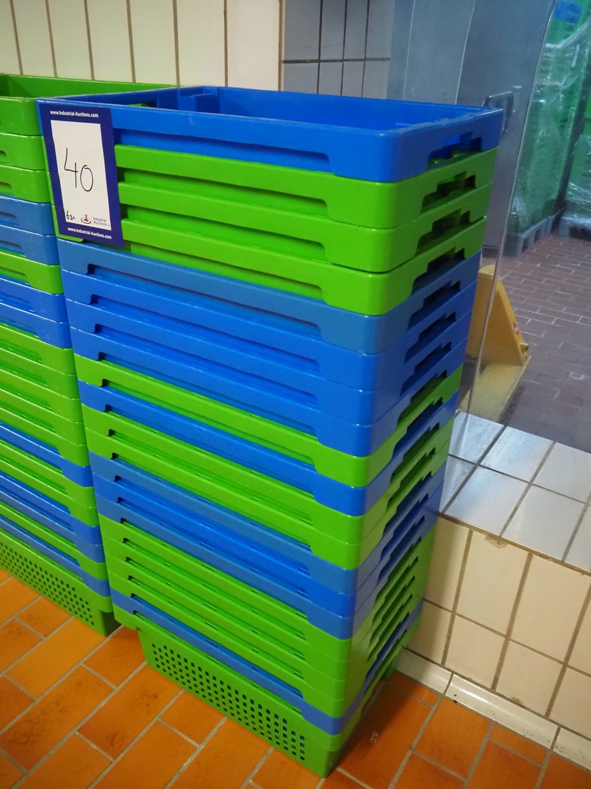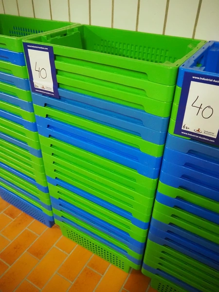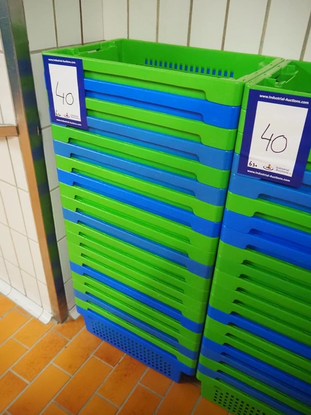 63 plastic crates, each crate dimensions: 600 mm x 400 mm x 200 mm.