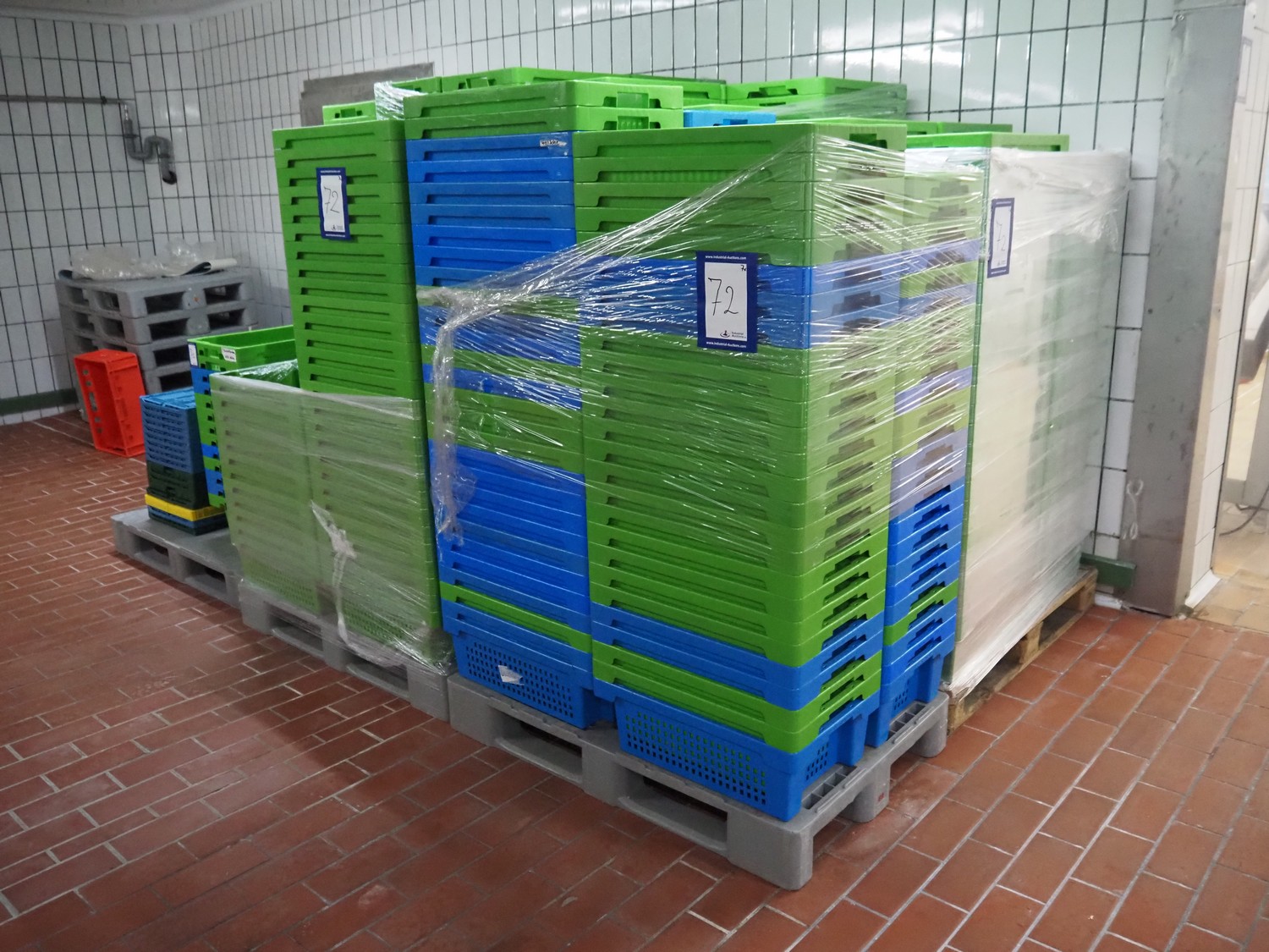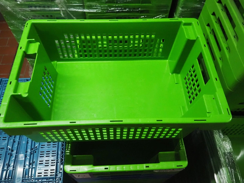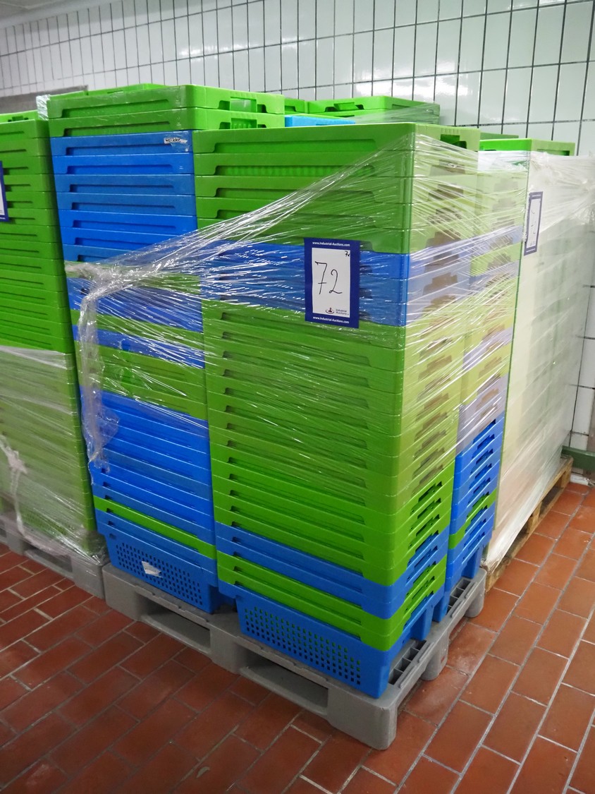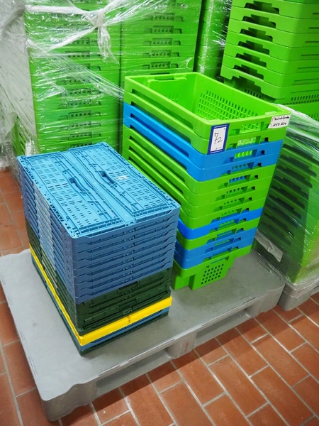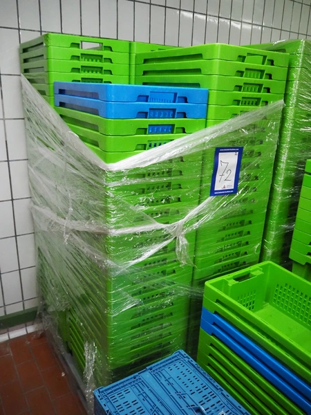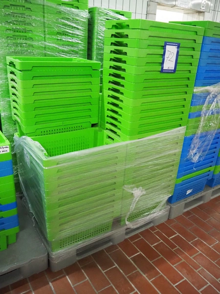 7 pallets with large amount of plastic crates, each crate: 600 mm x 400 mm x 200 mm.