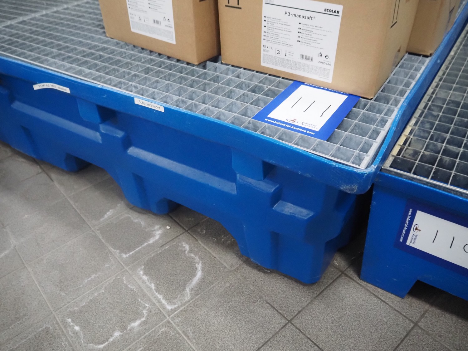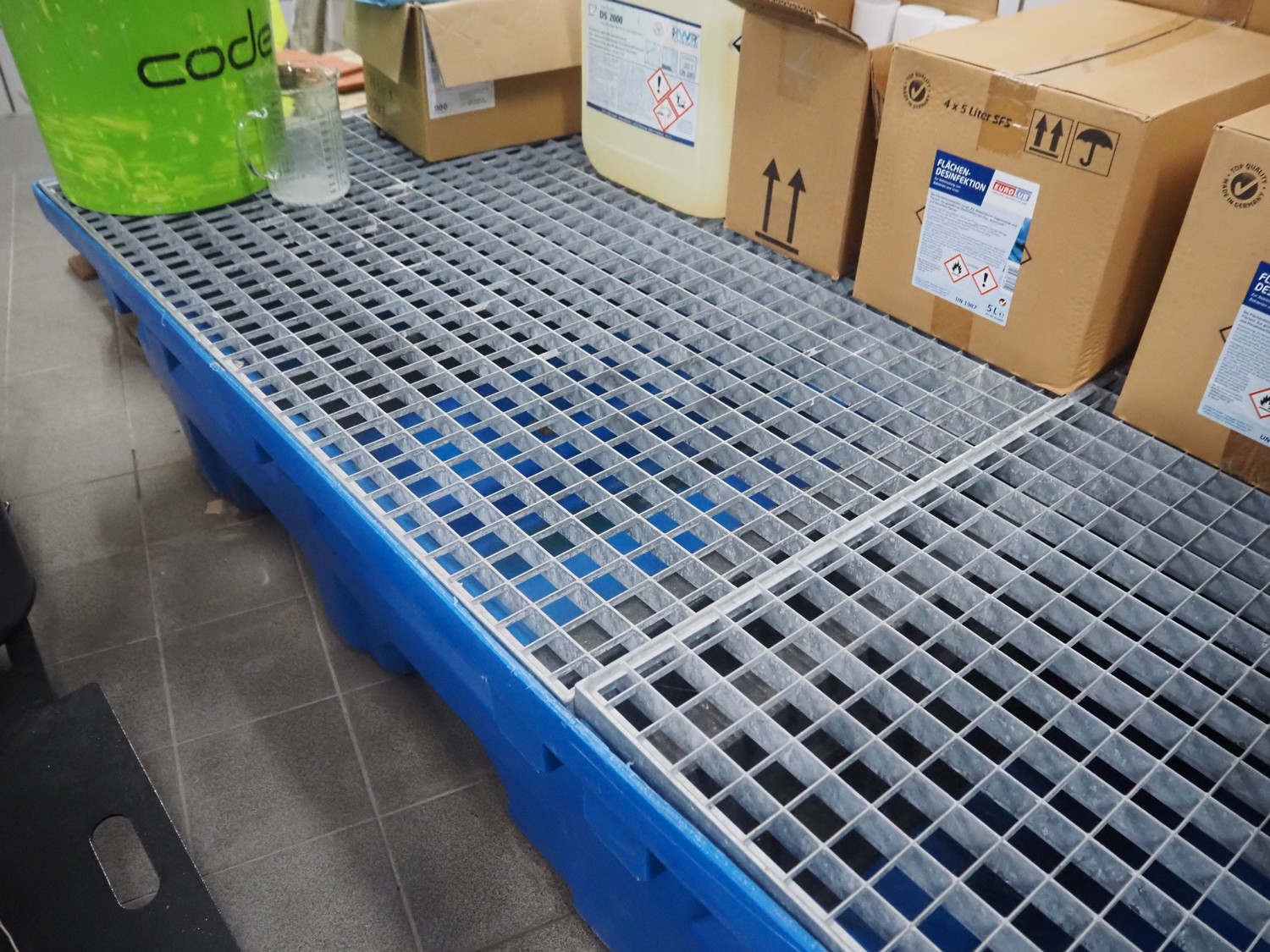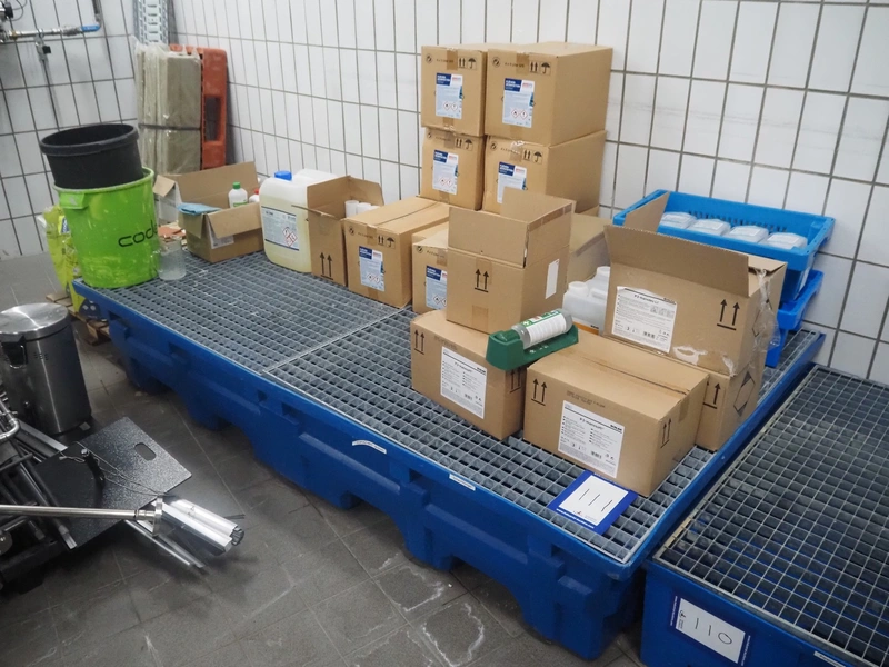 Plastic drip tray with large amount of hygiene liquid, dimensions: 2470 mm x 1400 mm x 470 mm.