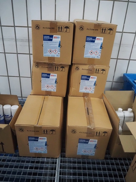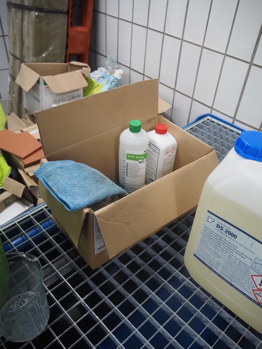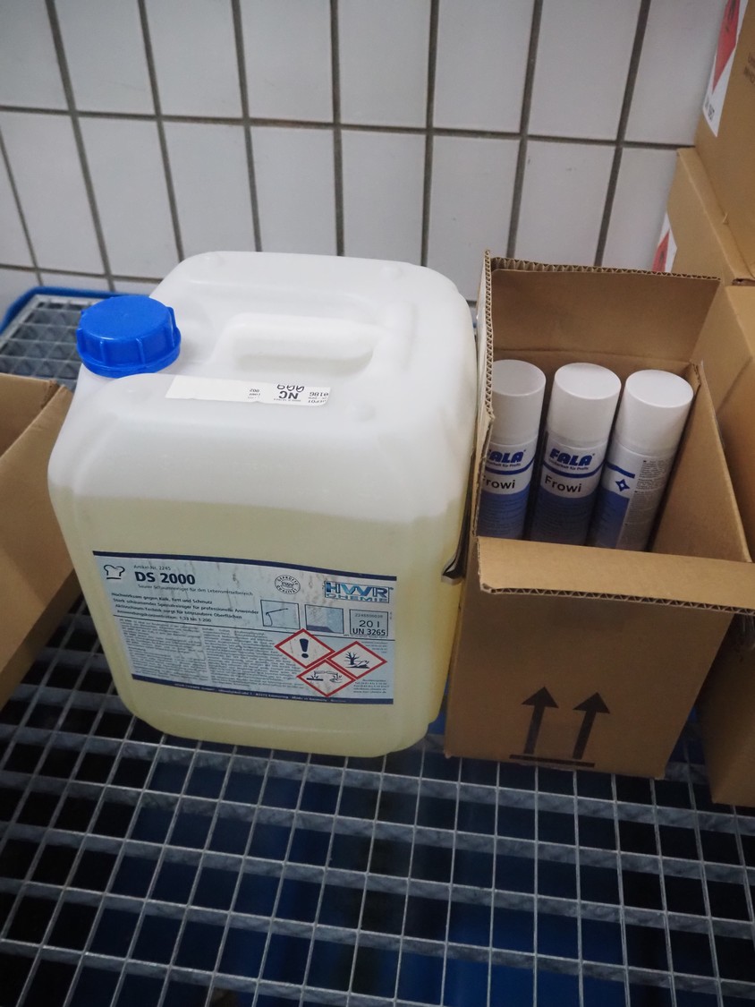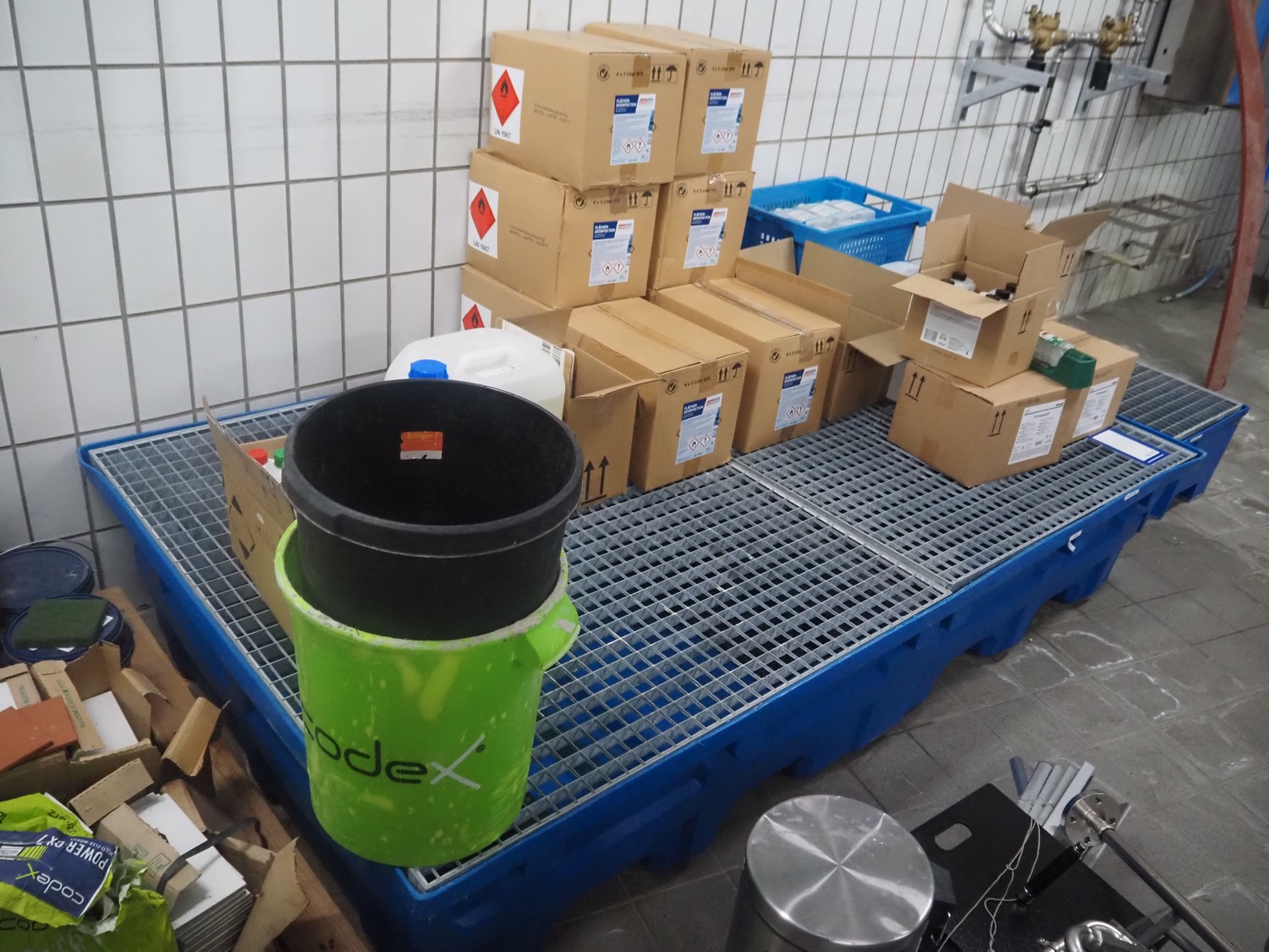 Plastic drip tray with large amount of hygiene liquid, dimensions: 2470 mm x 1400 mm x 470 mm.