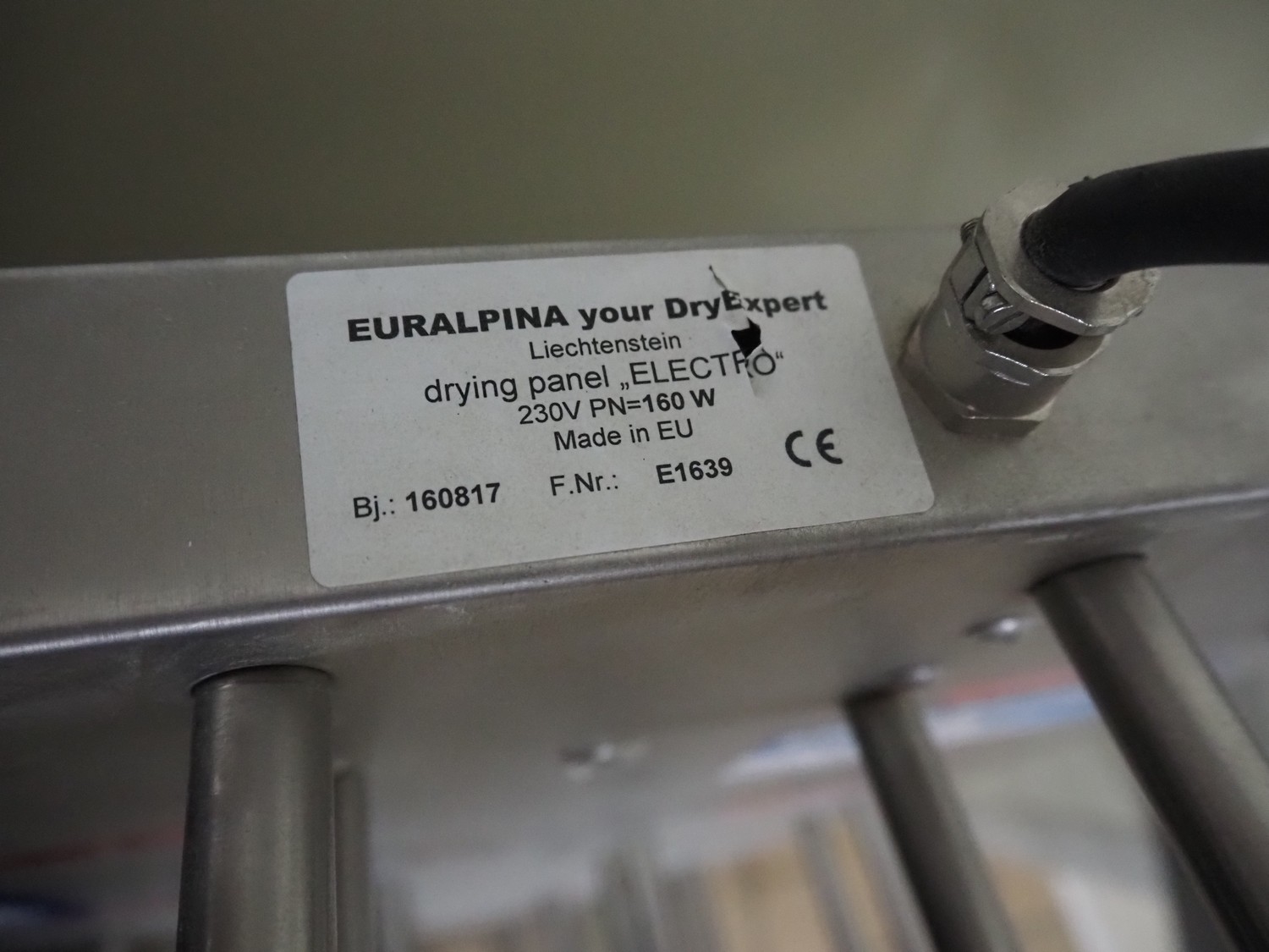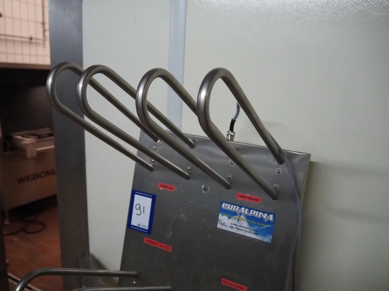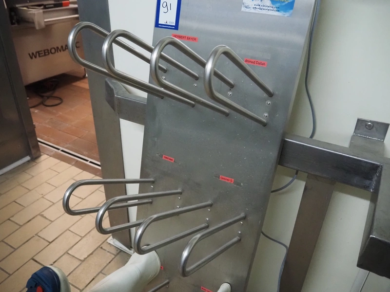 Euralpina boots drying rack, number: E1639, year of construction: 160817, 230 V, 160 W, 20 pegs, peg length: 350 mm, total dimensions: 410 mm x 400 mm x 1500 mm.