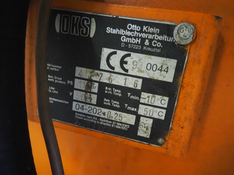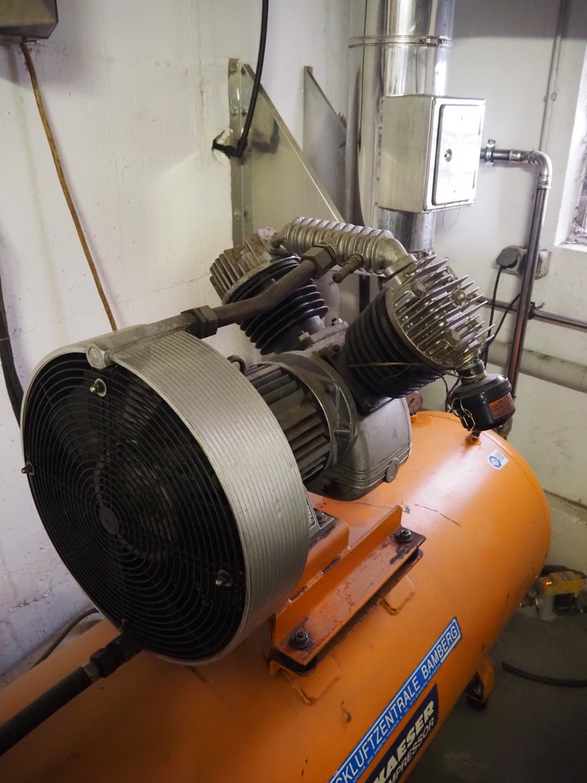 - Kaeser compressor, type: 8°C1100-500, number: 1821064, year of construction: 1994, 400 V, 3 Ph, 50 Hz, 12 A, 5.5 kW, dimensions: 1850 mm x 600 mm x 1300 mm.