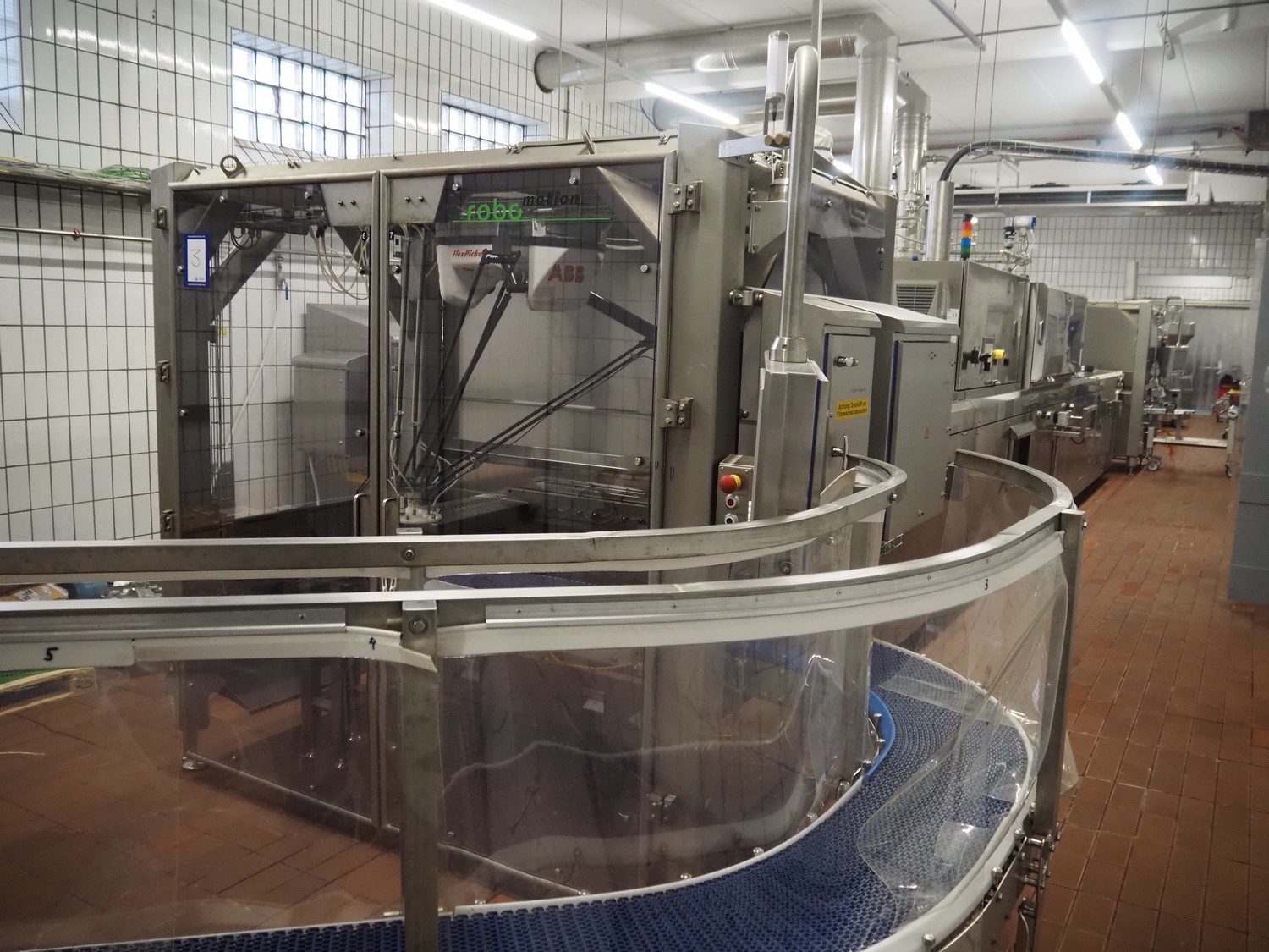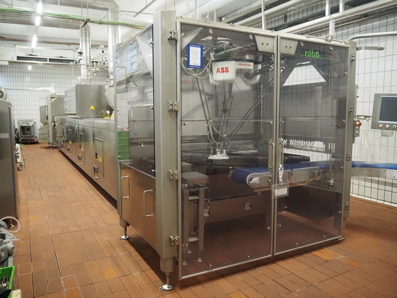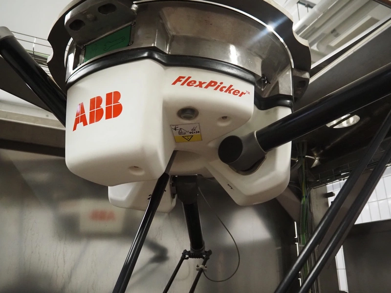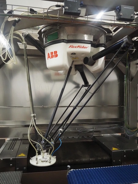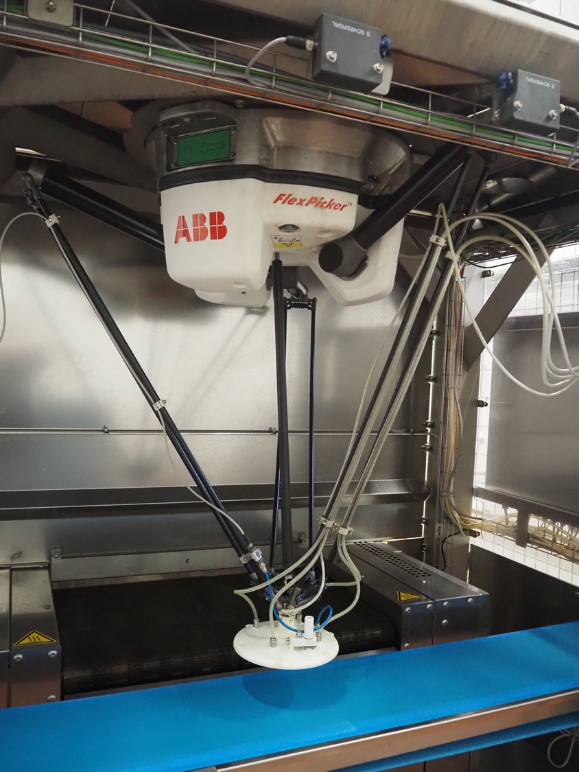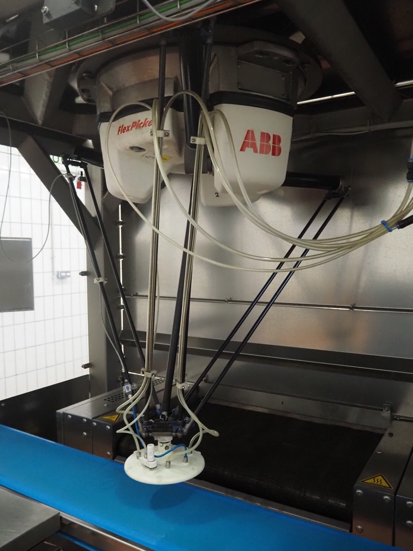 - (2x) Robomotion automatic dough placer with ABB pick and place robot, name: Tortilla-Handhabung, type: Delta-Robotanlage, serial number: 212417002, year of construction: 2012, 400 V, 3 Ph, 50 Hz, 10 A, 7 kW, diameter picker: 250 mm, total dimensions Robomotion: 3000 mm x 1640 mm x 2930 mm.