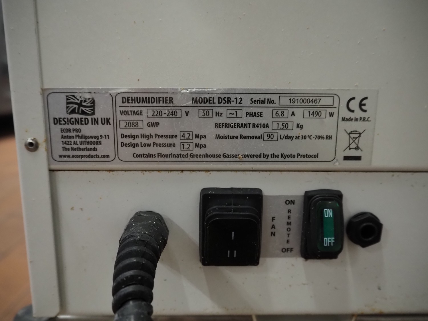 - Ecor Pro dehumidifier unit, model: DSR-12, serial number: 191000467, 220-240 V, 1 Ph, 50 Hz, 6.8 A, 1490 W, dimensions: 850 mm x 640 mm x 900 mm.
