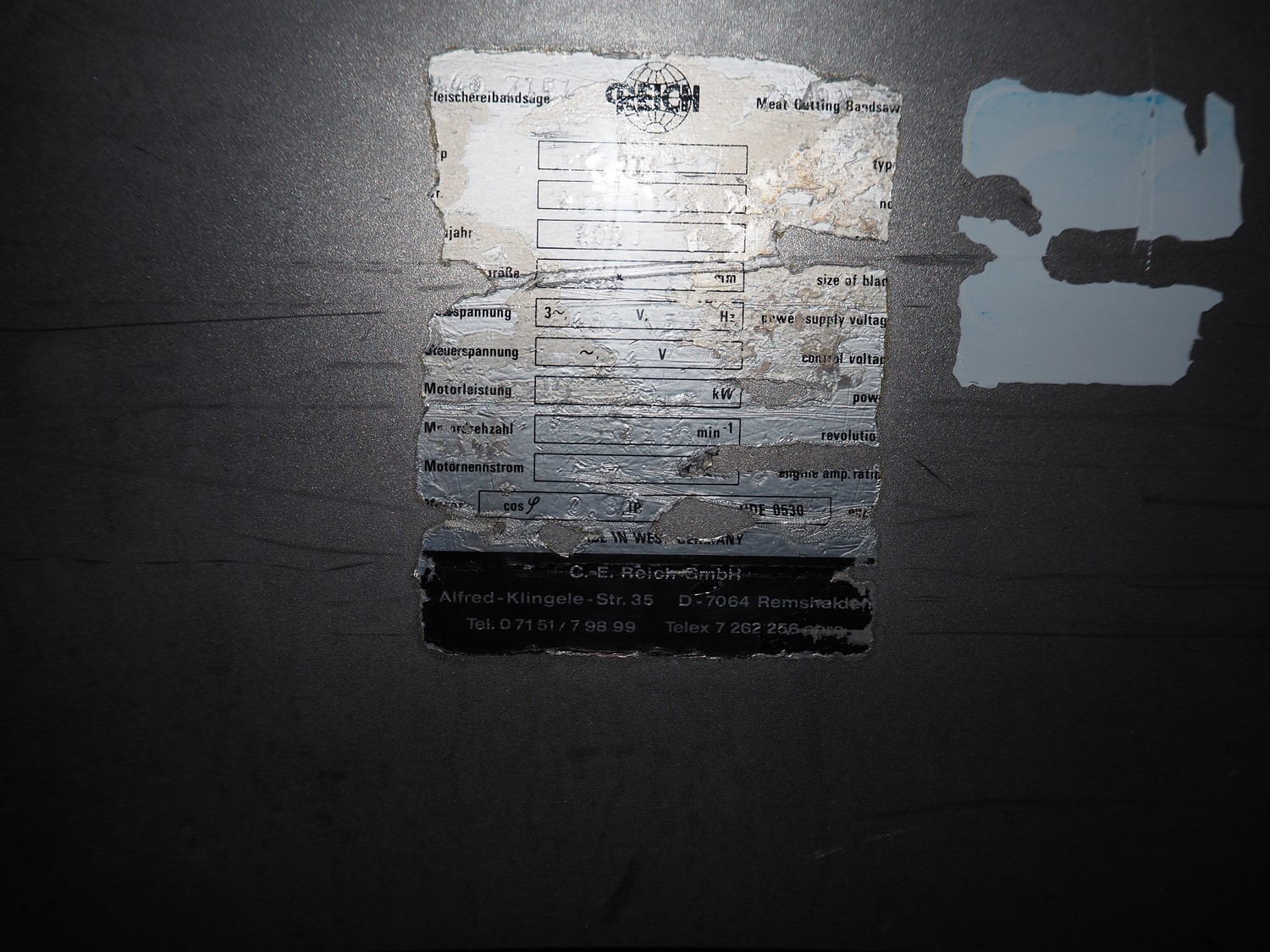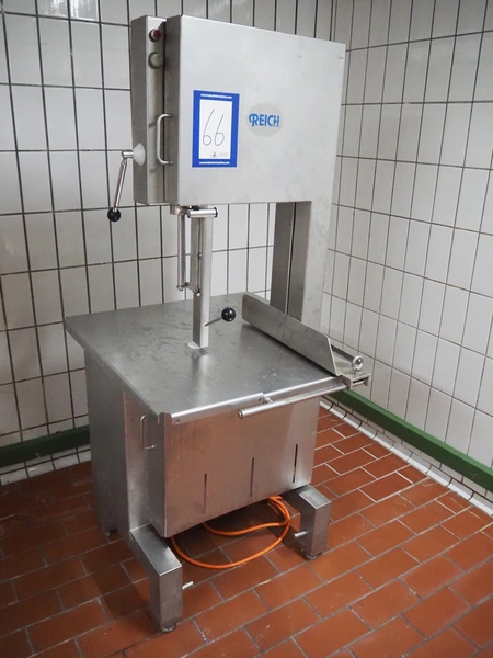 Reich bandsaw, type: Profi 400, year of construction: 2020, 400 V, 3 Ph, 50 Hz, 6.3 A, 2.2 kW, table: 830 mm x 680 mm, total dimensions: 830 mm x 790 mm x 1800 mm.