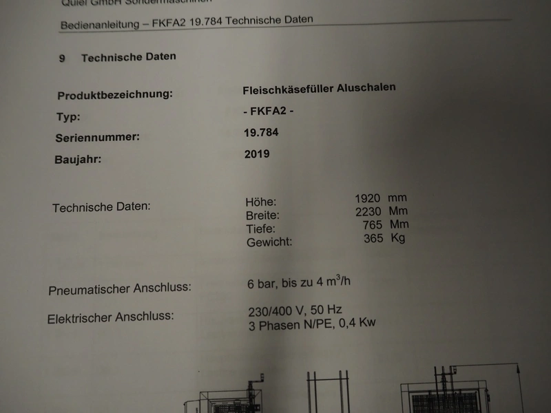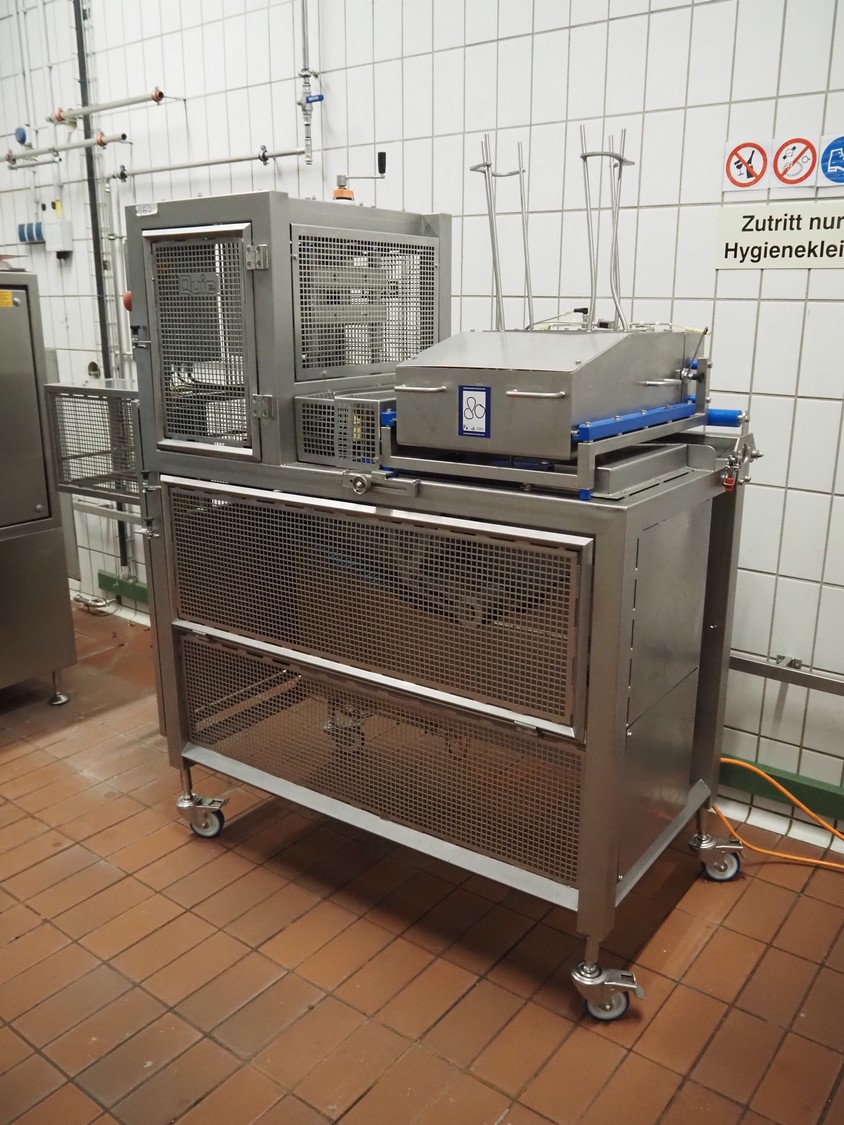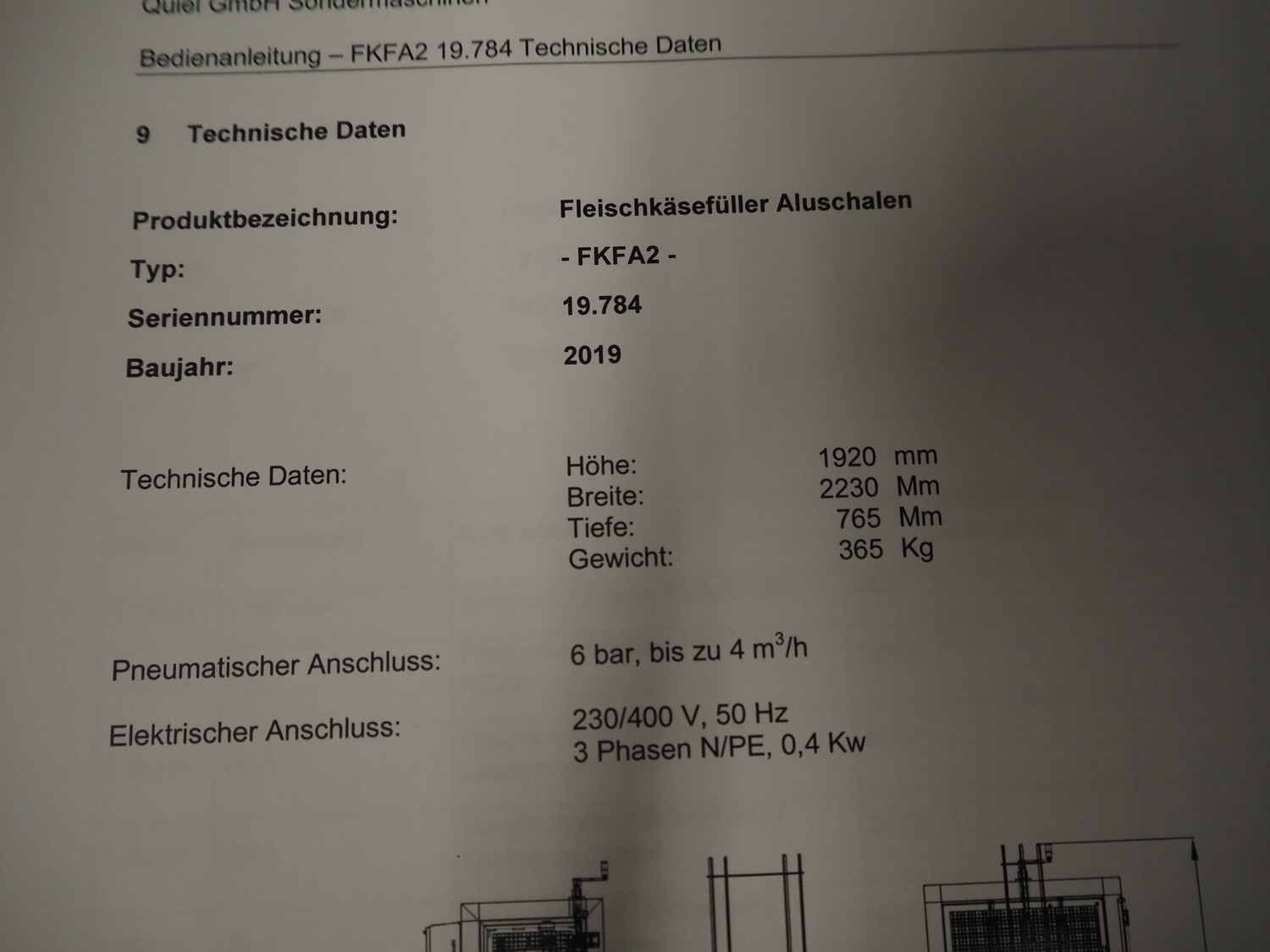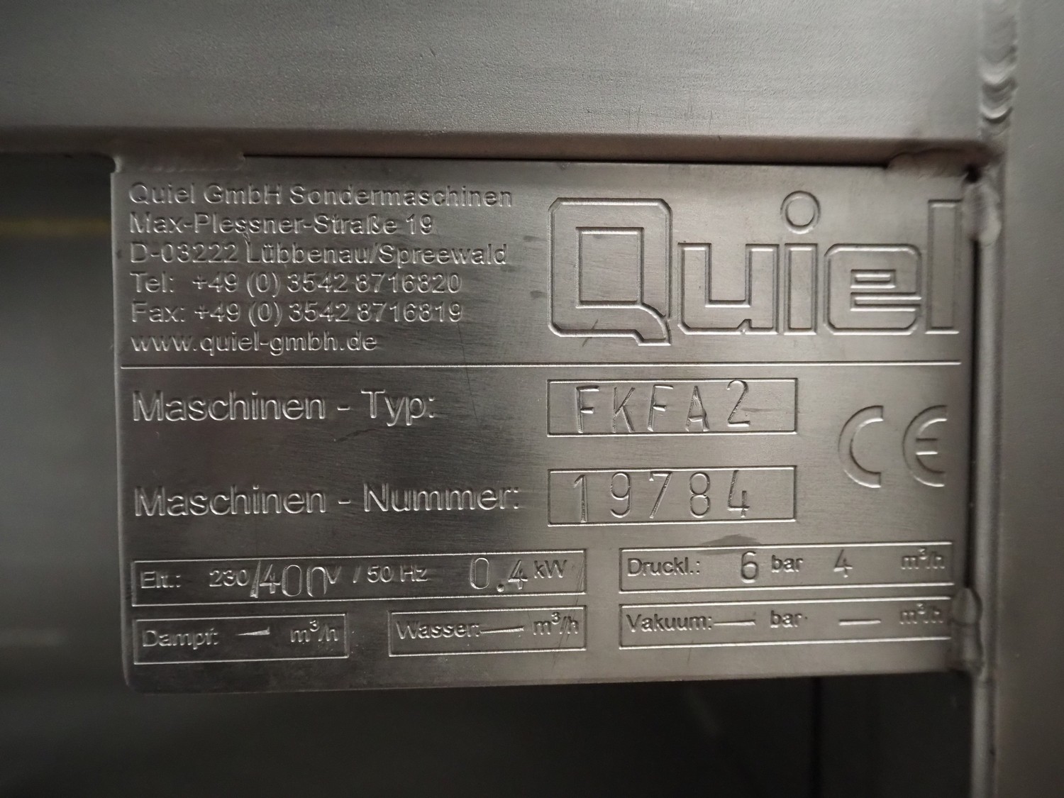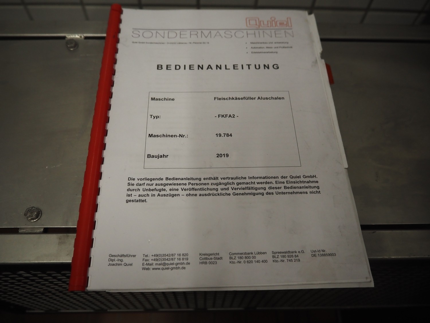 Quiel mobile tray filling machine with denester, type: FKFA2, serial number: 19784, year of construction: 2020, 400 V, 50 Hz, 0.4 kW, plastic belt with dividers, belt width: 115 mm, distance between dividers: 280 mm, divider height: 15 mm, s/s out feed rollers, roller width: 170 mm, total dimensions: 2200 mm x 750 mm x 1900 mm. Used for leber kase with trays for: 2000 gram, 1000 gram, 500 gram and 250 gram. With trolley, total dimensions: 1400 mm x 800 mm x 1200 mm.