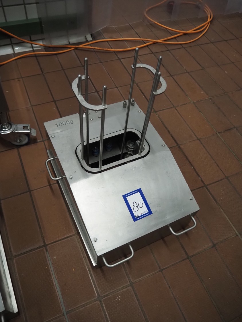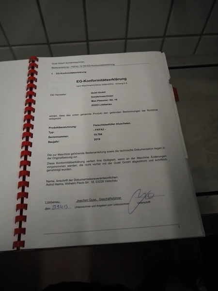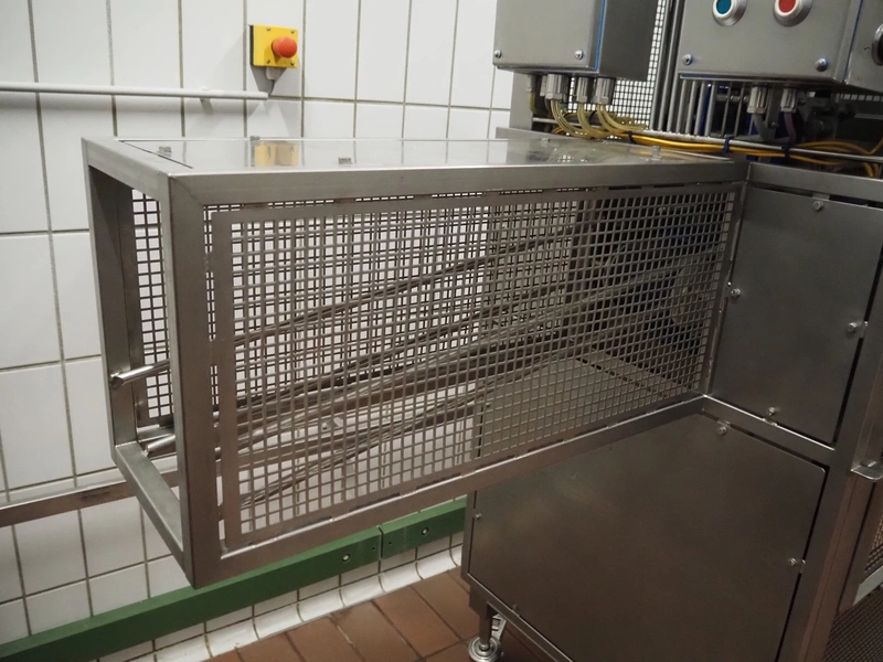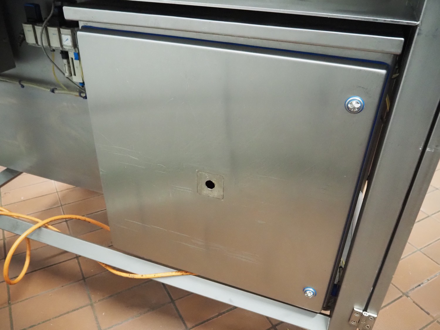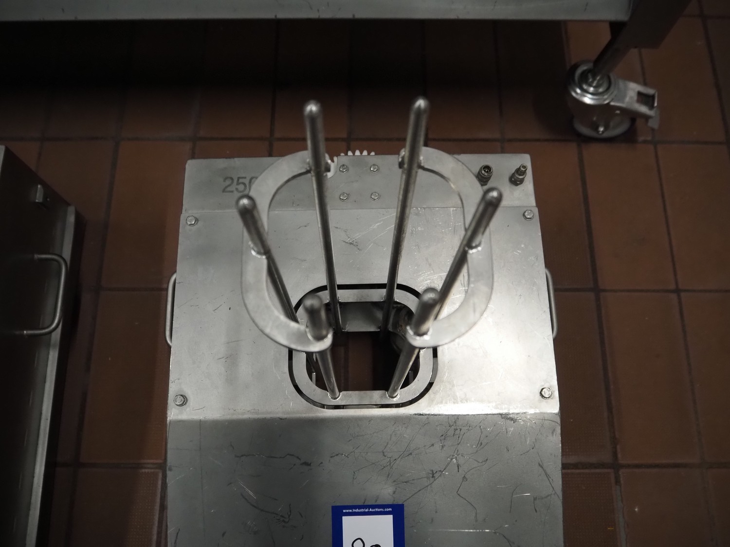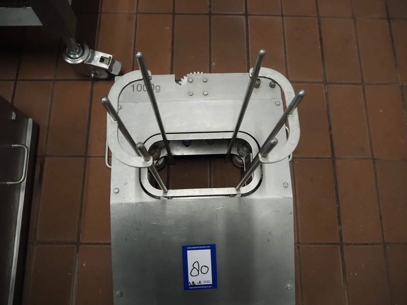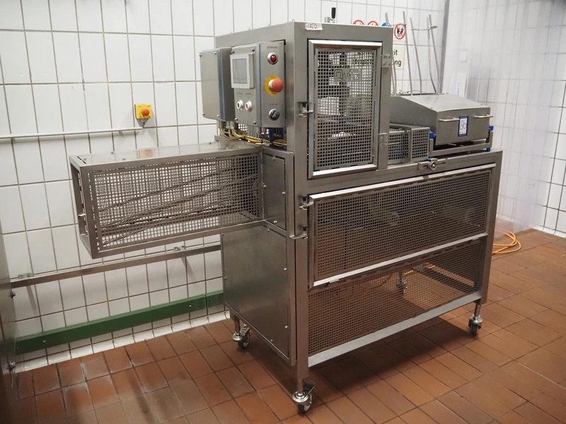 Quiel mobile tray filling machine with denester, type: FKFA2, serial number: 19784, year of construction: 2020, 400 V, 50 Hz, 0.4 kW, plastic belt with dividers, belt width: 115 mm, distance between dividers: 280 mm, divider height: 15 mm, s/s out feed rollers, roller width: 170 mm, total dimensions: 2200 mm x 750 mm x 1900 mm. Used for leber kase with trays for: 2000 gram, 1000 gram, 500 gram and 250 gram. With trolley, total dimensions: 1400 mm x 800 mm x 1200 mm.