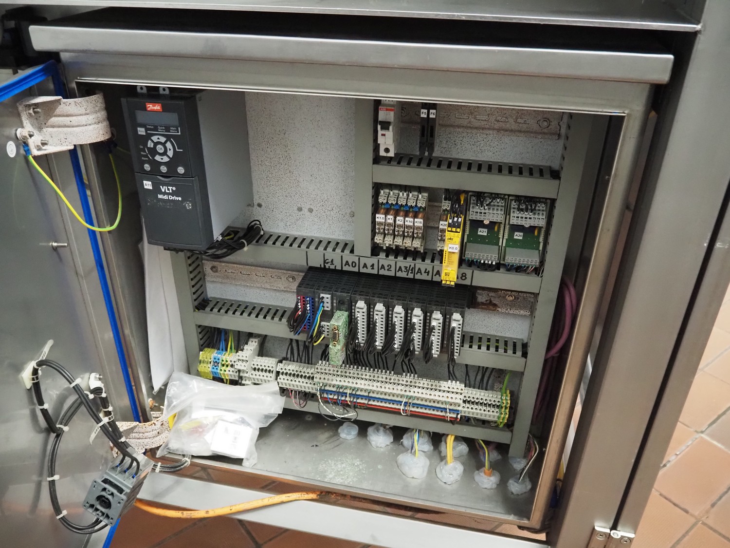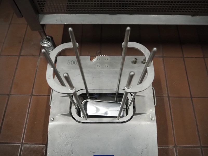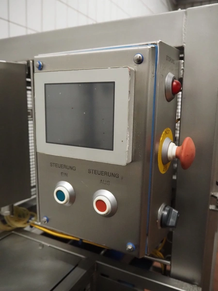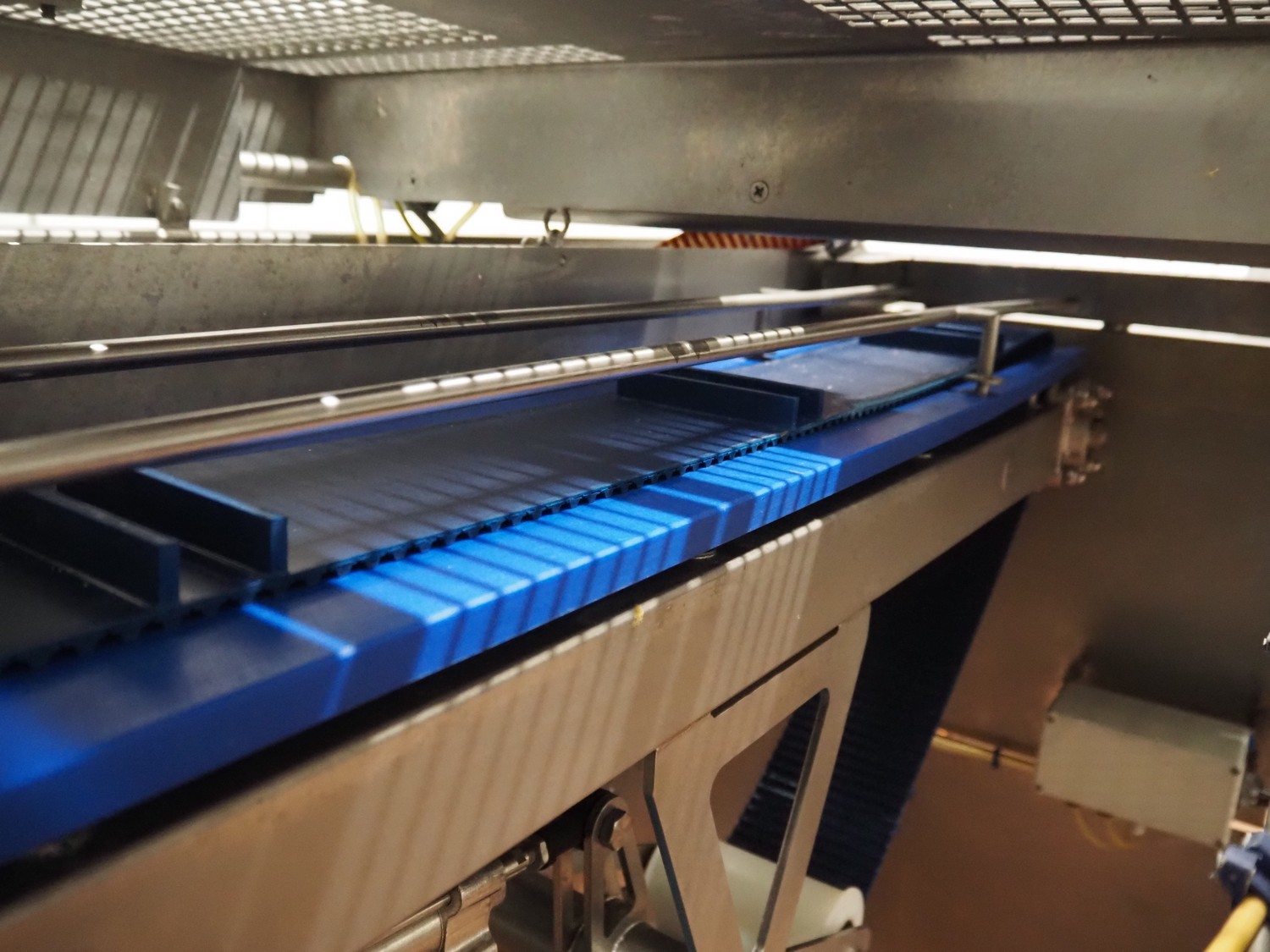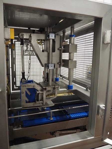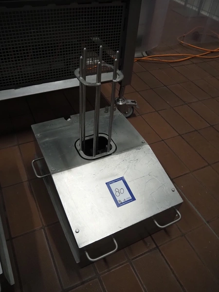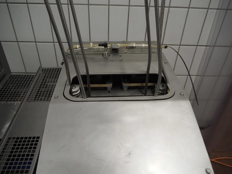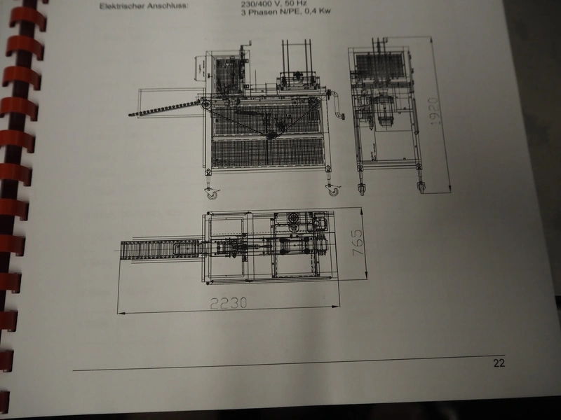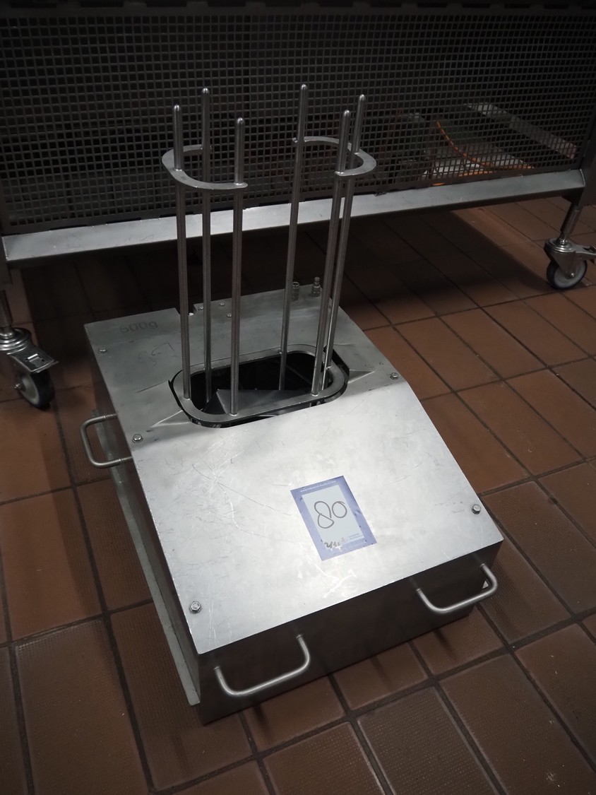Quiel mobile tray filling machine with denester, type: FKFA2, serial number: 19784, year of construction: 2020, 400 V, 50 Hz, 0.4 kW, plastic belt with dividers, belt width: 115 mm, distance between dividers: 280 mm, divider height: 15 mm, s/s out feed rollers, roller width: 170 mm, total dimensions: 2200 mm x 750 mm x 1900 mm. Used for leber kase with trays for: 2000 gram, 1000 gram, 500 gram and 250 gram. With trolley, total dimensions: 1400 mm x 800 mm x 1200 mm.