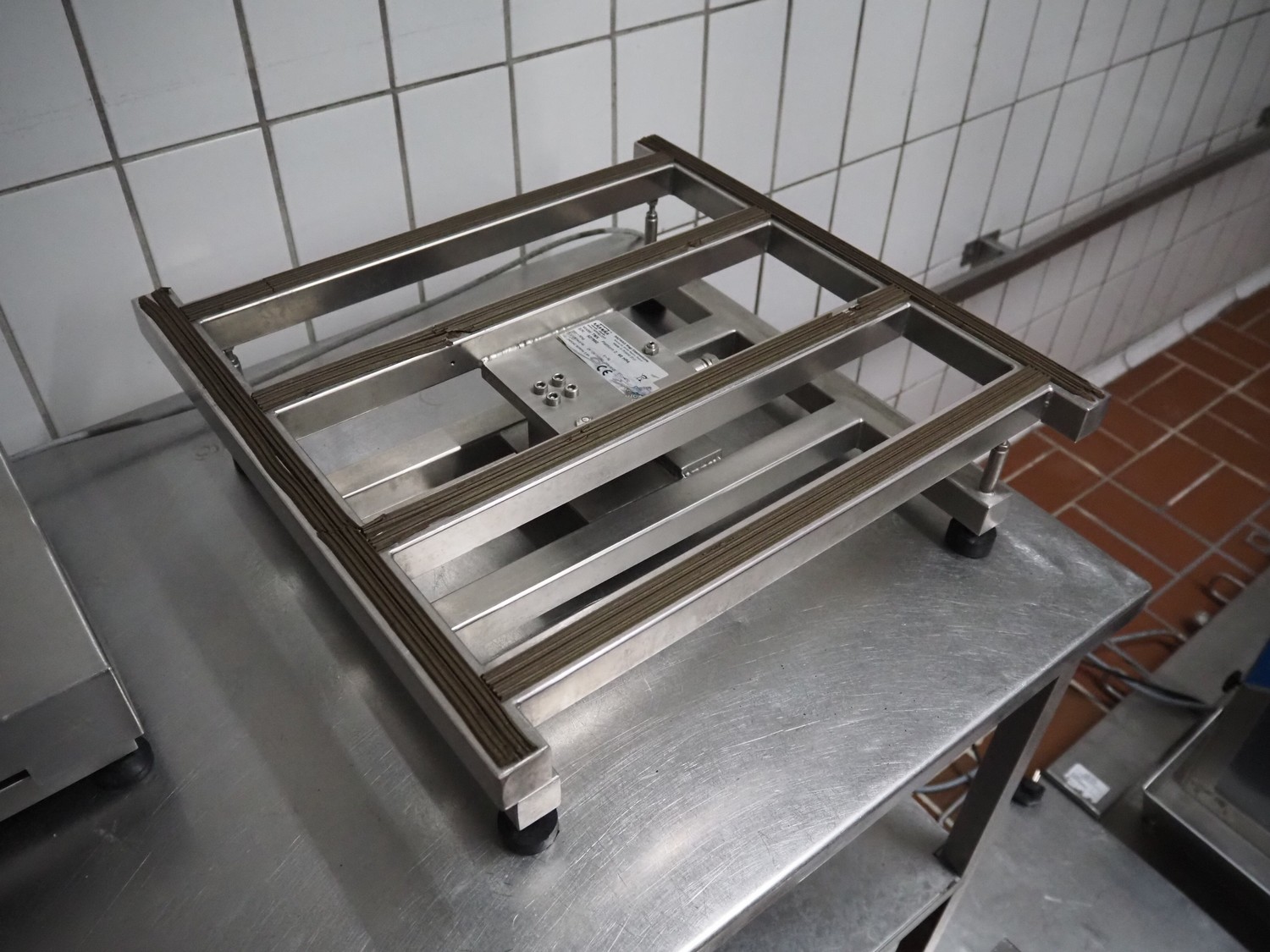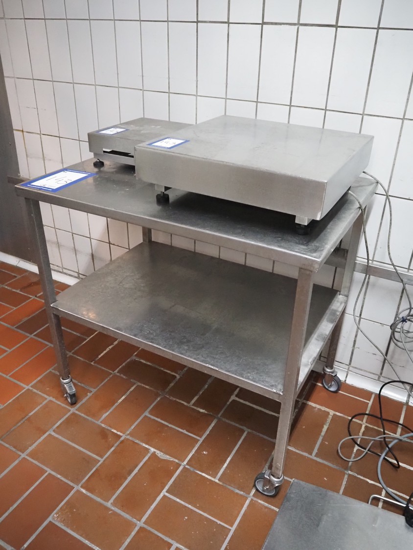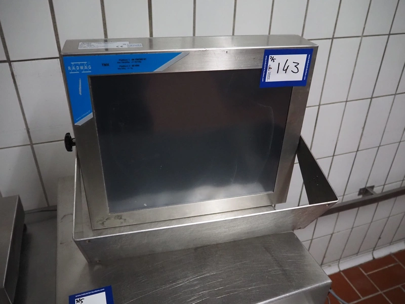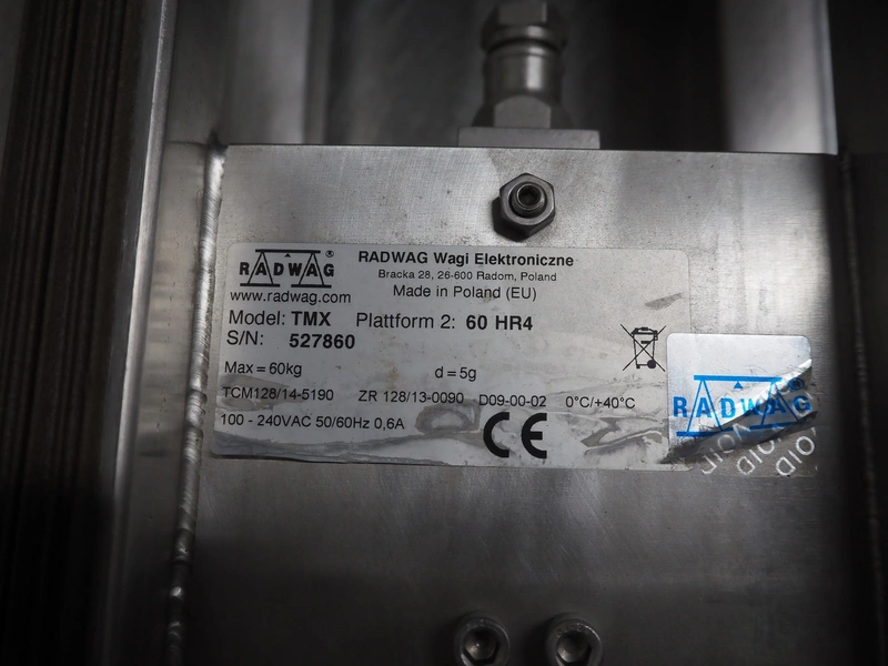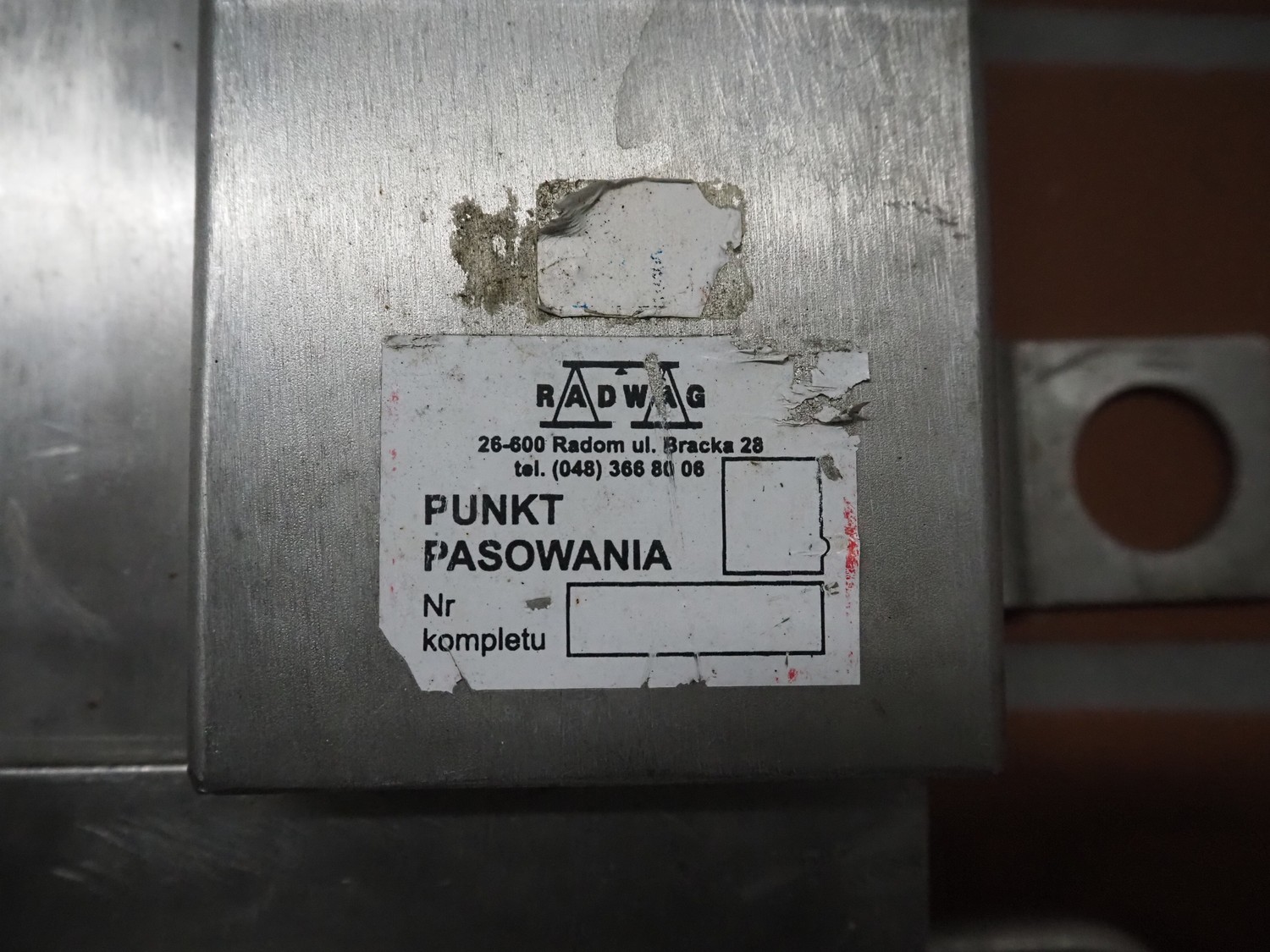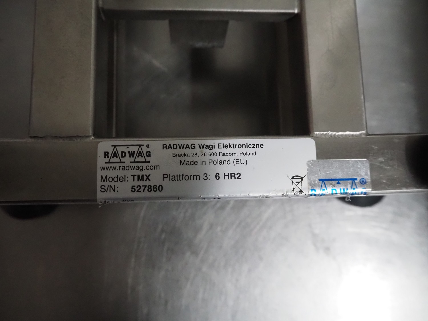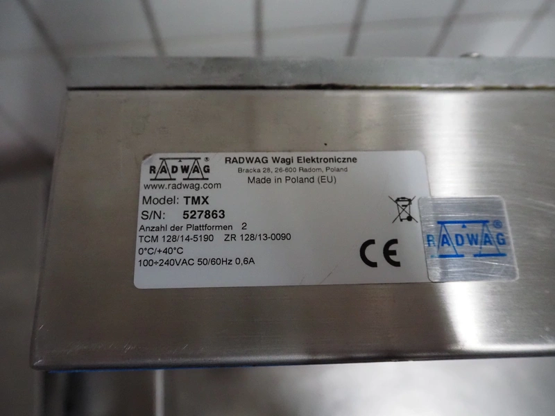 Radwag weighing scales with indicator, indicator model: TMX, serial number: 527863, 100/240 V, 50/60 Hz, 0.6 A, floor weighing scale dimensions: 860 mm x 840 mm, total dimensions floor weighing scale: 1700 mm x 1150 mm x 80 mm, Radwag weighing scale: model: TMX, serial number: 527860, Fintec weighing cell, type: PC6-10kg C3-s, serial number: 12777069, scale dimensions: 300 mm x 250 mm. Radwag weighing scale, model: TMX, serial number: 527860, Flintec weighing cell, type: PC6-100kg C3-s, serial number: 11240903, scale dimensions: 500 mm x 500 mm, dimensions s/s trolley: 950 mm x 650 mm x 1430 mm.