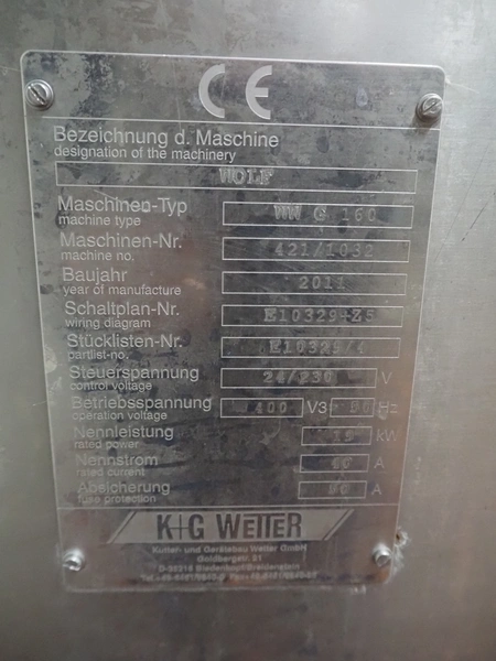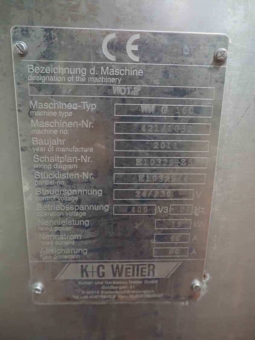 K+G Wetter grinder, type: WW G 160, machine number: 421/1032, year of construction: 2011, 230/400 V, 3 Ph, 50 Hz, 41/50 A, 19 kW, diameter plate: 160 mm, total dimensions: 1120 mm x 1400 mm x 1360 mm.