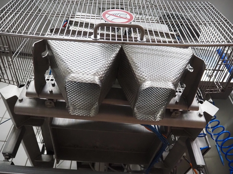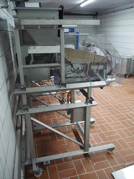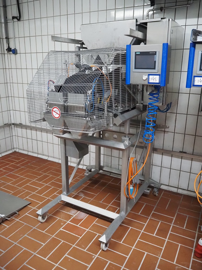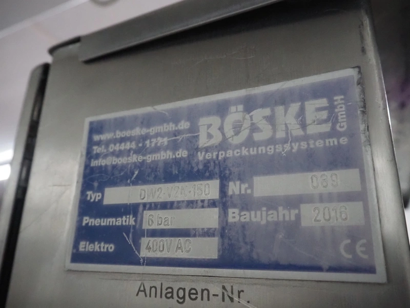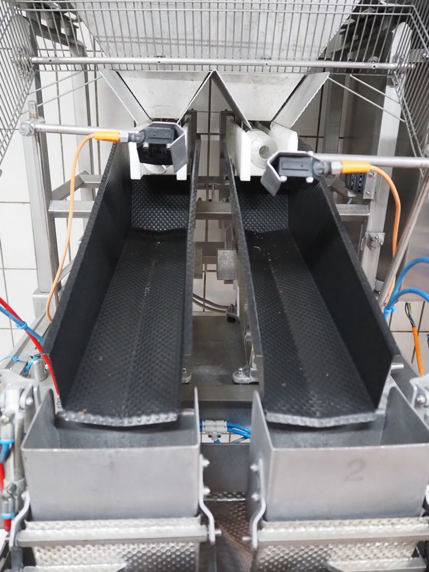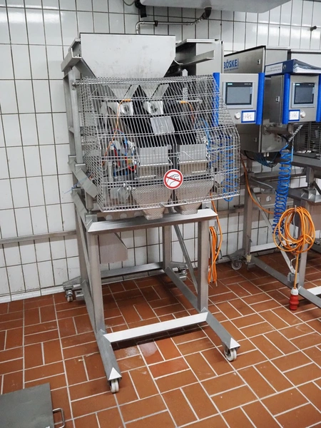 Böske GmbH mobile dual head weigher, type: DW2-V2N-150, number: 089, year of construction: 2016, 400 V, 6 bar, infeed clearance: 620 mm x 400 mm, diameter screw: 60 mm, vibrating gutter length: 550 mm, gutter width: 120 mm, basket dimensions: (2x) 145 mm x 90 mm x 170 mm, total dimensions: 1380 mm x 1150 mm x 2050 mm.