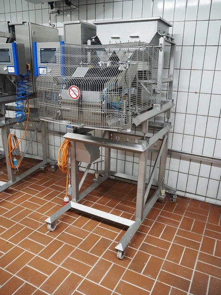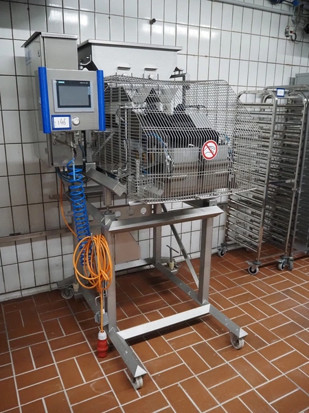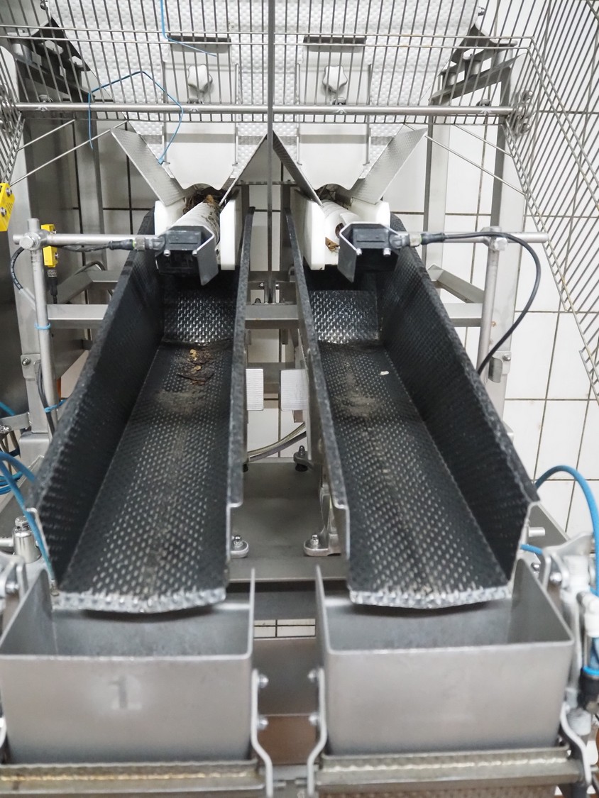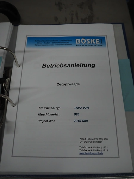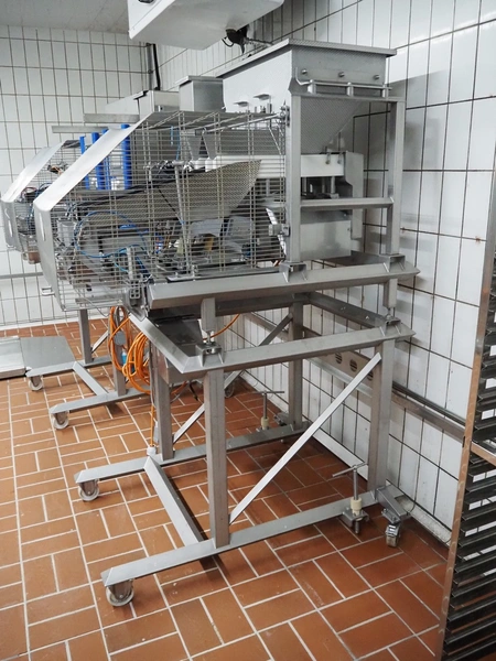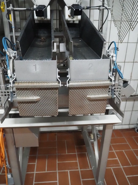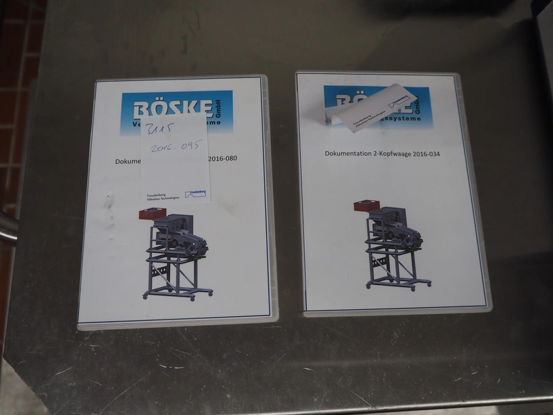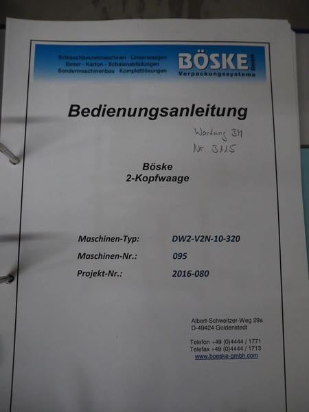 Böske GmbH mobile dual head weigher, type: DW2-V2N-10-320, number: 095, year of construction: 2016, 400 V, 6 bar, infeed clearance: 620 mm x 400 mm, diameter screw: 60 mm, vibrating gutter length: 550 mm, gutter width: 120 mm, basket dimensions: (2x) 145 mm x 90 mm x 170 mm, total dimensions: 1380 mm x 1150 mm x 2050 mm.