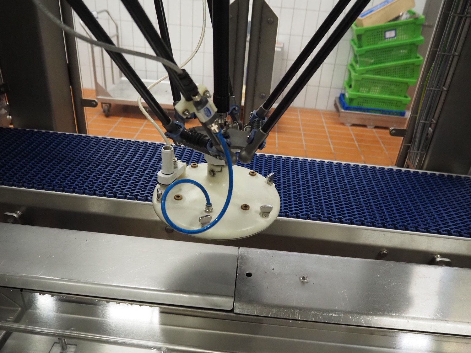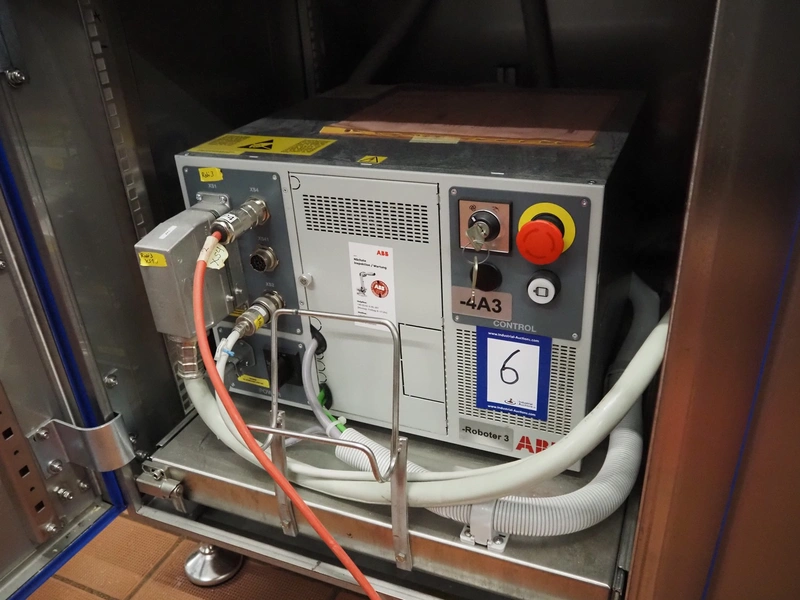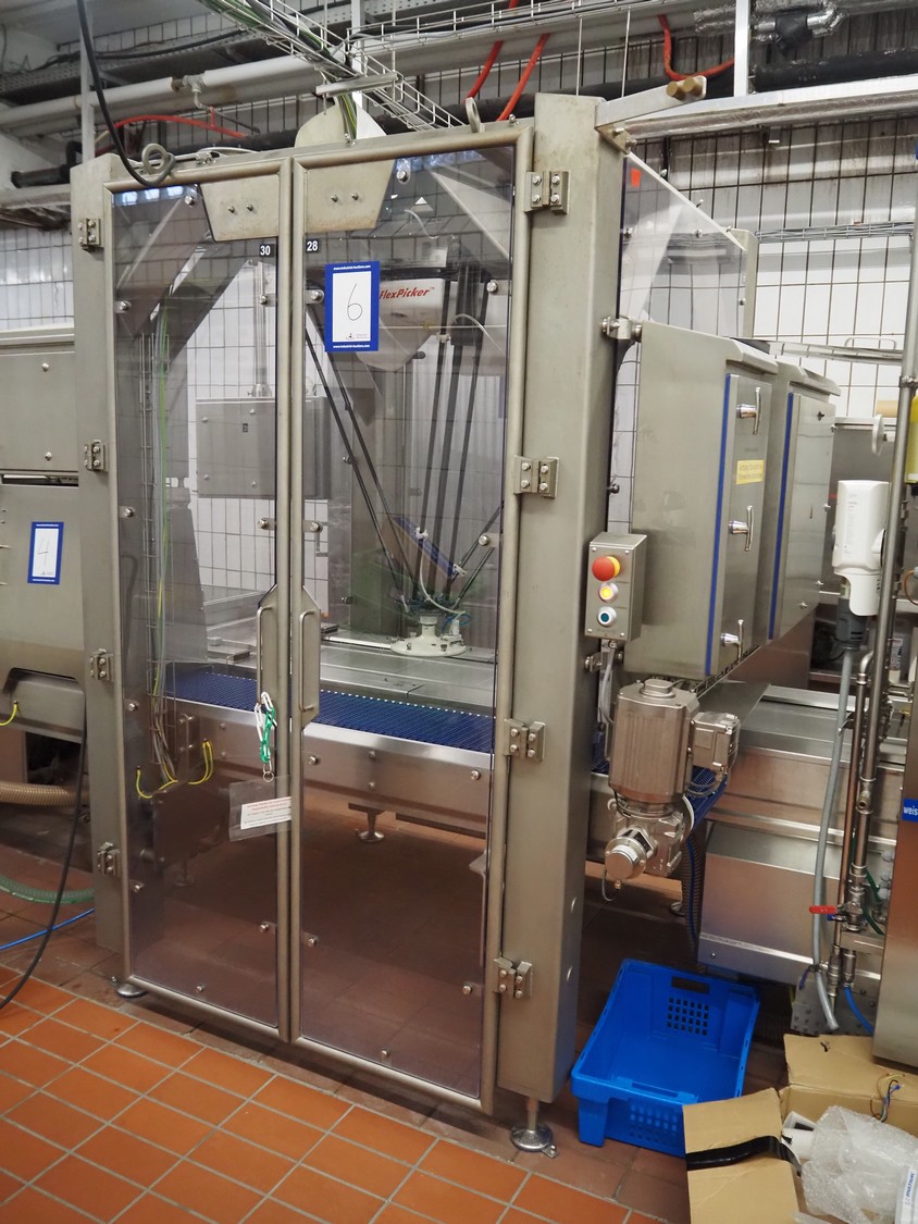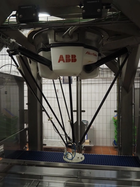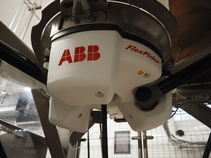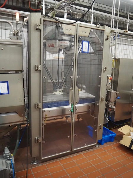 Robomotion automatic dough placer with ABB pick and place robot, diameter picker: 230 mm, total dimensions: 1700 mm x 2000 mm x 2700 mm.