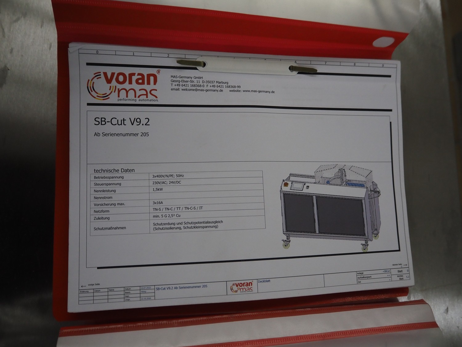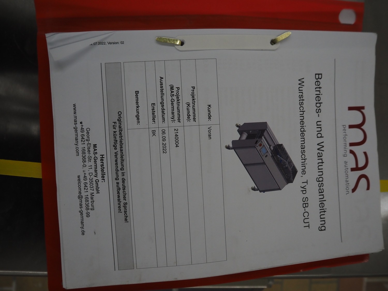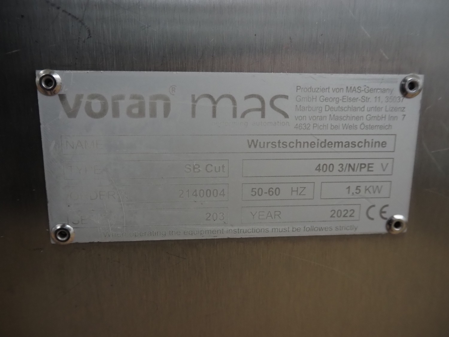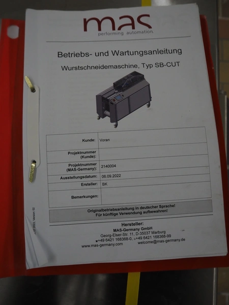 Voran / MAS-Germany GmbH sausage cutter, type: SB Cut, series: 203, order number: 2140004, year of construction: 2022, 400 V, 3 Ph, 50-60 Hz, 1.5 kW, dimensions: 1655 mm x 750 mm x 1440 mm.