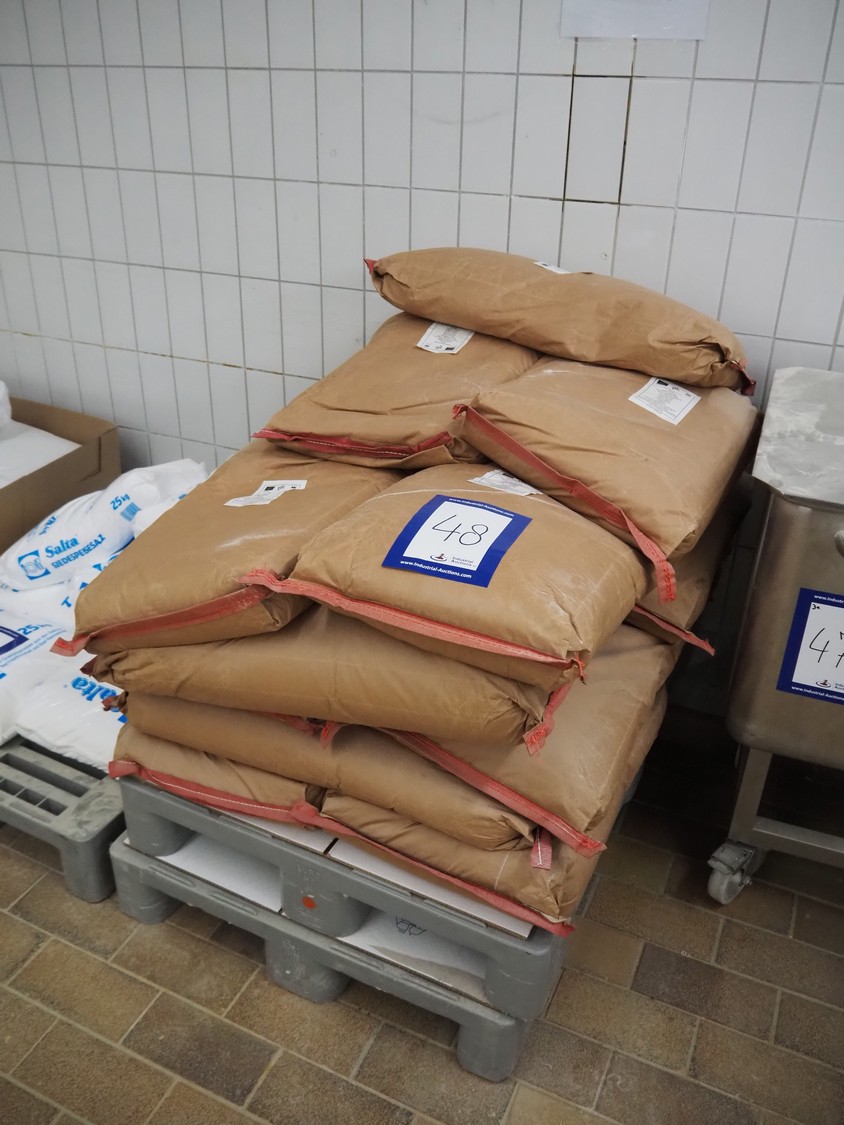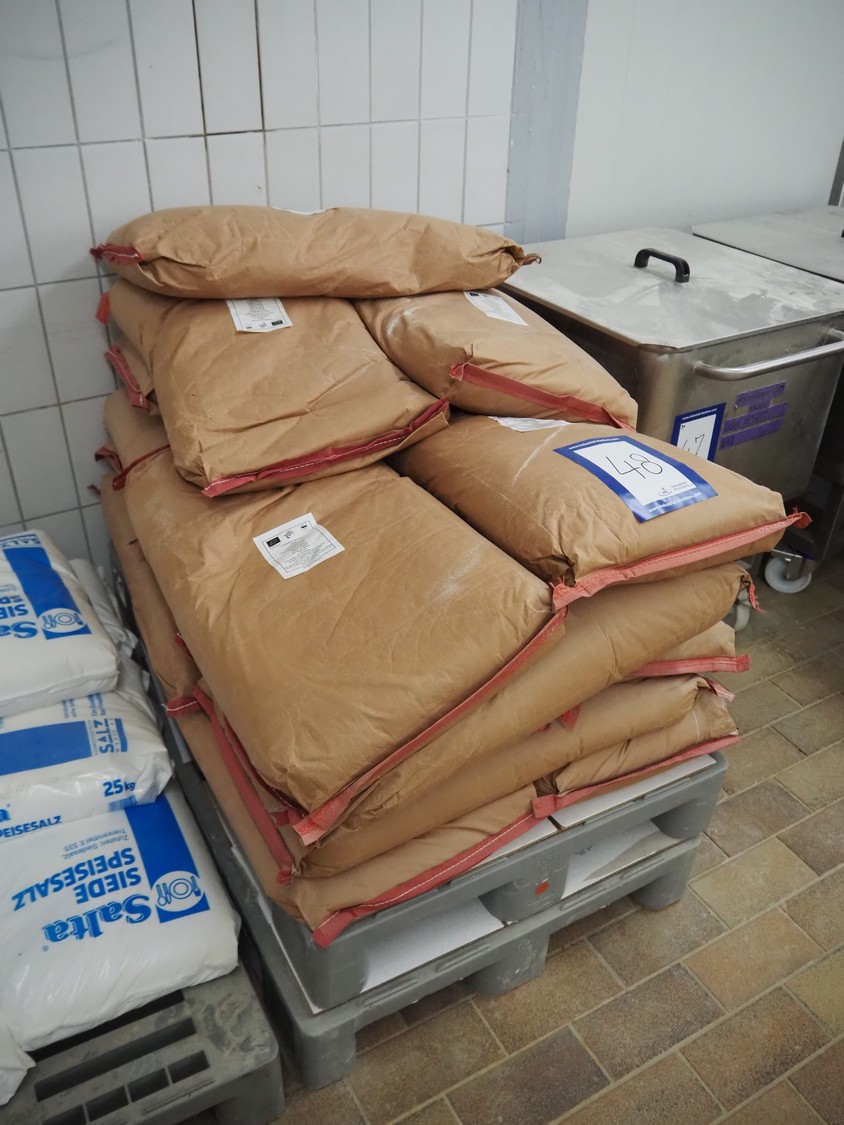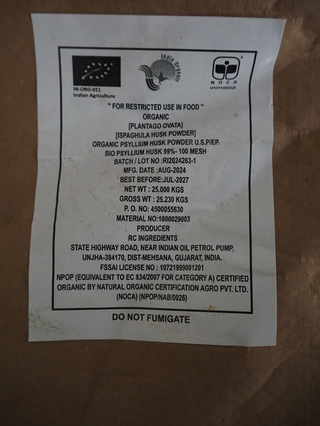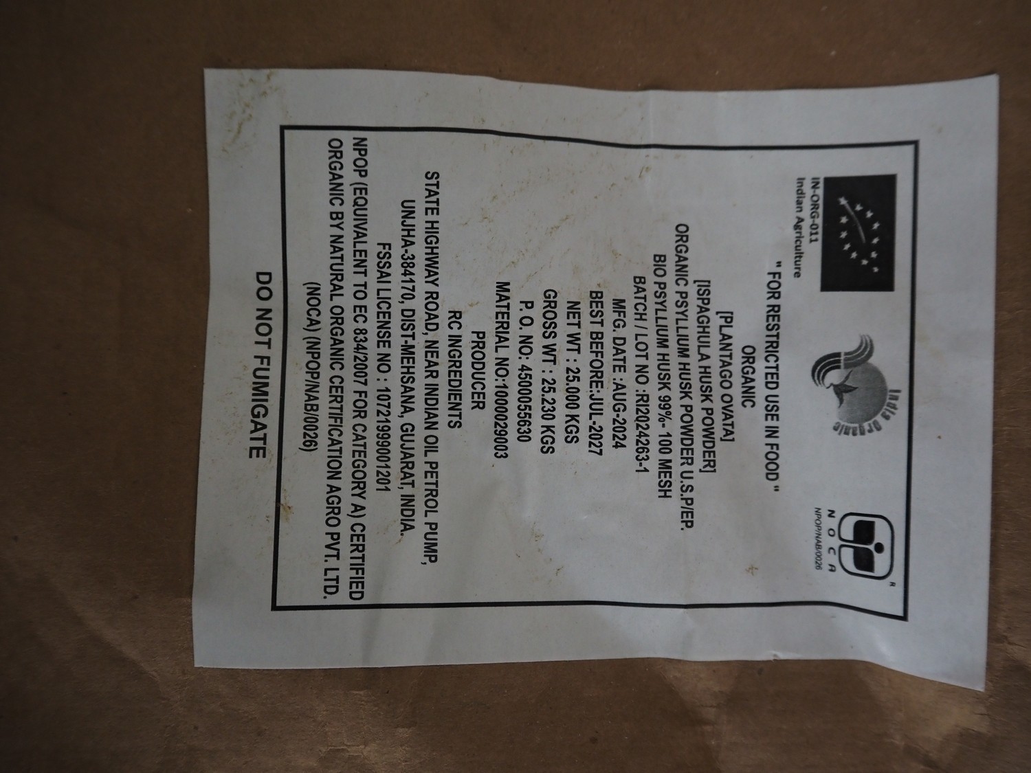 Pallet with 18 bags with India Organic psyllium husk powder, manufacturing date: August 2024, best used before: July 2027, each bag: 25 kg, total dimensions: 1200 mm x 800 mm x 500 mm.