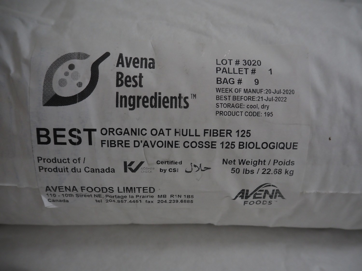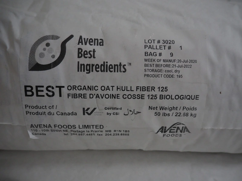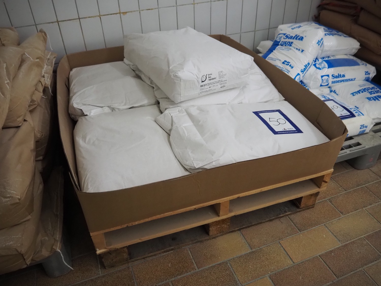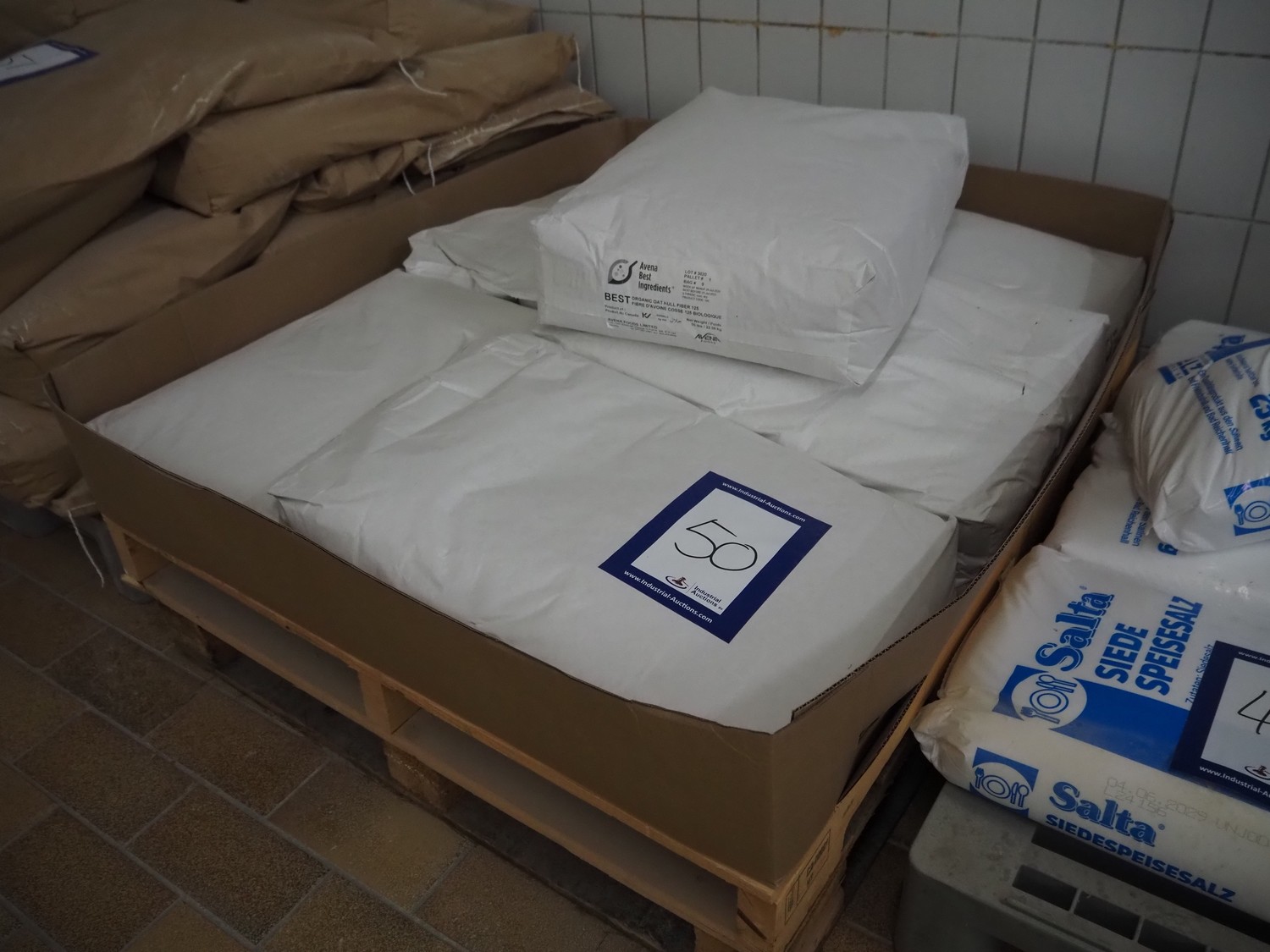 pallet with 6 bags Avena Best Ingredients organic hull fiber 125, each bag: 22.68 kg, total dimensions: 1300 mm x 1100 mm x 950 mm.
