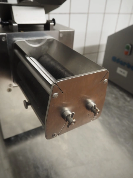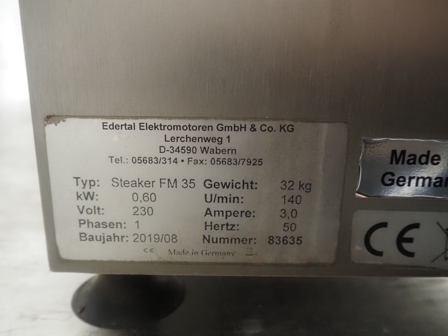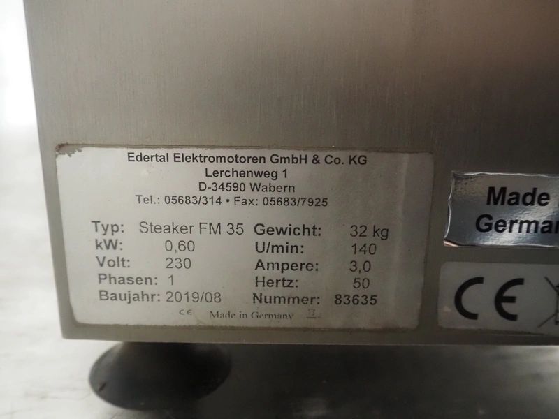 Eadertal Elektromotoren GmbH & Co. KG tenderizer, type: Steaker FM 35, number: 83635, year of construction: 2019/08, 230 V, 1 Ph, 50 Hz, 3.0 A, 0.60 kW, weight: 32 kg, infeed clearance: 200 mm x 35 mm, working width: 170 mm, distance between knives: 3 mm, total dimensions: 570 mm x 240 mm x 500 mm.