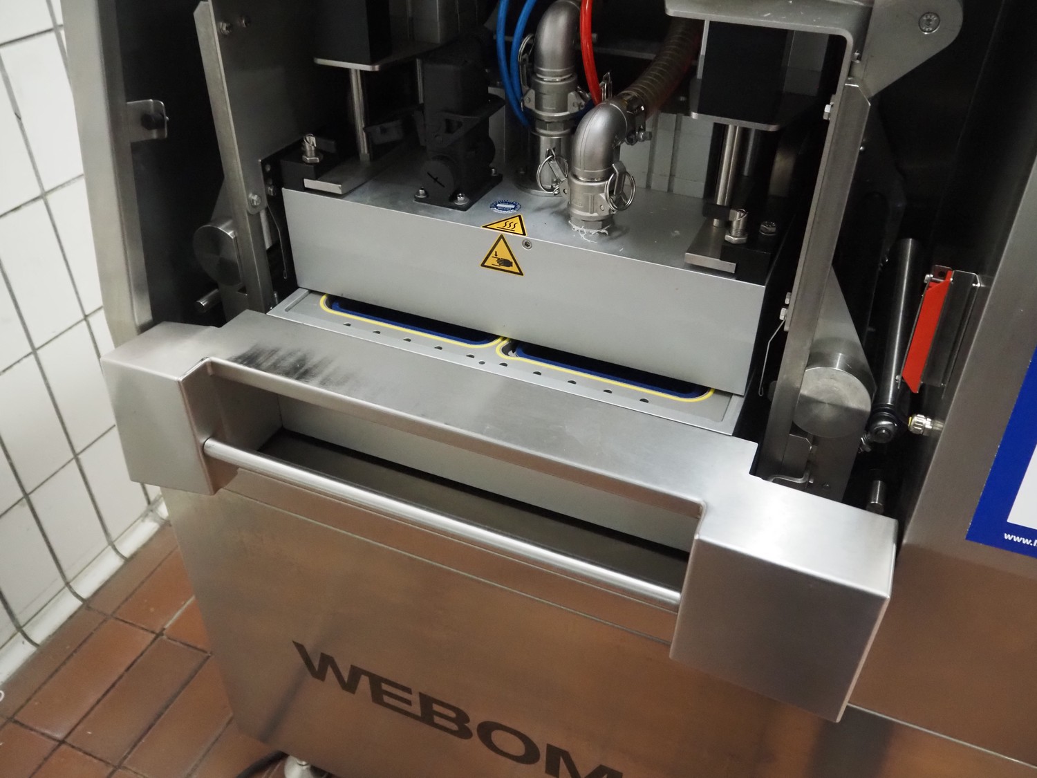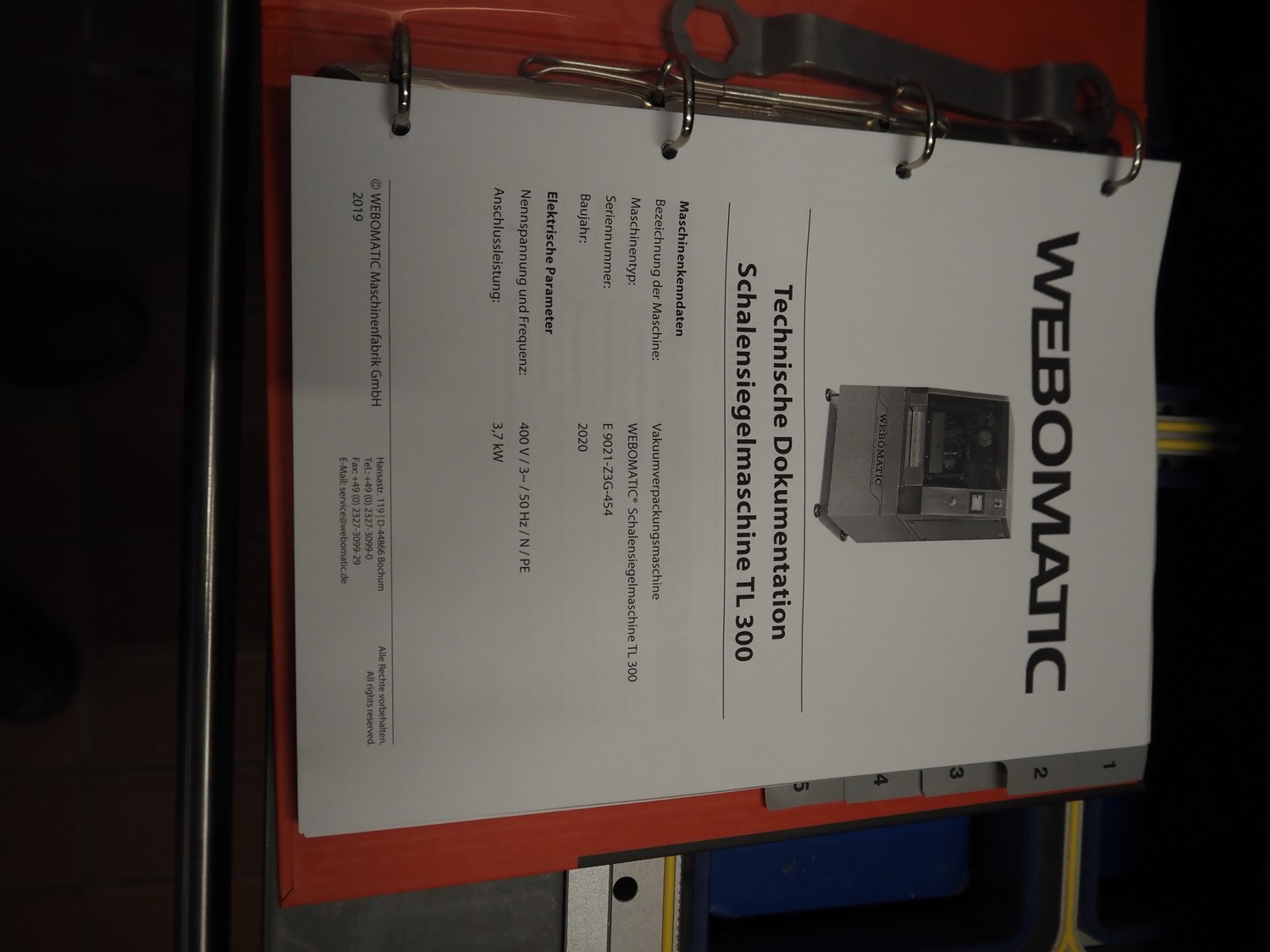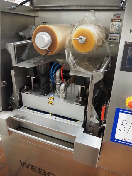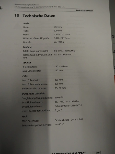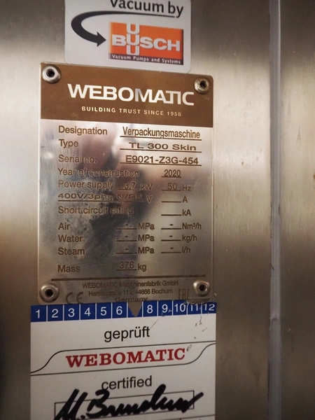 Webomatic mobile traysealer, type: TL300 Skin, serial number: E9021-Z3G-454, year of construction: 2020, 400 V, 3 Ph, 50 Hz, 3.7 kW, machine weight: 376 kg, dyes: (4x) 175 mm x 130 mm, Busch vacuum pump, type: RA 0100 F 503, serial number: DEM120091433, capacity: 100 m³/per hour, total dimensions: 1000 mm x 800 mm x 1630 mm.