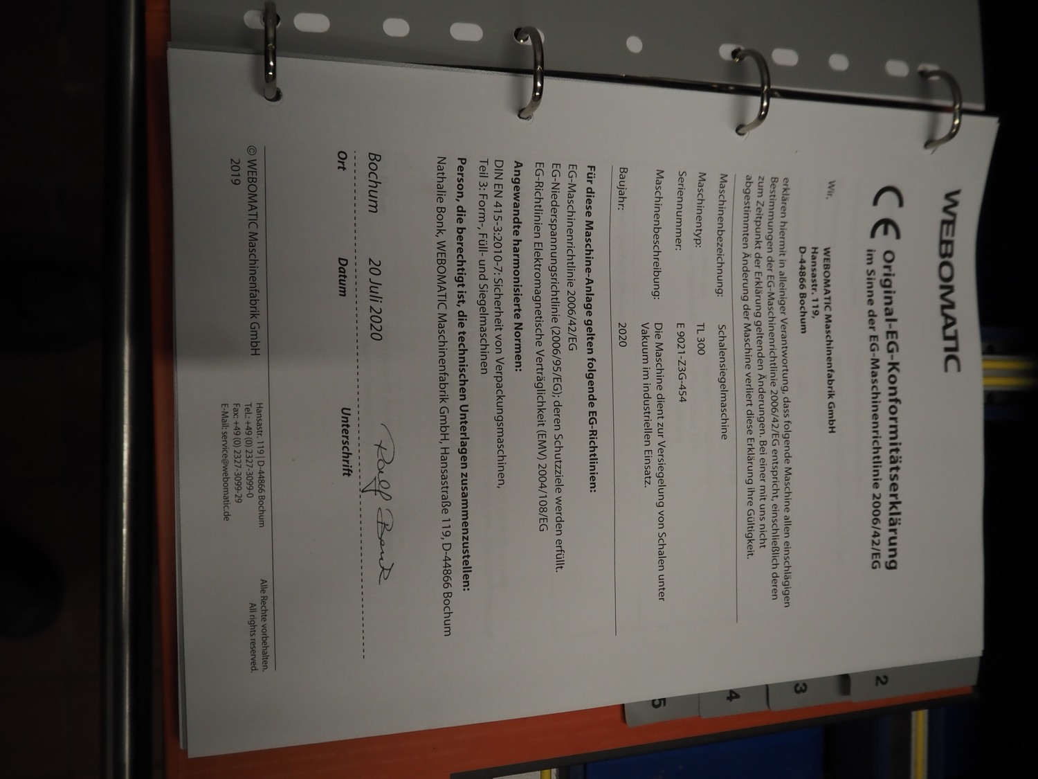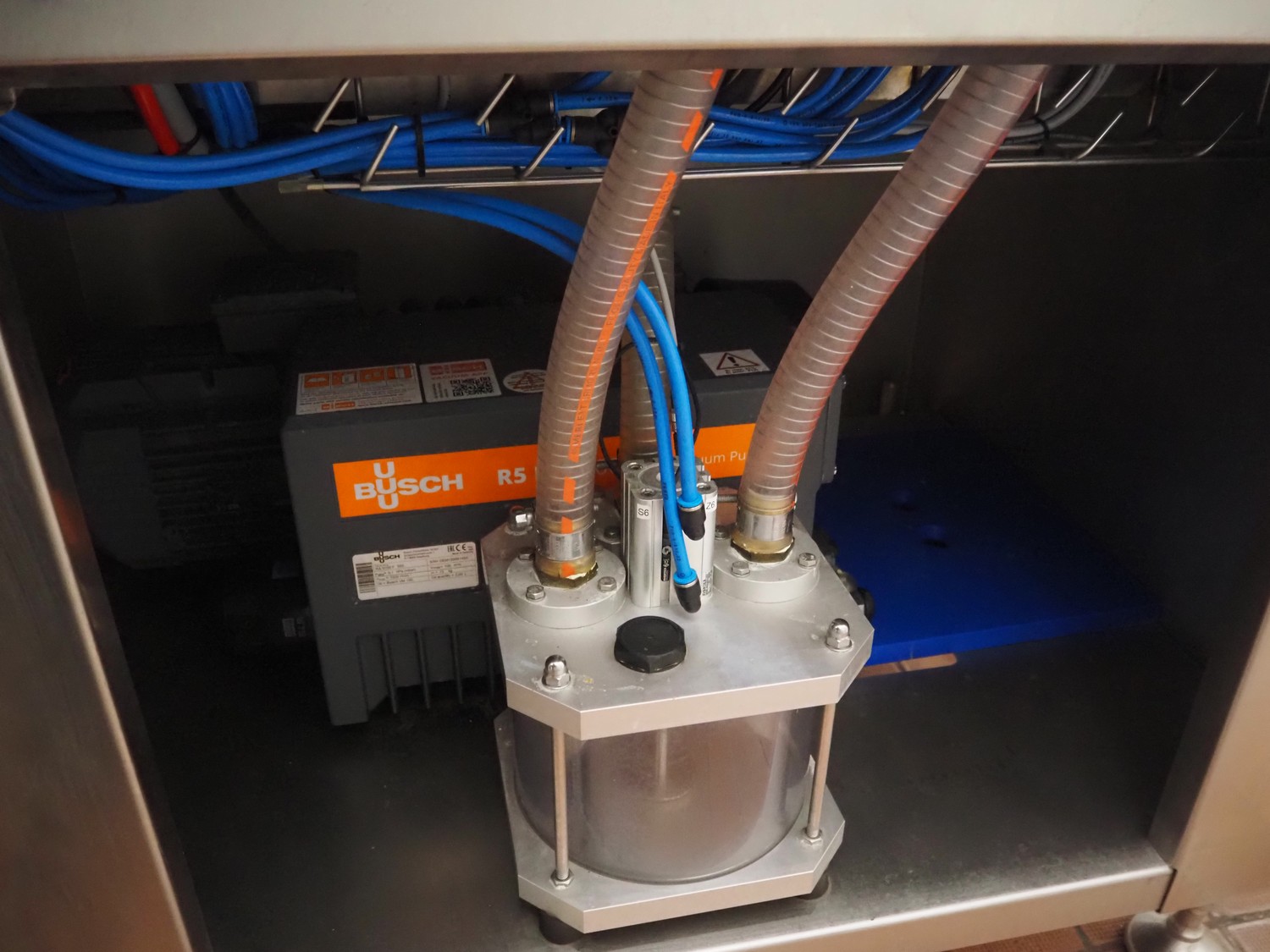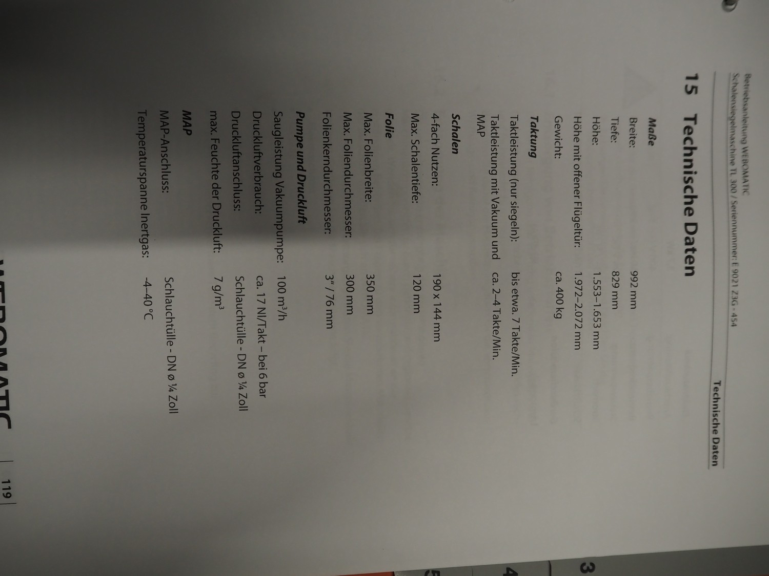 Webomatic mobile traysealer, type: TL300 Skin, serial number: E9021-Z3G-454, year of construction: 2020, 400 V, 3 Ph, 50 Hz, 3.7 kW, machine weight: 376 kg, dyes: (4x) 175 mm x 130 mm, Busch vacuum pump, type: RA 0100 F 503, serial number: DEM120091433, capacity: 100 m³/per hour, total dimensions: 1000 mm x 800 mm x 1630 mm.