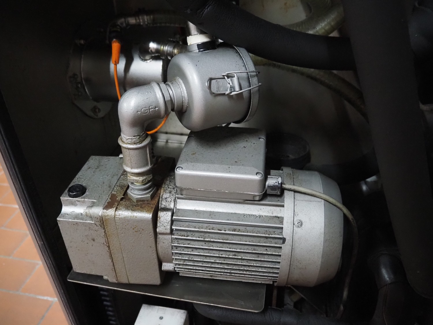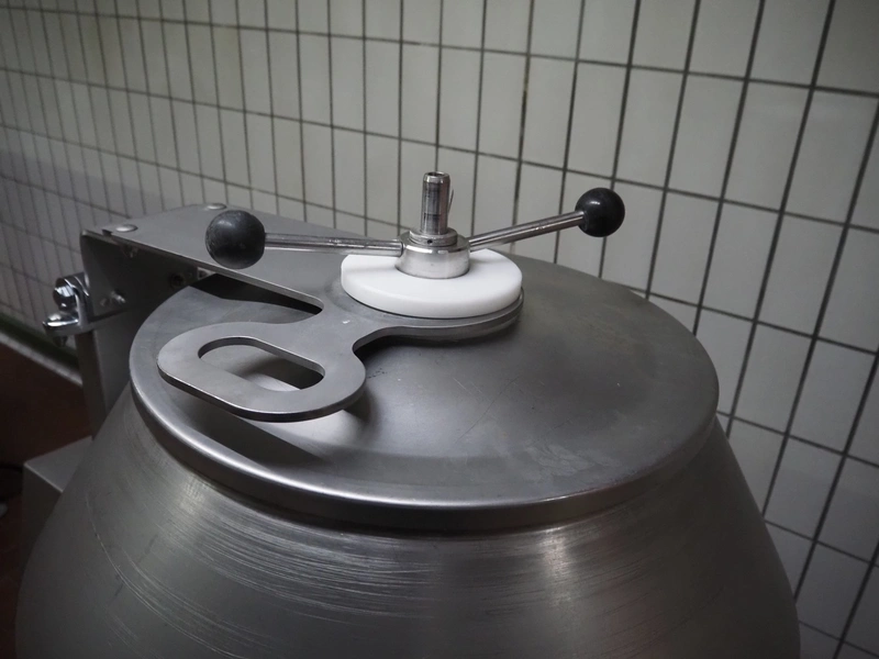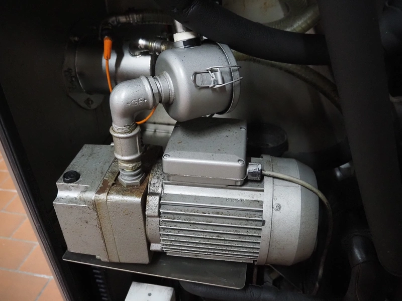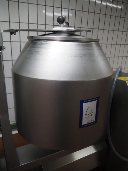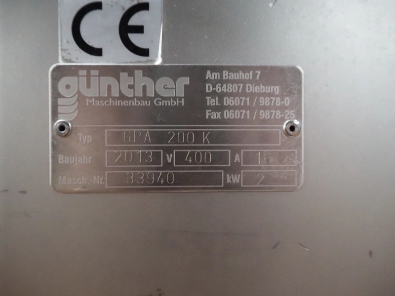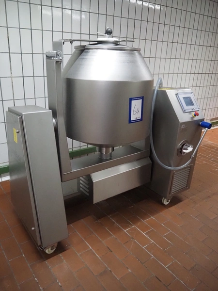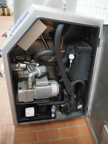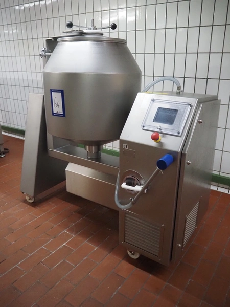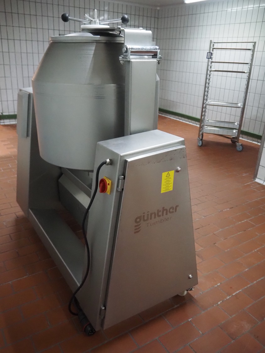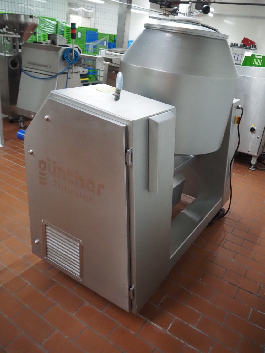 Günther mobile double jacketed cooled vacuum tumbler, type: GPA 200K, machine number: 33940, year of construction: 2013, 400 V, 15 A, 2 kW, volume: 200 liter, vacuum pump, total dimensions: 1830 mm x 900 mm x 1750 mm.