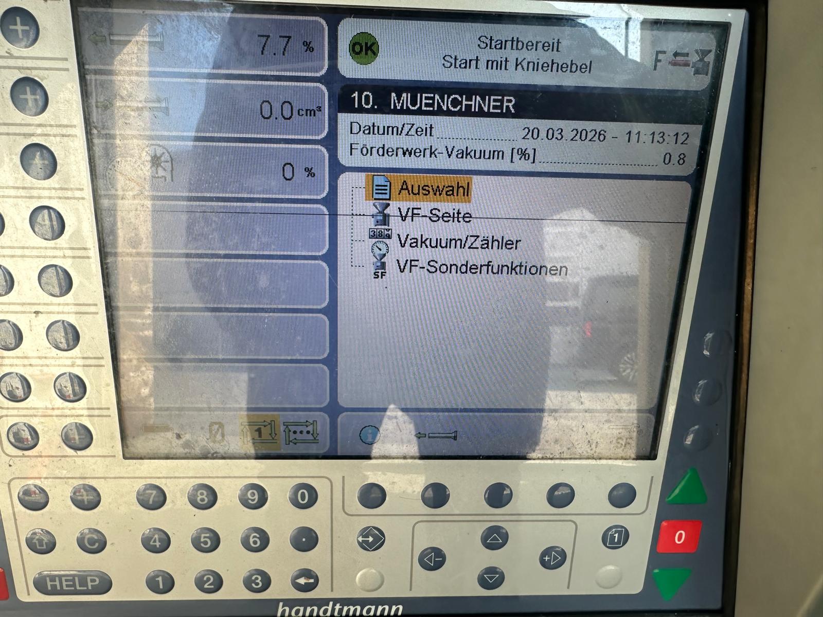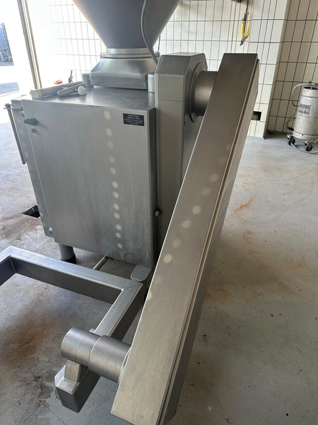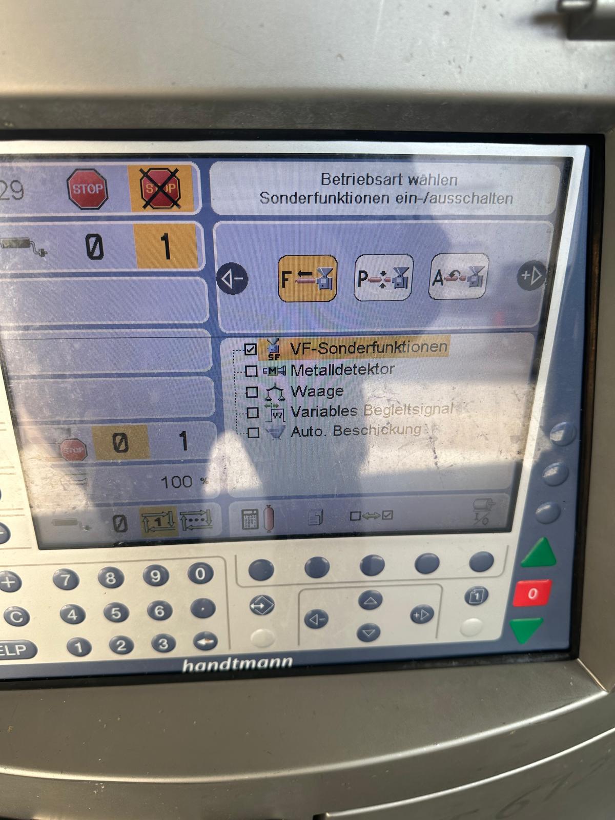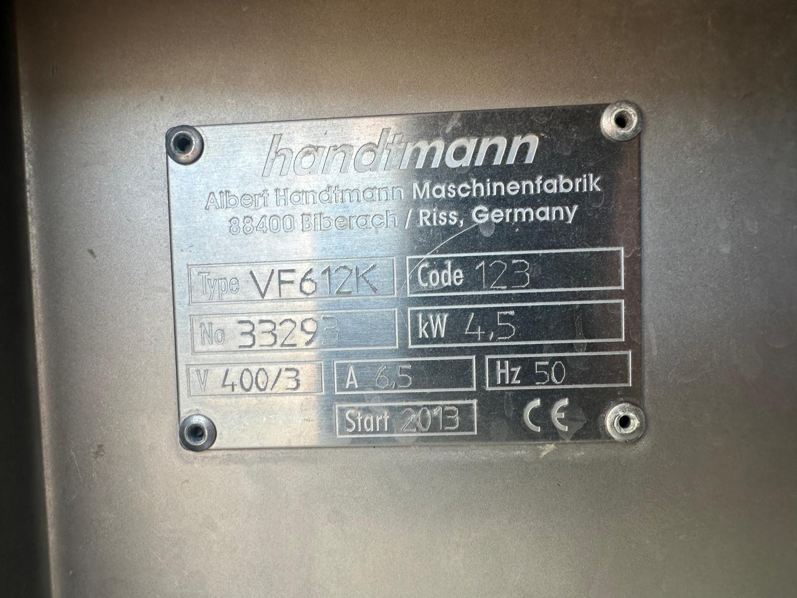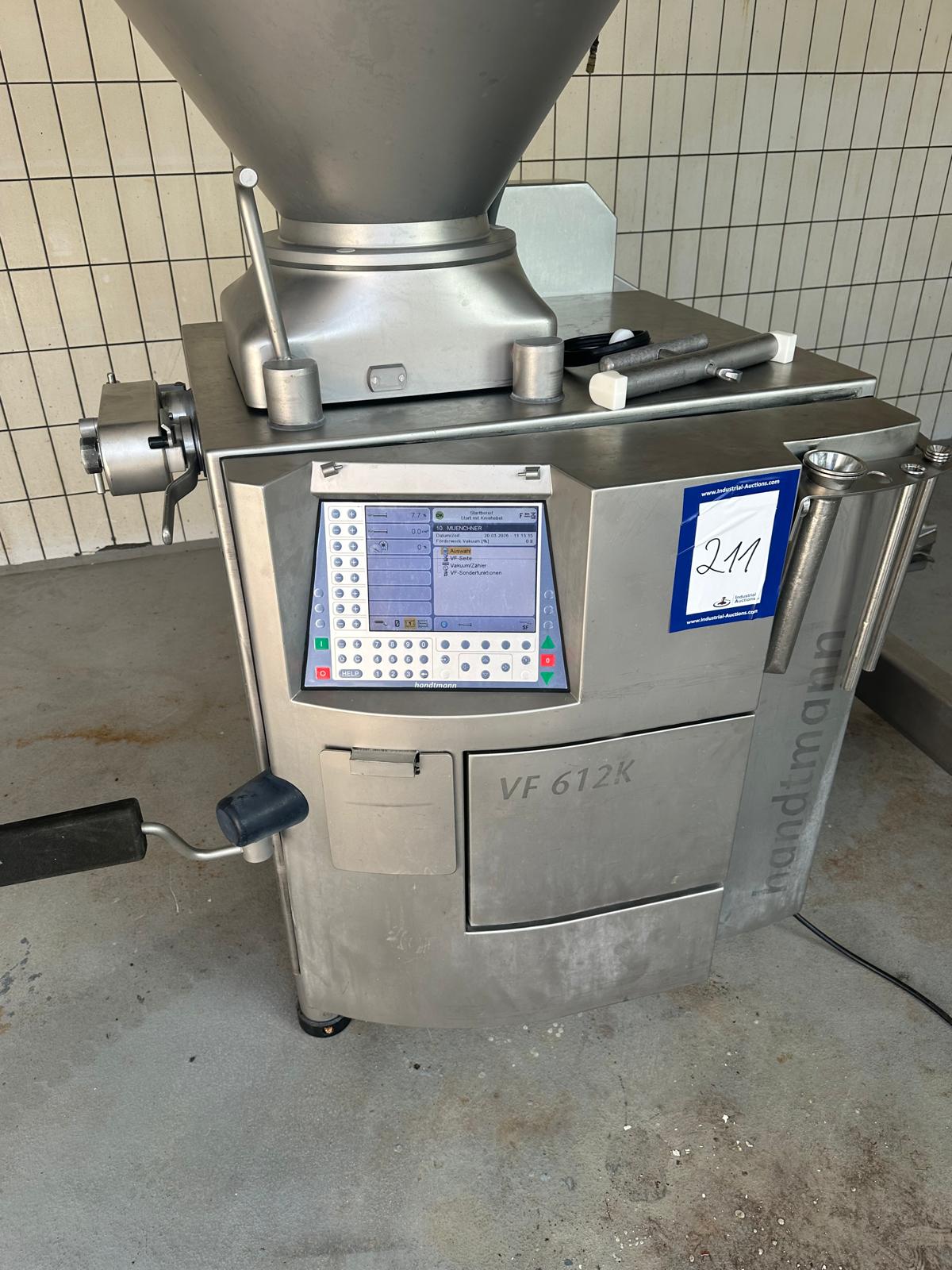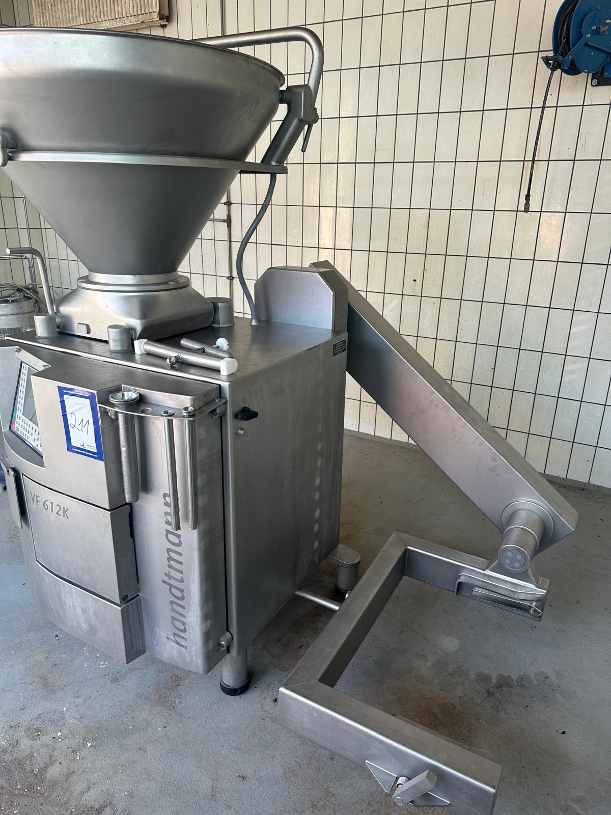 Handtmann vacuum filling machine with lifter for 200 liter meat bins, type: VF612K, number: 33293, year of construction: 2013, 400 V, 3 Ph, 50 Hz 4.5 kW, 6.5 A, 1200 kg, dimensions: 2100 mm x 1400 mm x 2200 mm.