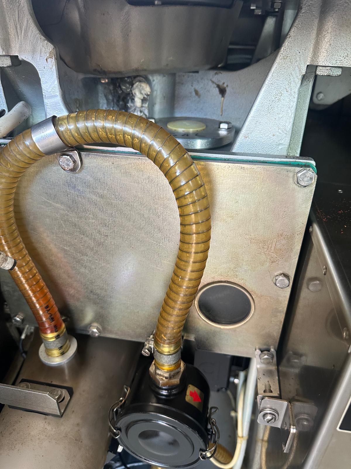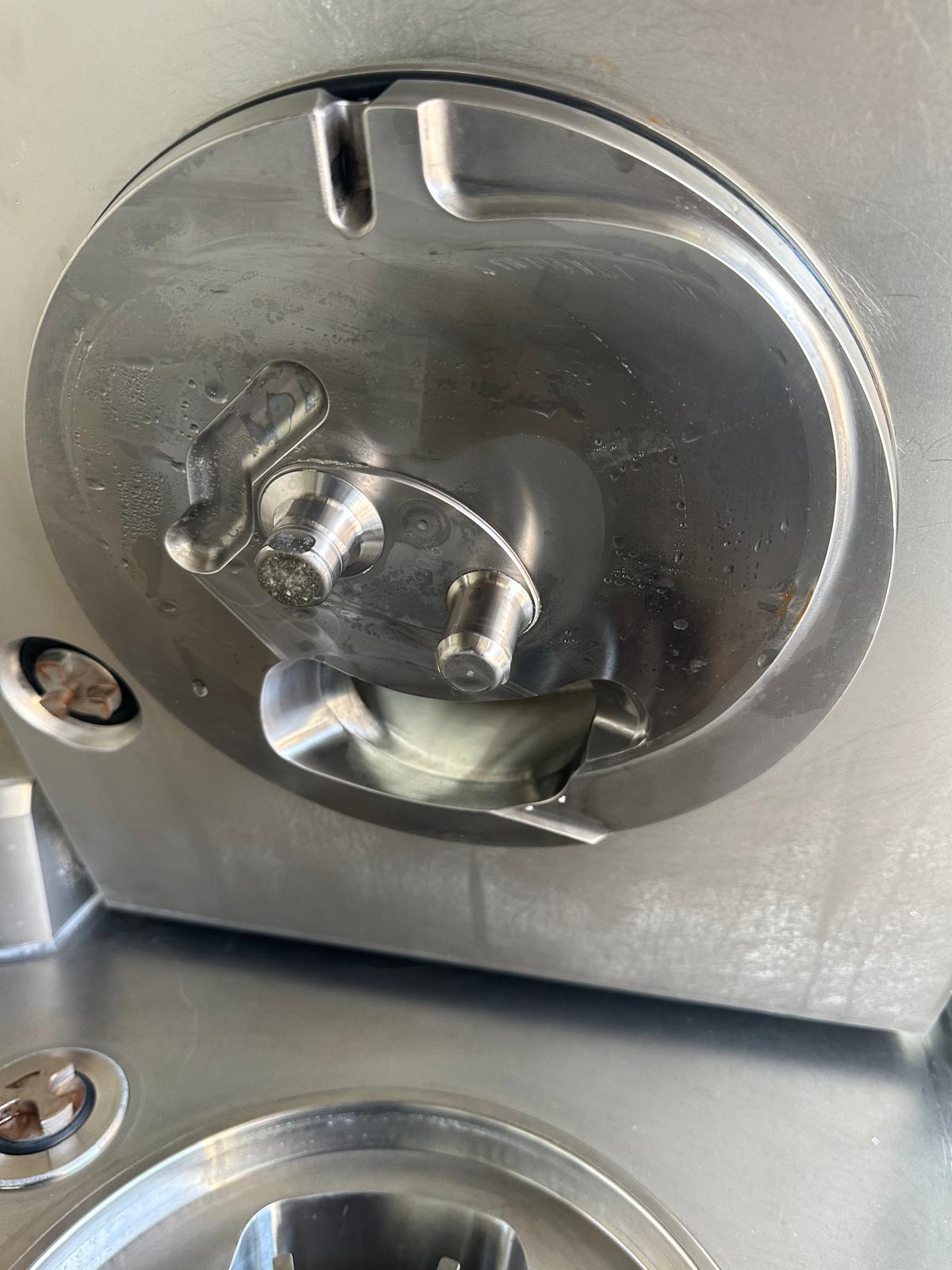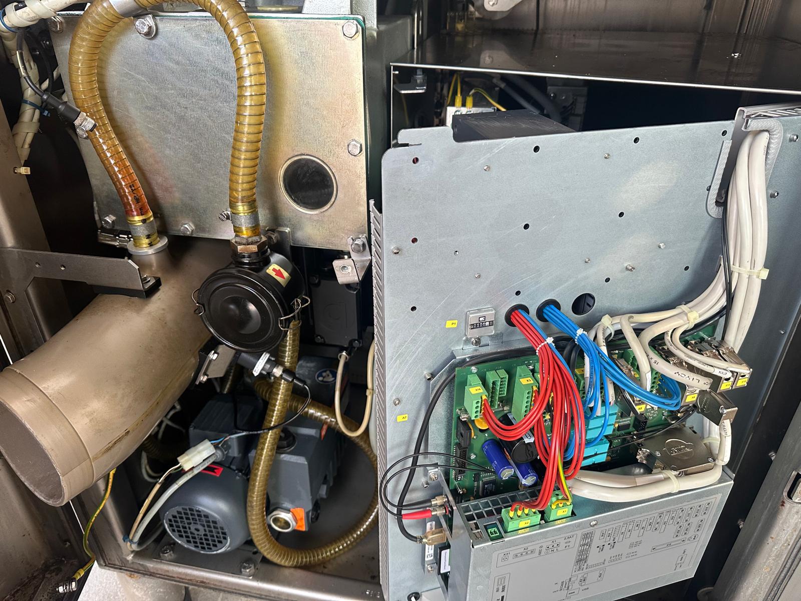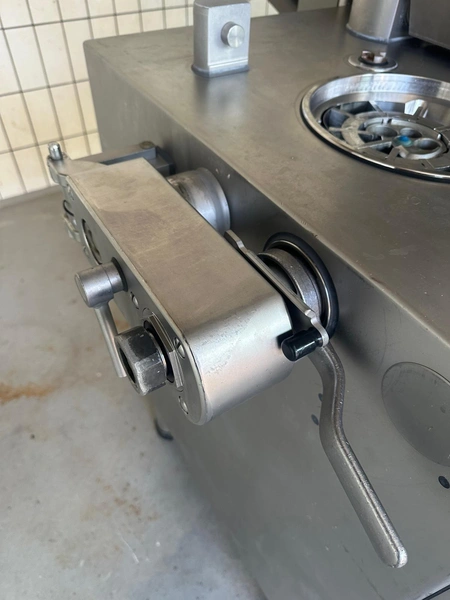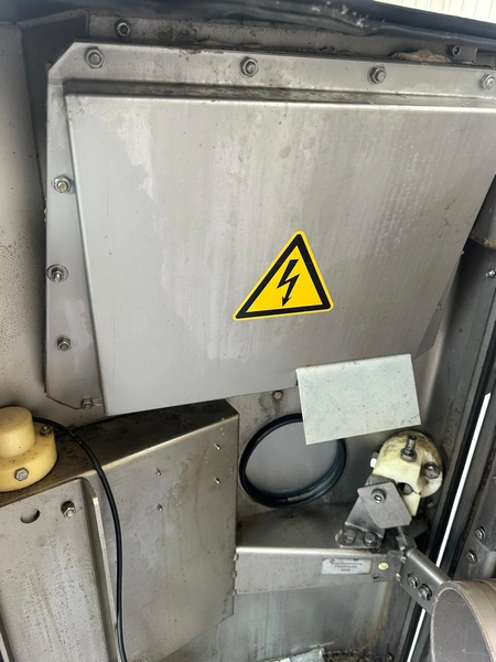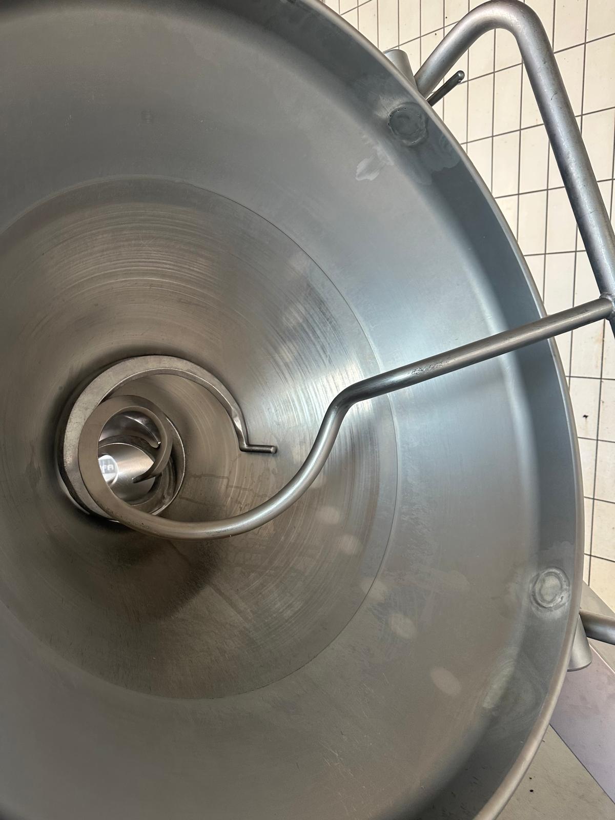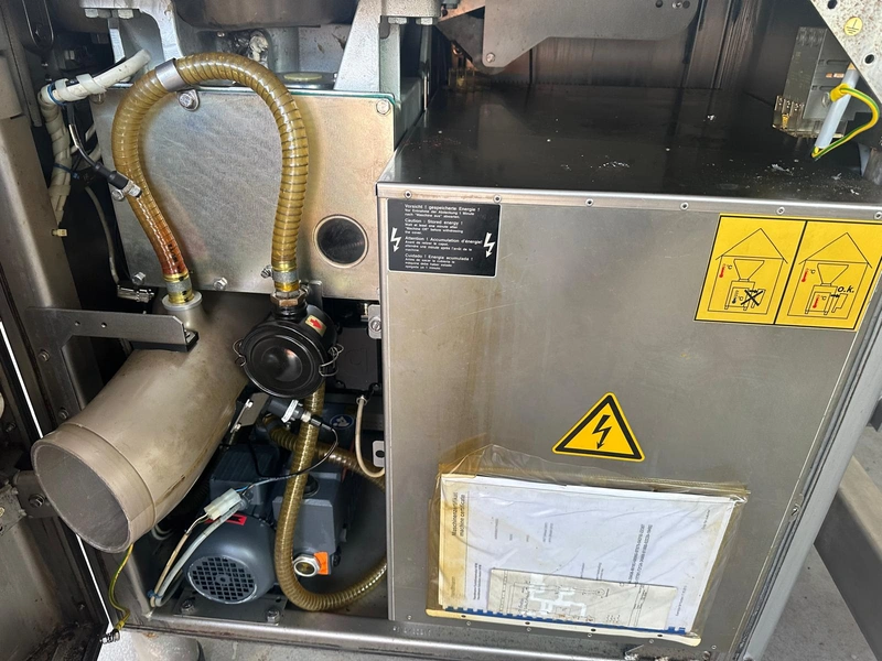 Handtmann vacuum filling machine with lifter for 200 liter meat bins, type: VF612K, number: 33293, year of construction: 2013, 400 V, 3 Ph, 50 Hz 4.5 kW, 6.5 A, 1200 kg, dimensions: 2100 mm x 1400 mm x 2200 mm.