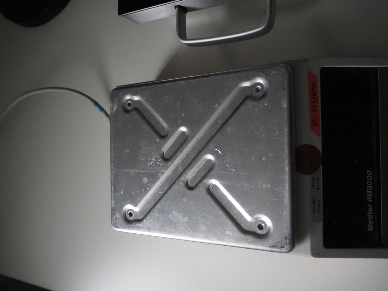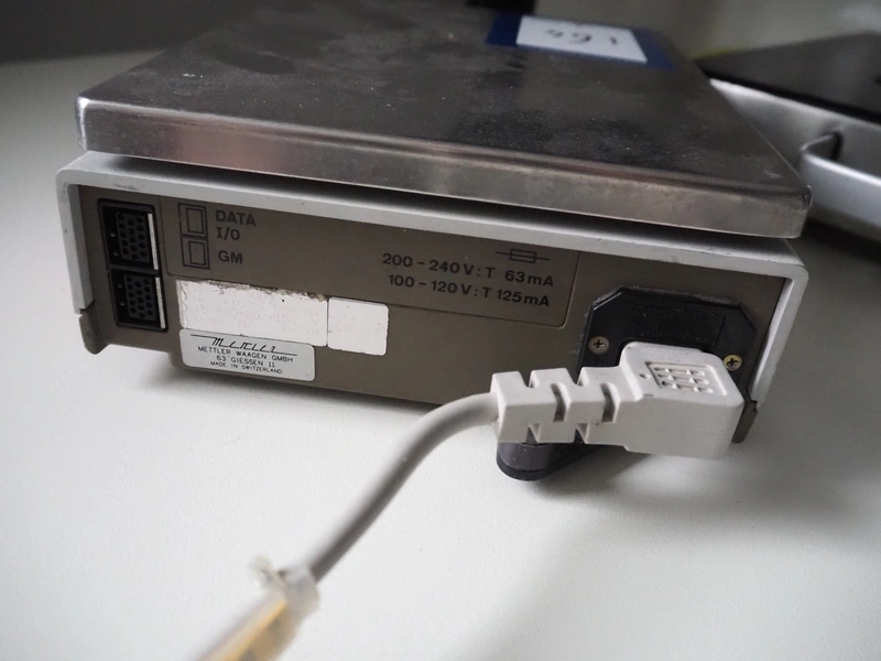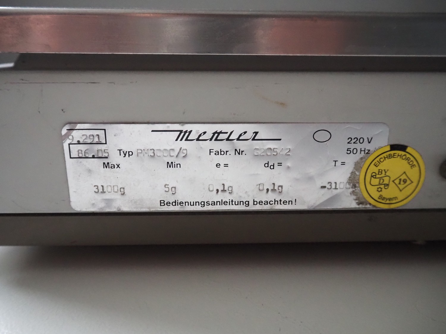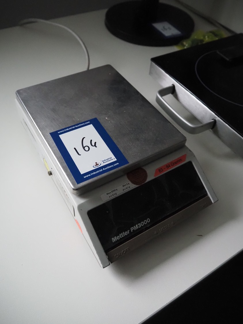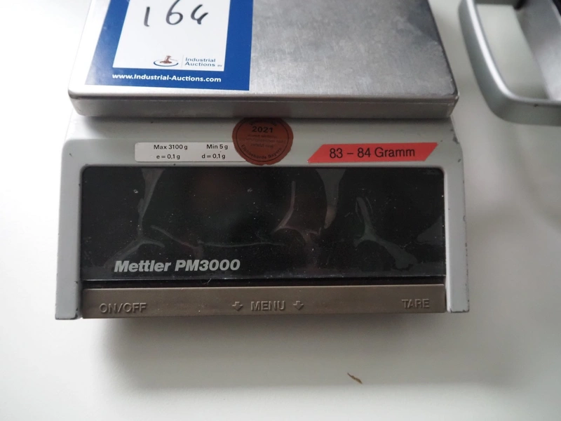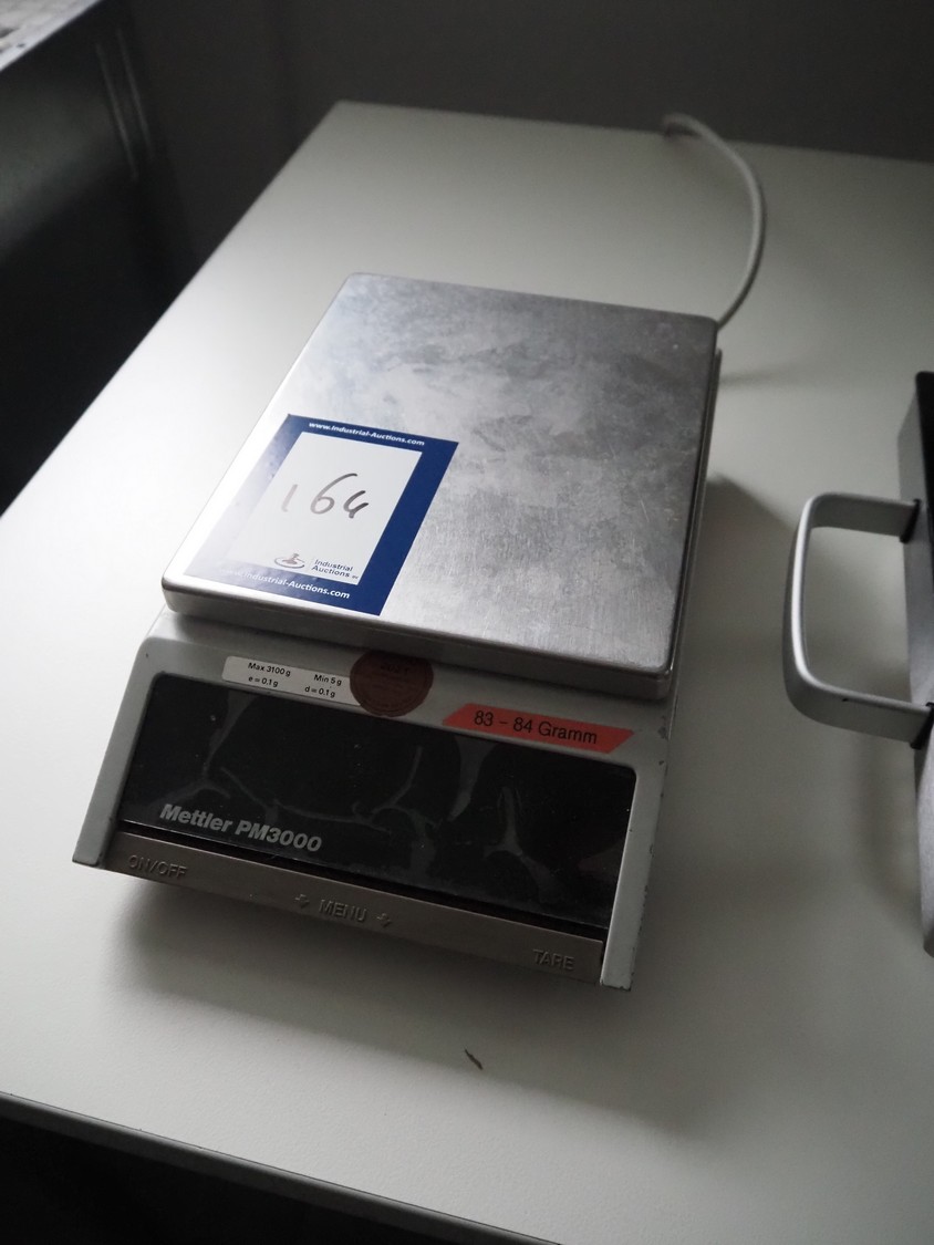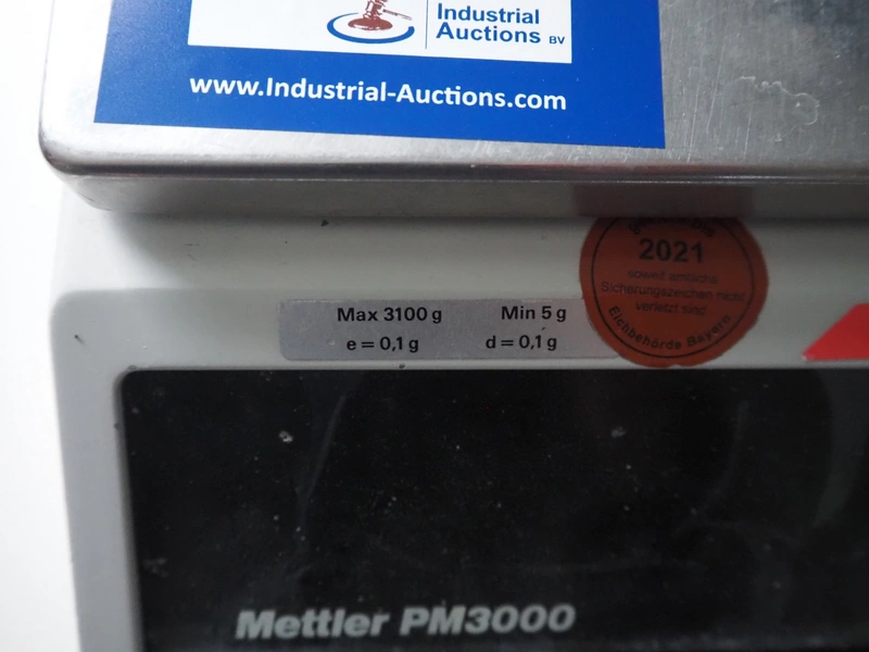 Mettler Toledo weighing scale, type: PM3000/9, number: G20542, 220 V, 50 Hz, maximum: 3100 g, minimum: 5 g, e=0.1 g, dd= 0.1 g, T= -3100 g, scale: 230 mm x 190 mm, total dimensions: 350 mm x 195 mm x 90 mm.