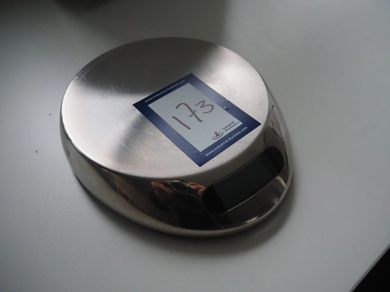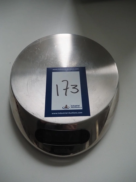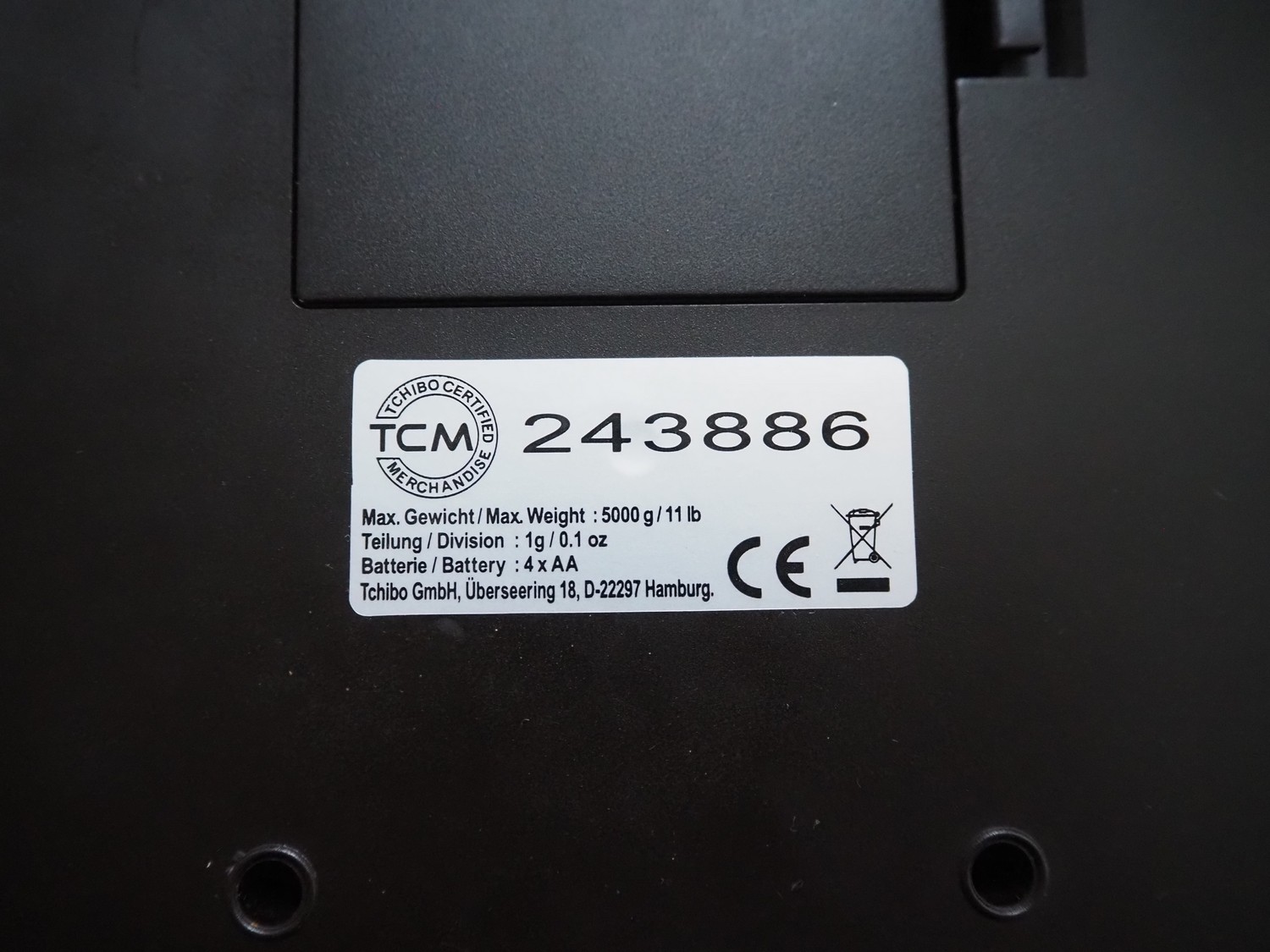 TCM weighing scale, number: 243886, maximum weight: 5000 g, division: 1g, battery: 4x AA, dimensions: 260 mm x 210 mm x 50 mm.