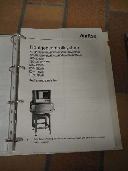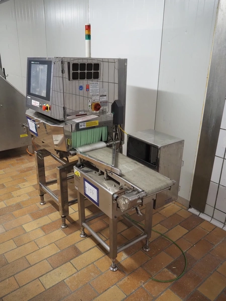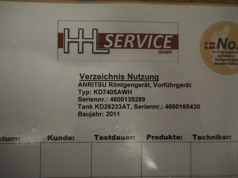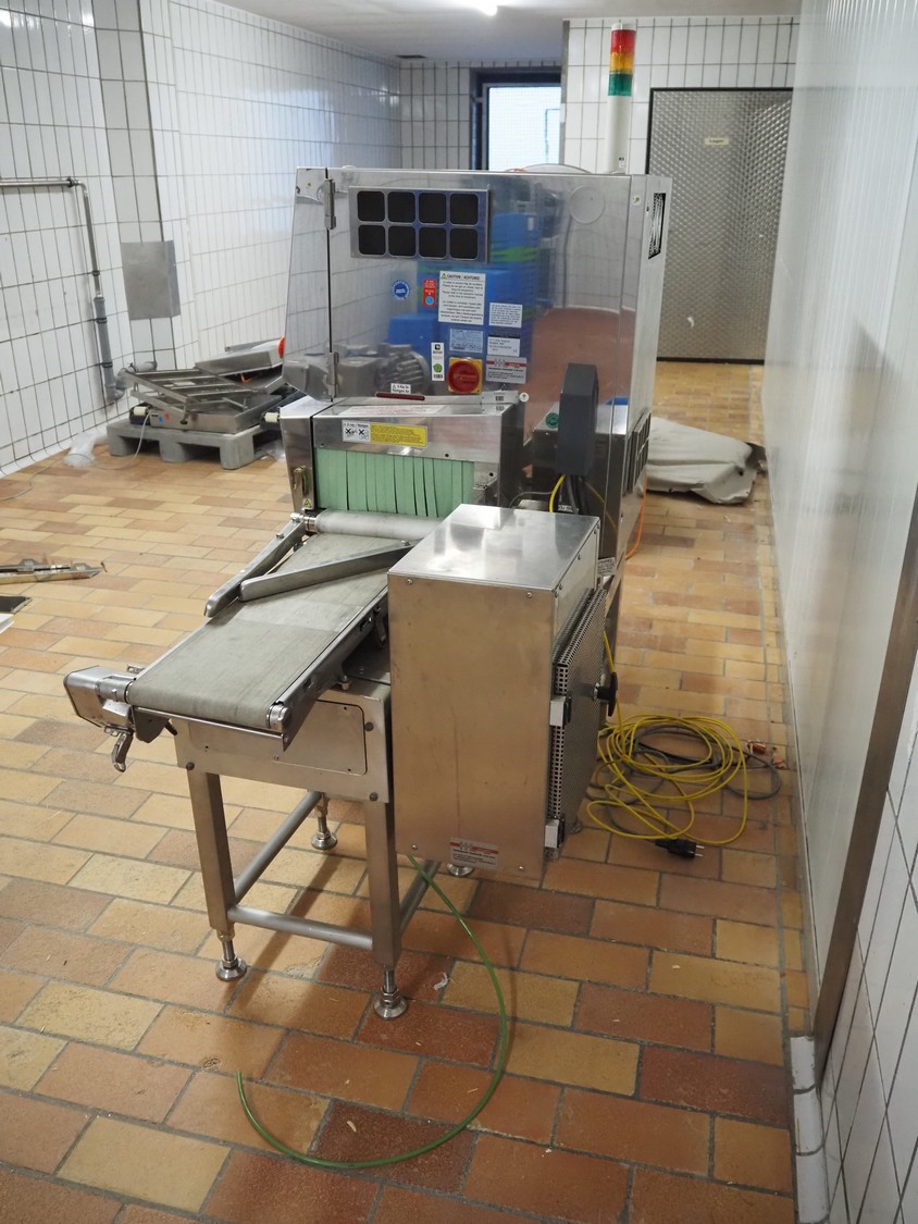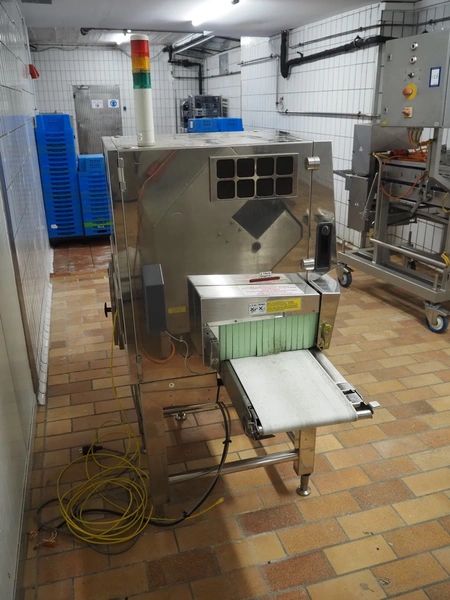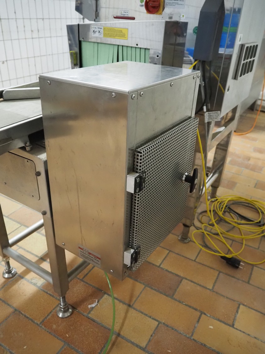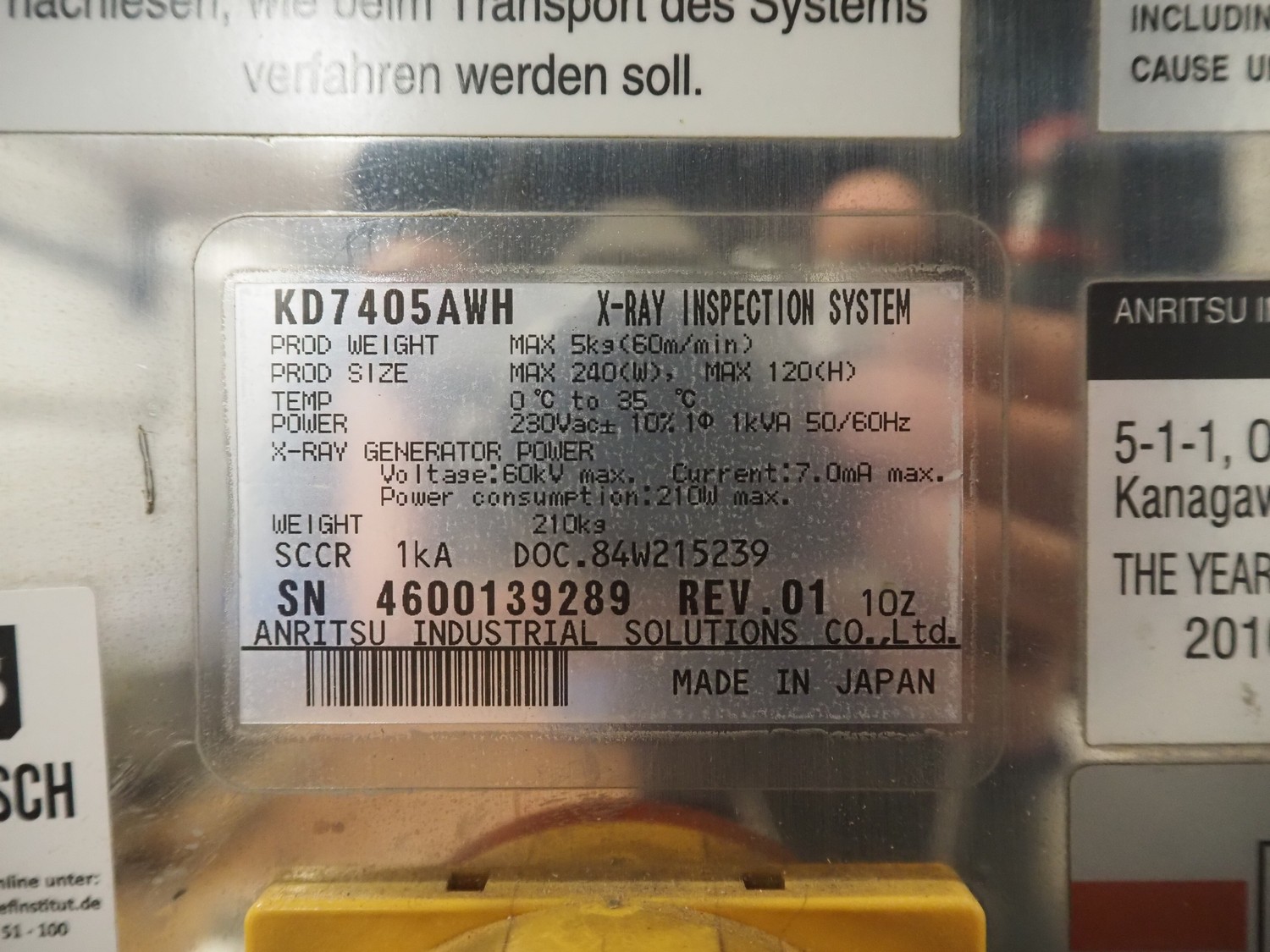 Anritsu Industrial Solutions Co.,Ltd. X-ray scanner with rejector, type: KD7405AWH, serial number: 4600139289, 230 V, 50/60 Hz, maximum product weight: 5 kg, maximum product size: width: 240 mm, height: 120, clearance: 340 mm x 140 mm, plastic belt, belt width: (1x) 270 mm, (1x) 220 mm, total dimensions: (1x) 1100 mm x 760 mm x 1680 mm, (1x) 690 mm x 700 mm x 870 mm.