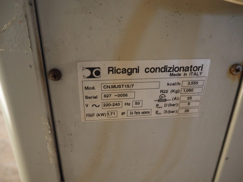 Ricagni outside unit for air conditioning, model: CN.MUST15/7, serial number: 827-0056, 220-240 V, 50 Hz, 25 A, dimensions: 800 mm x 280 mm x 620 mm.