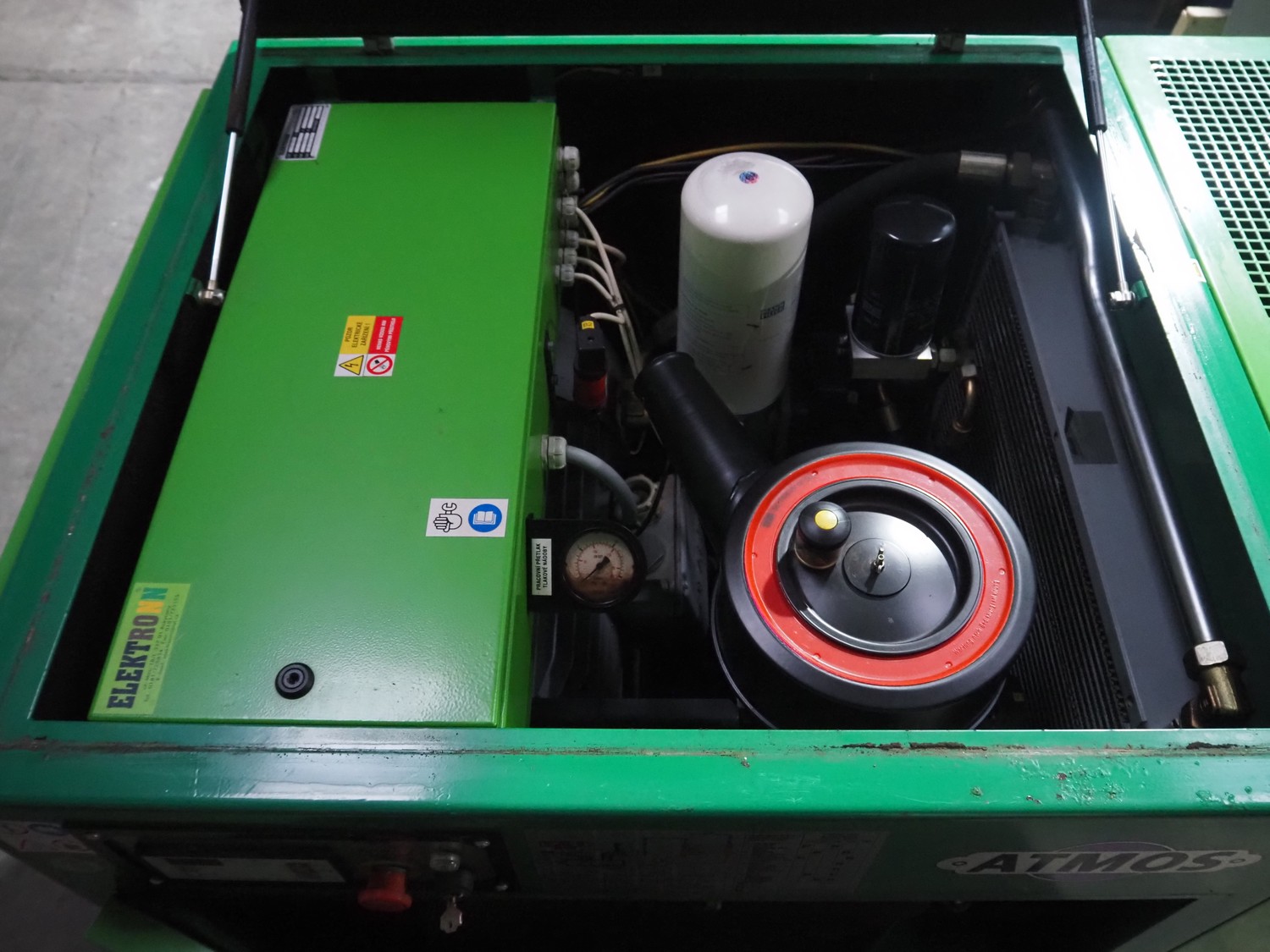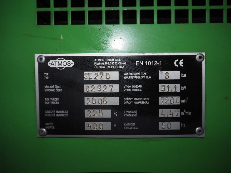 Atmos screw compressor, type: SE270, serial number: 82927, year of construction: 2006, 400 V, 50 Hz, weight: 820 kg, dimensions: 1330 mm x 980 mm x 1230 mm.