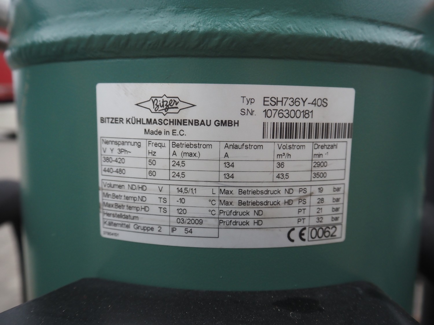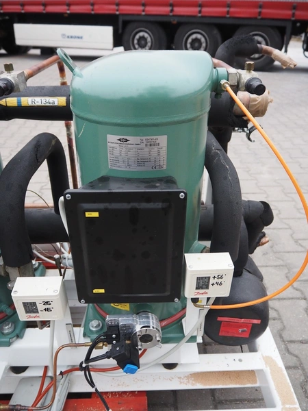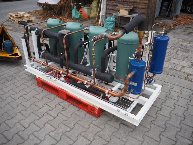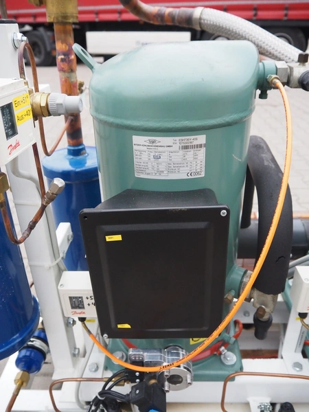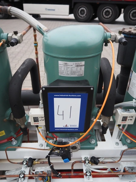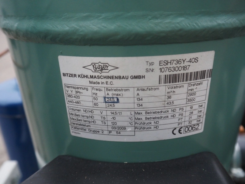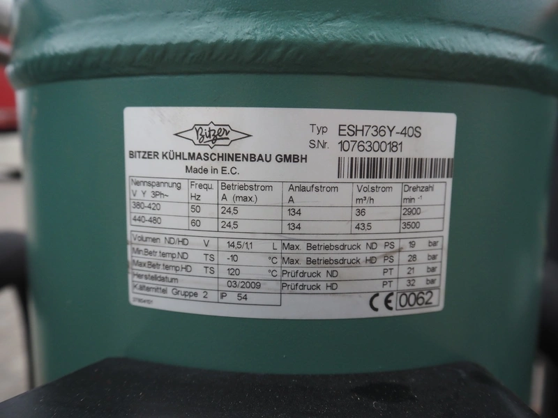 Hauser compressor rack, type: A-BI-103-4-NK-S-S, number: MP052863, year of construction: 2009, refrigerant: R134A, with 4 Bitzer scroll compressors, type: ESH736Y-40S, 380-420/440-480 V, 50/60 Hz, 24.5 A, dimensions: 2050 mm x 800 mm x 1150 mm.