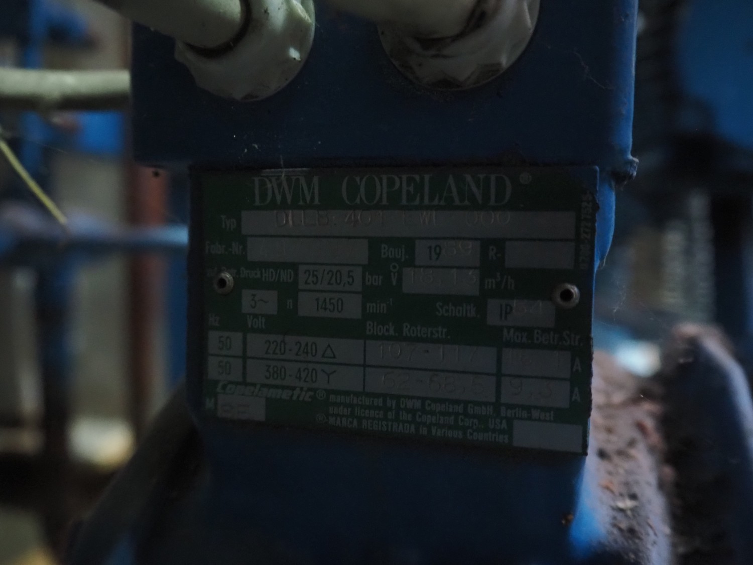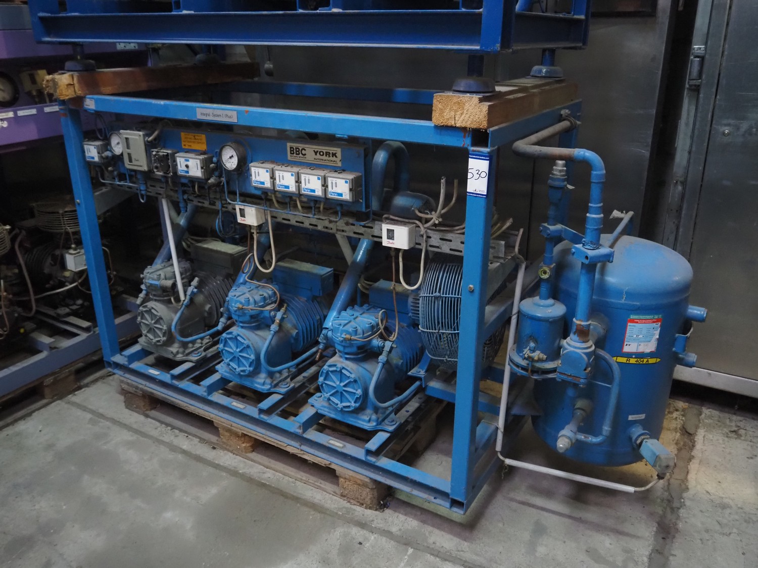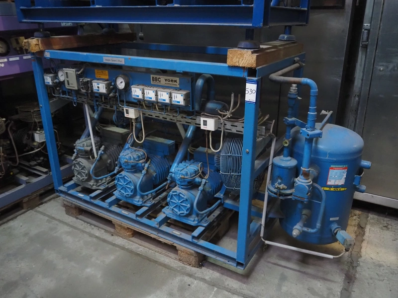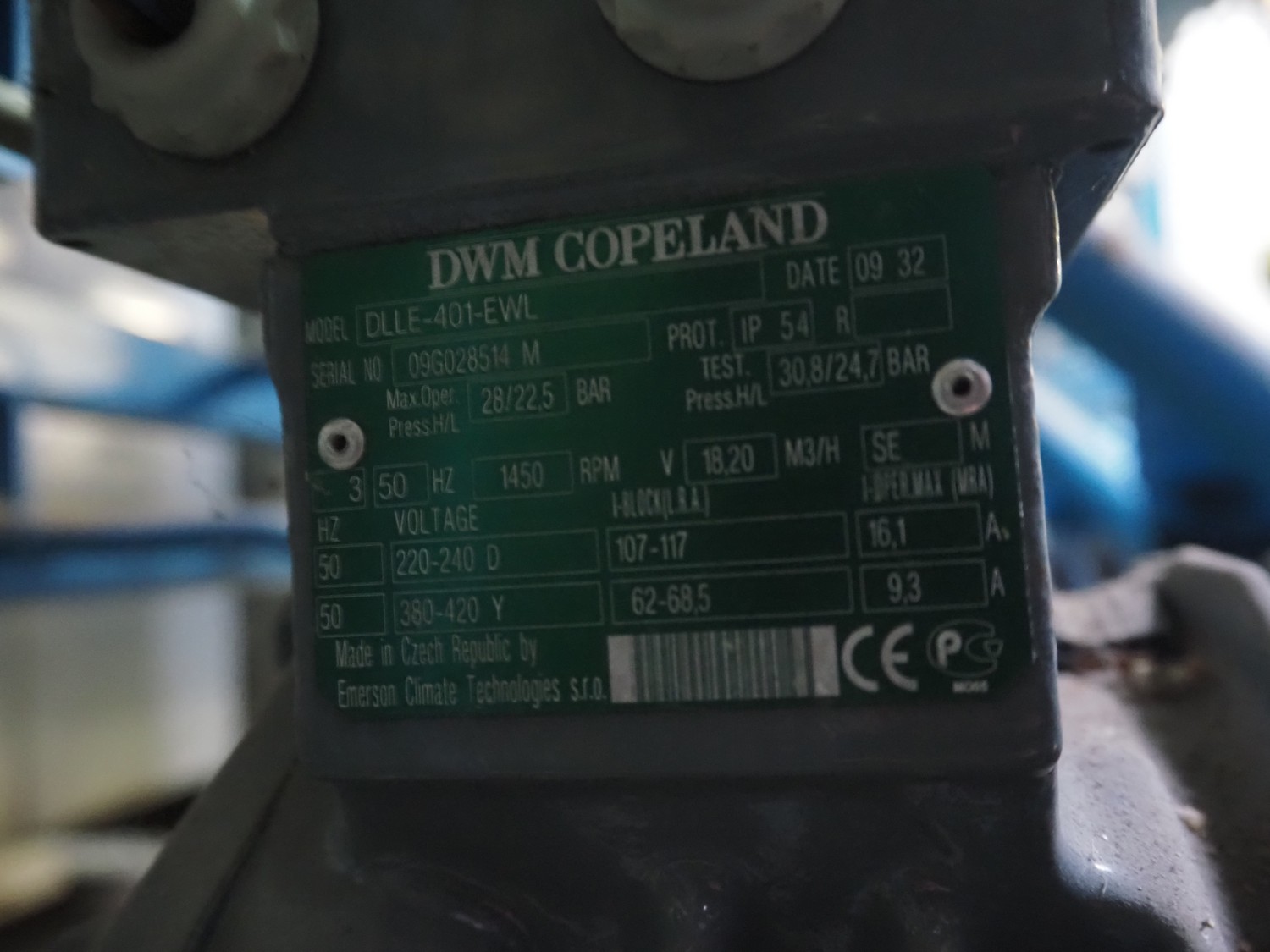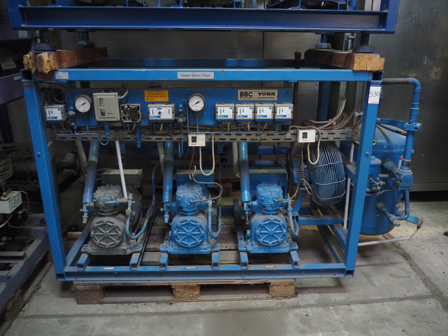 BBC York compressor rack with 3 Copeland cooling compressors, model: DLLE-401-EWL and DLLB 401 EWL, 220-240/380-420 V, 3 Ph, 50 Hz, dimensions: 2100 mm x 900 mm x 1100 mm.
