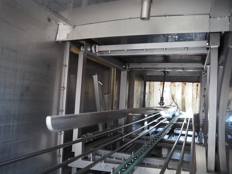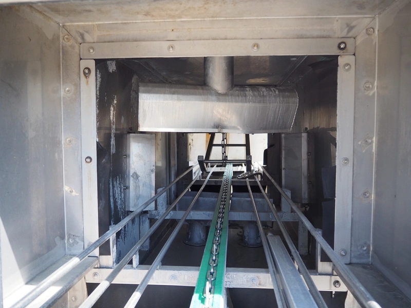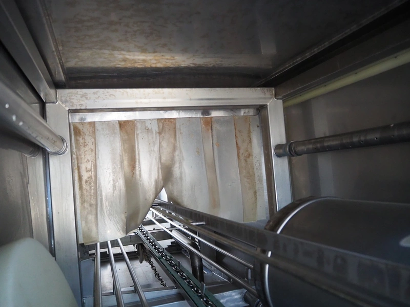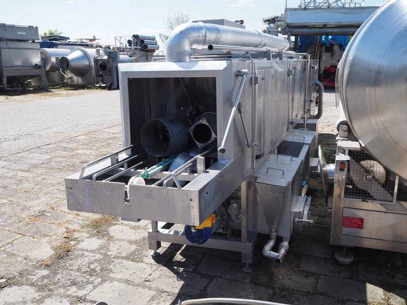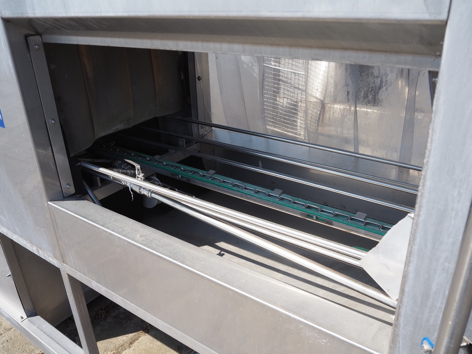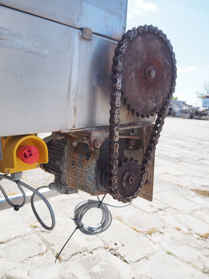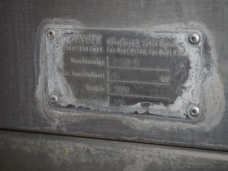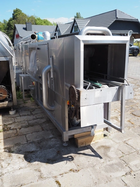 Kitzinger crate washer, type: C250 2T, machine number: 323, year of construction: 2006, s/s chain belt, belt width: 500 mm, clearance: 500 mm x 300 mm, total dimensions: 8100 mm x 1500 mm x 2100 mm.