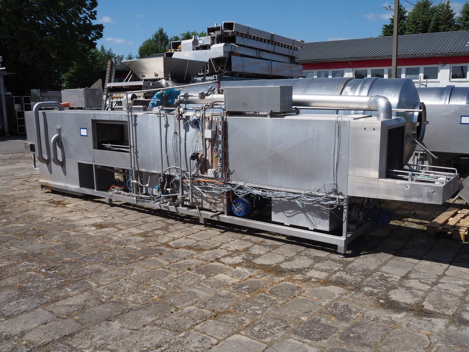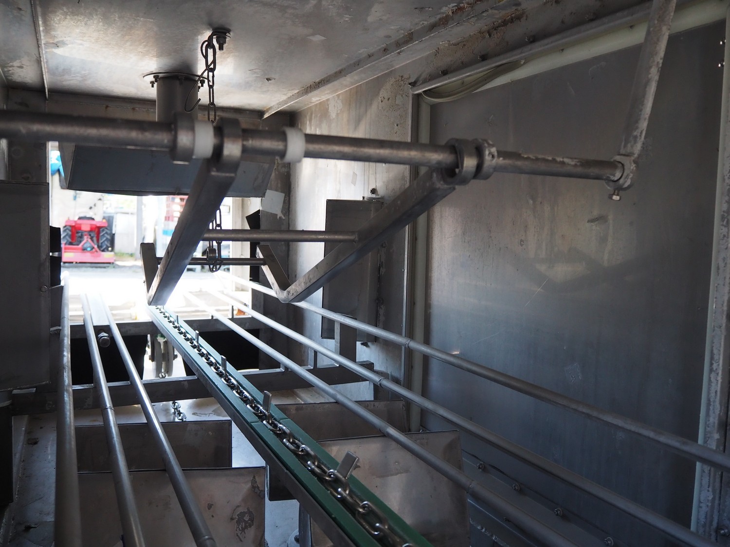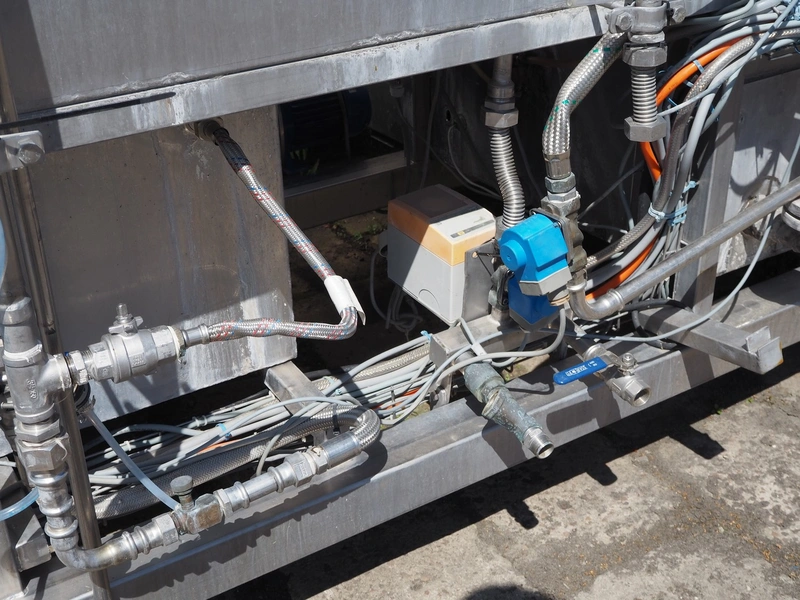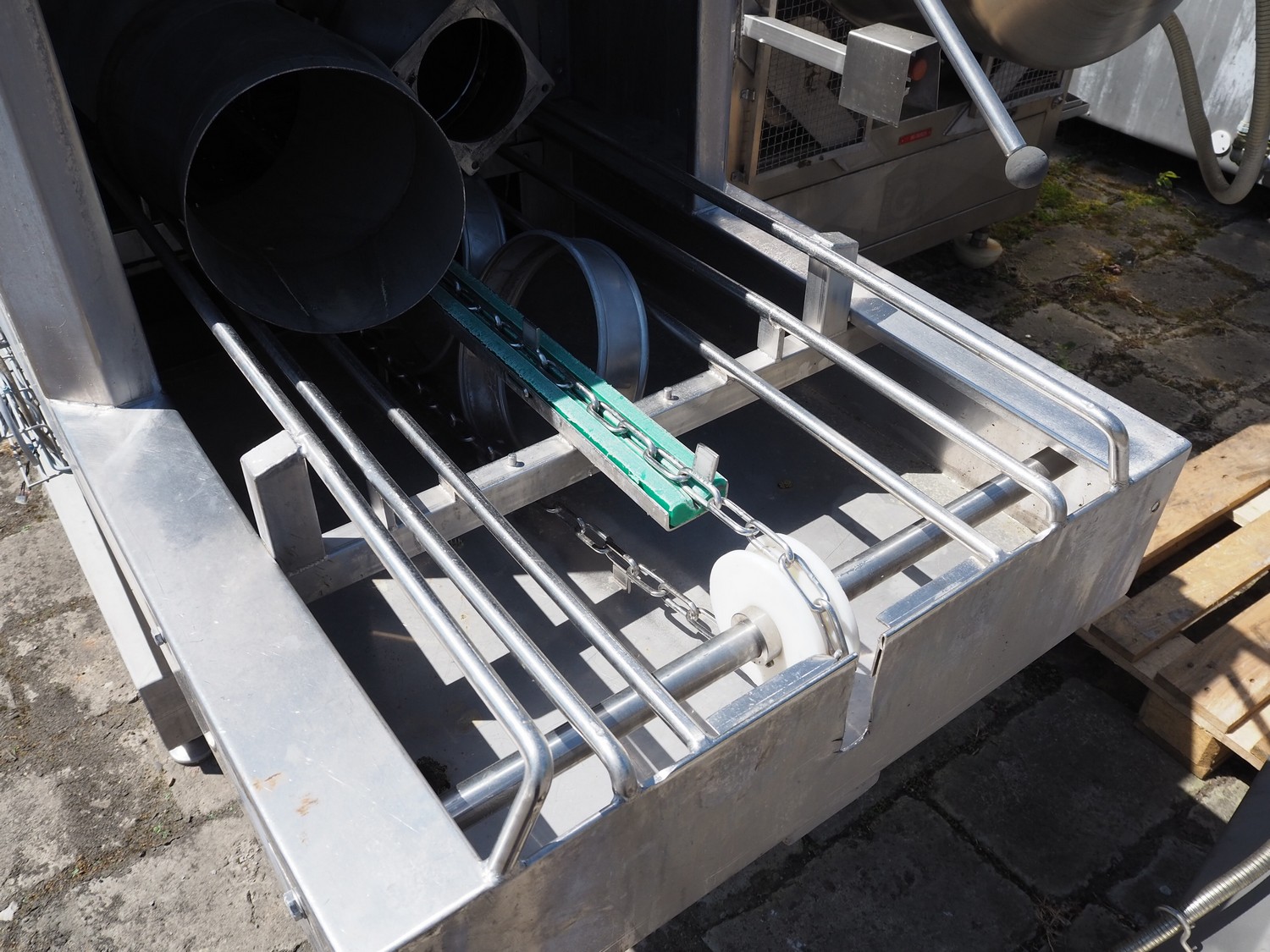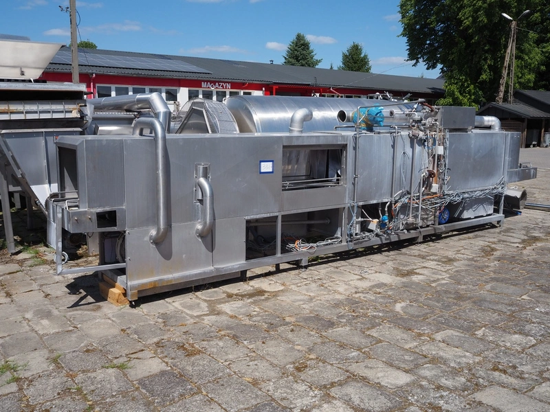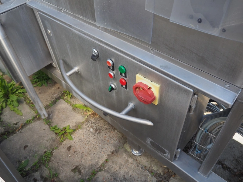 Kitzinger crate washer, type: C250 2T, machine number: 323, year of construction: 2006, s/s chain belt, belt width: 500 mm, clearance: 500 mm x 300 mm, total dimensions: 8100 mm x 1500 mm x 2100 mm.