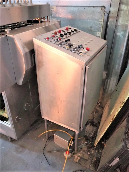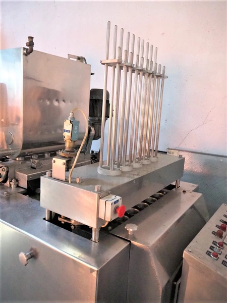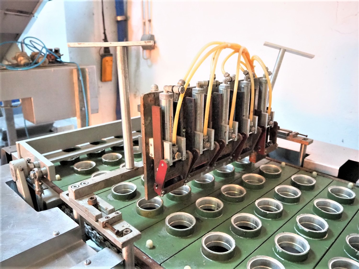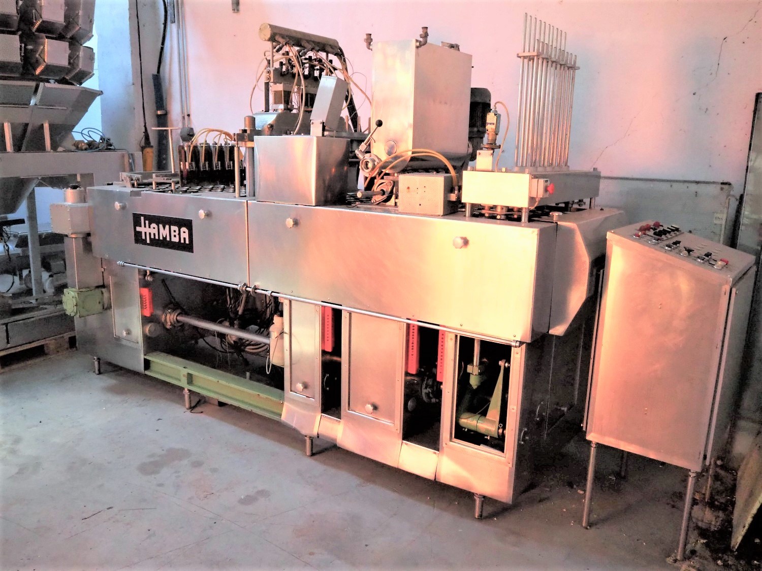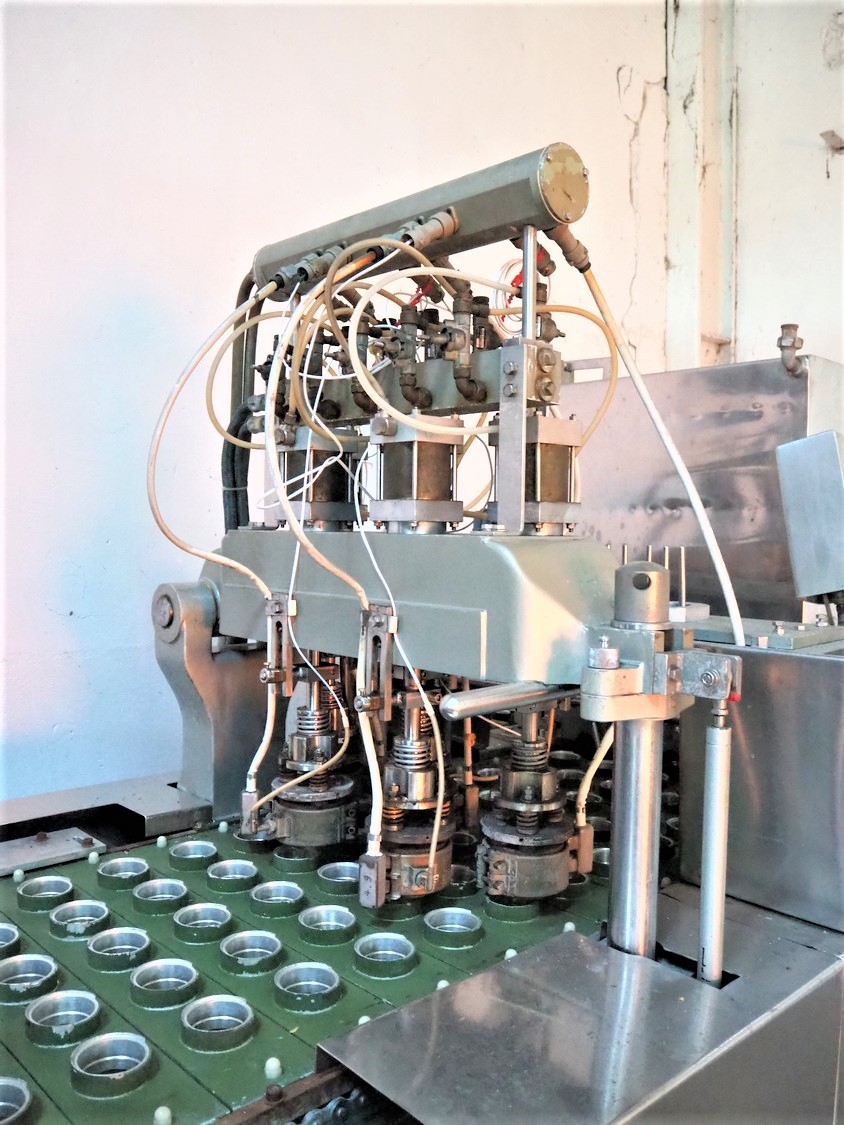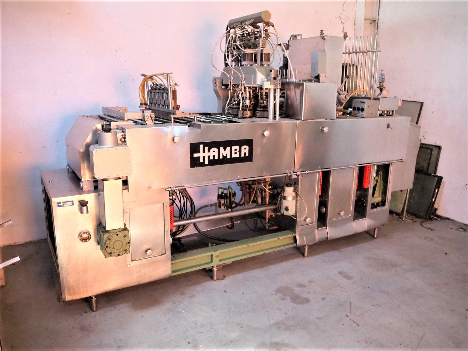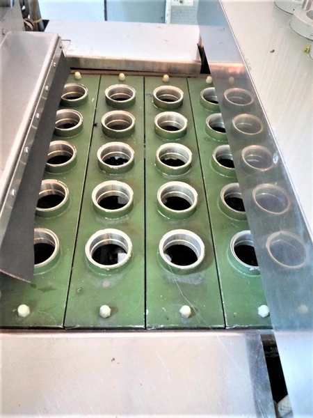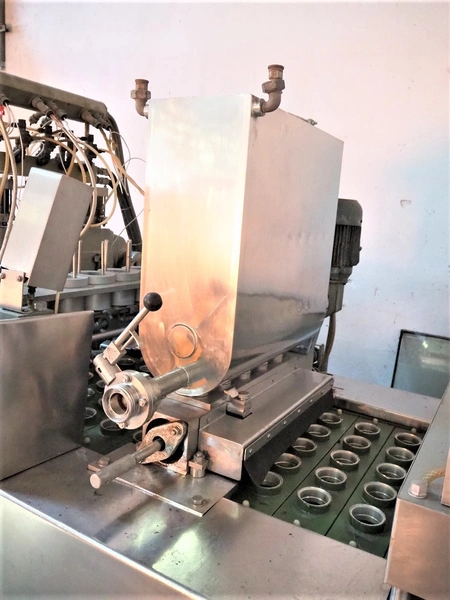 Hamba cup filling and sealing machine, machine number: 45 002, diameter cup: 55 mm, total dimensions: 3900 mm x 1150 mm x 2100 mm.