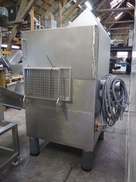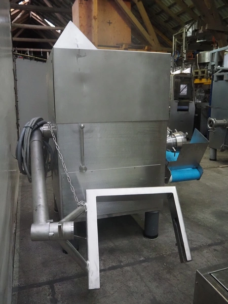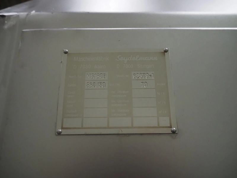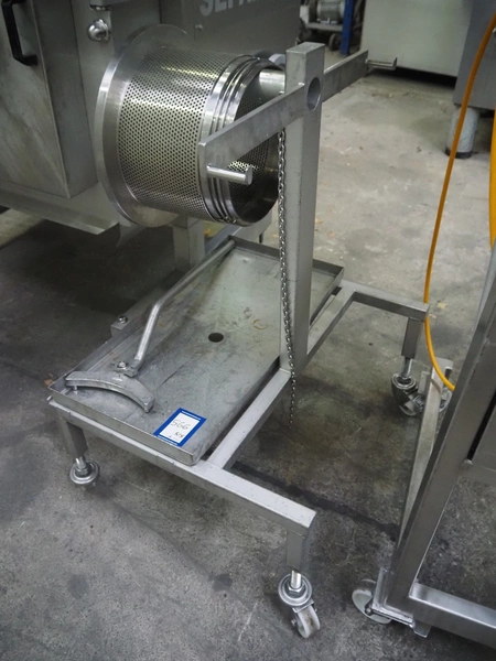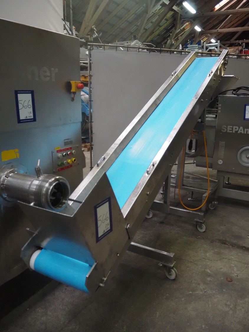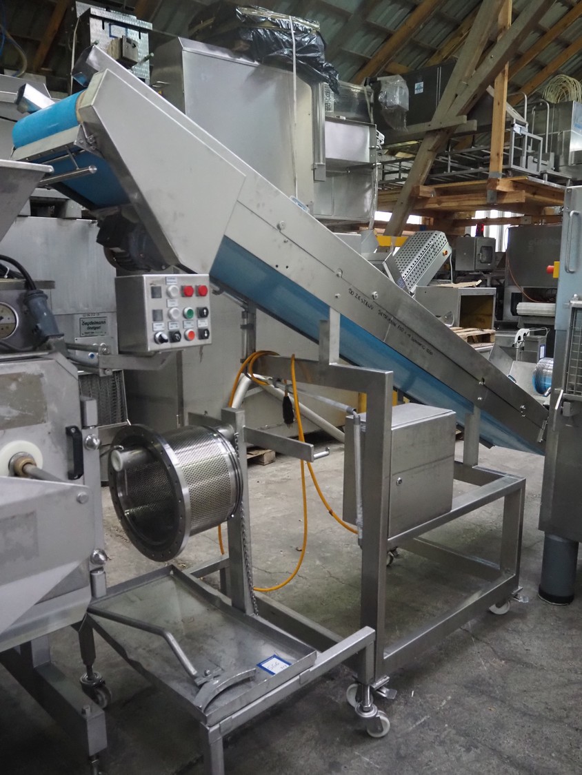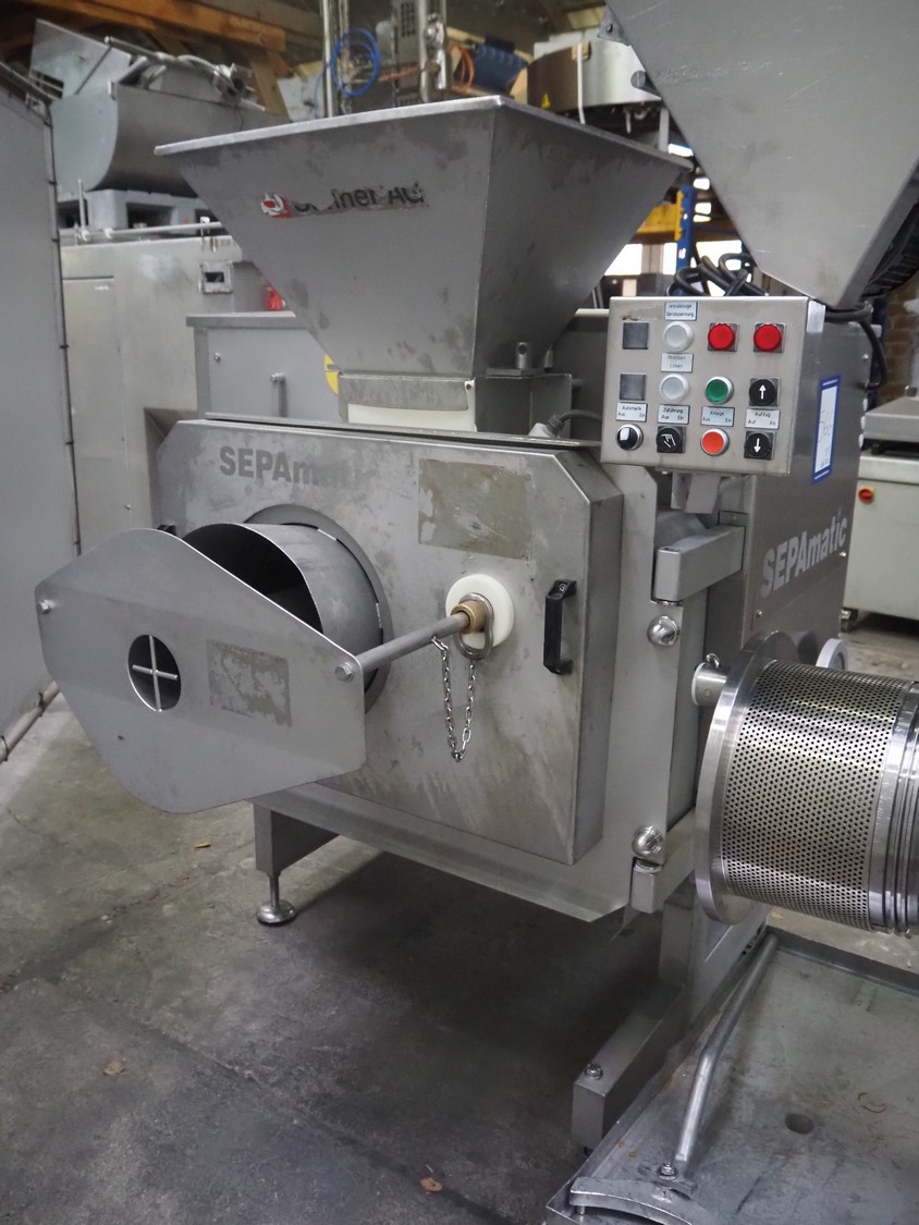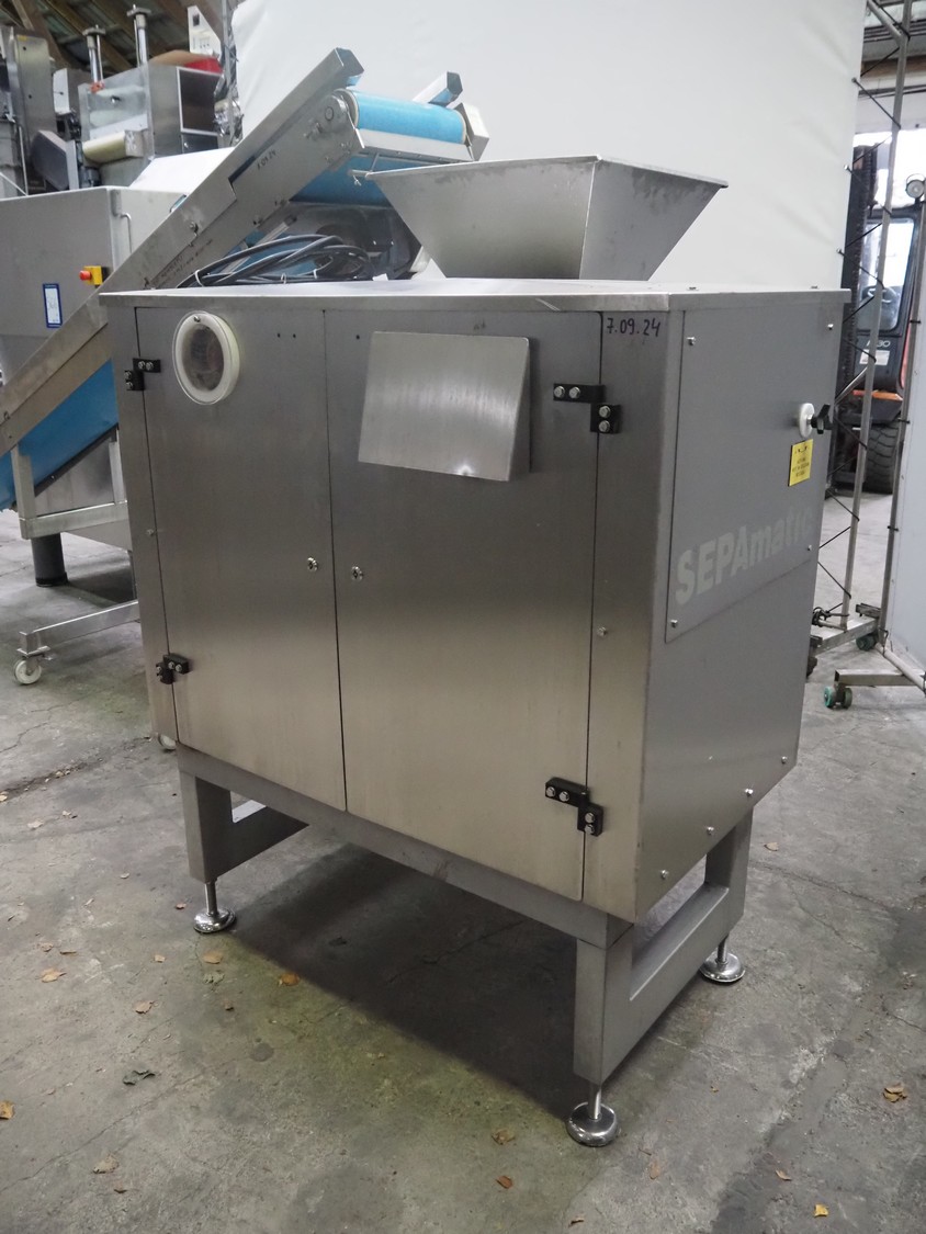 Grinder / separator line, consisting of: Seydelmann mixer-grinder with lifter for 200 liter meat bins, type: MG160B, machine number: 92379-1, 380 V, 50 Hz, 70 A, plate diameter: 160 mm, dimensions: 2000 mm x 1700 mm x 2200 mm.Switch cabinet, dimensions: 1230 mm x 1000 mm x 600 mm.Mobile elevating belt, s/s frame, plastic belt, belt width: 370 mm, elevating height: 1950 mm, total dimensions: 2950 mm x 850 mm x 2080 mm.Sepamatic separator, type: SEPA 1200, machine number: 195712, 400 V, 50 Hz, 12 A, 6 kW, 24 volt, plastic belt, belt width: 180 mm, perforations: 3 mm, total dimensions: 1500 mm x 1400 mm x 1750 mm.S/s trolley with extra drum, perforations: 4 mm, total dimensions: 850 mm x 700 mm x 1100 mm.