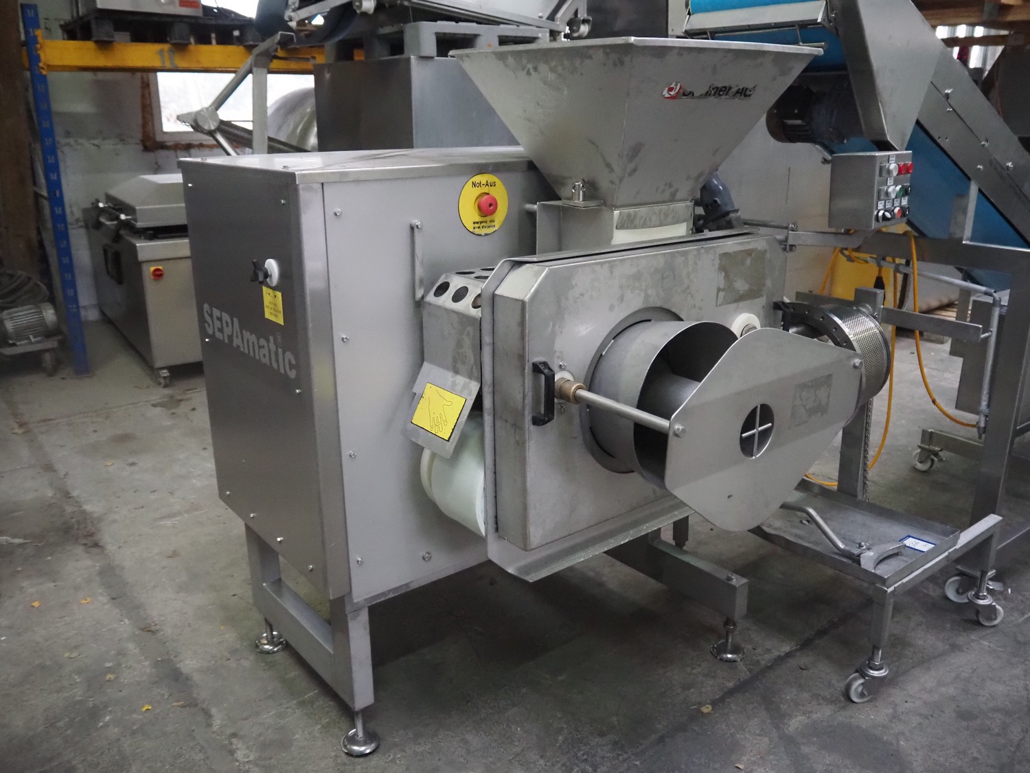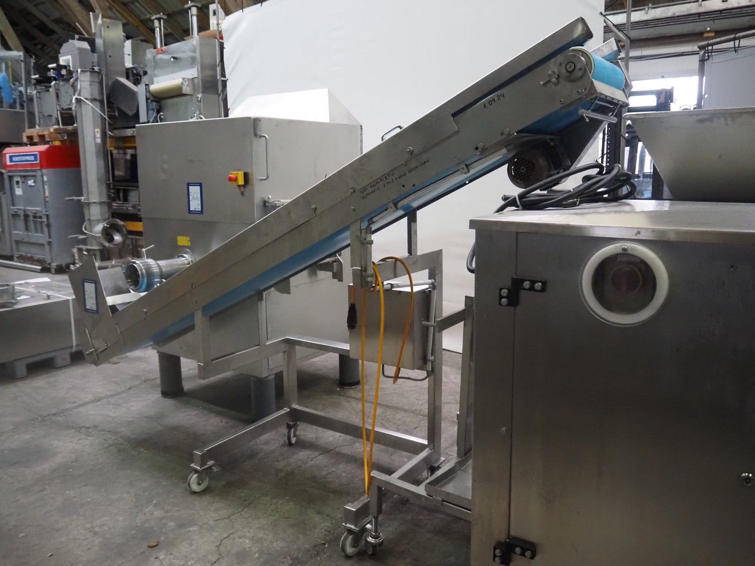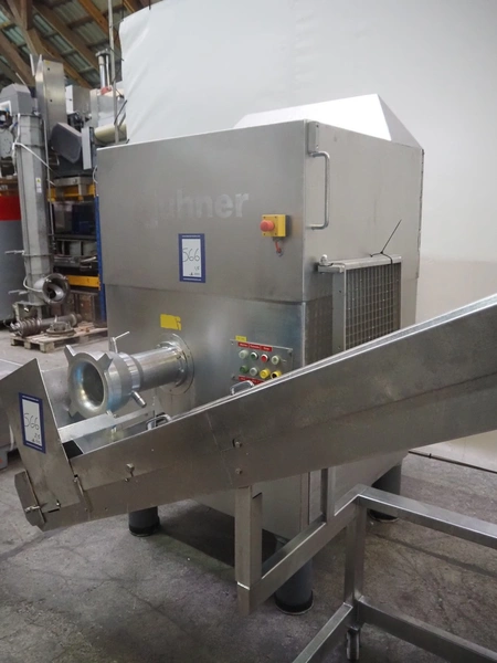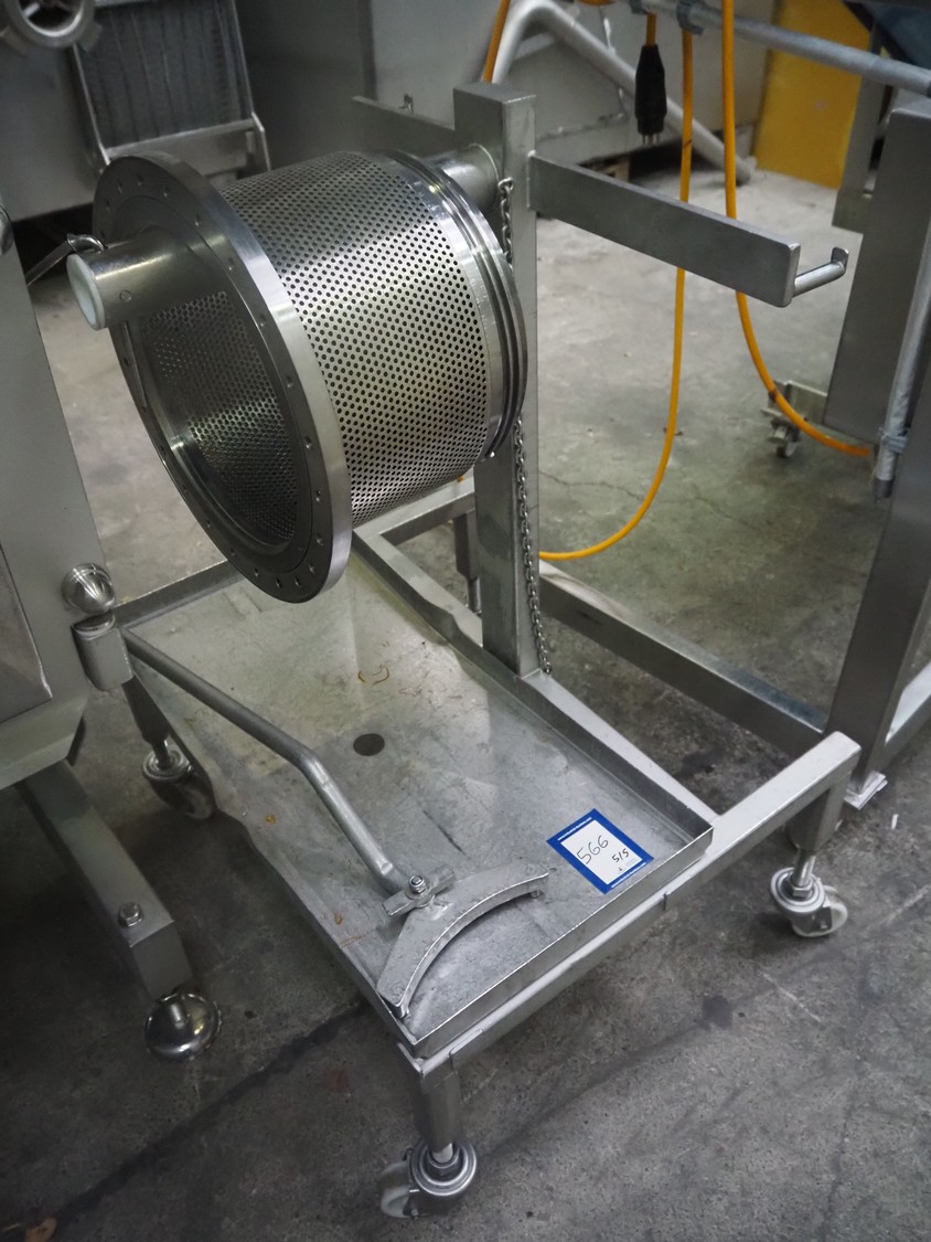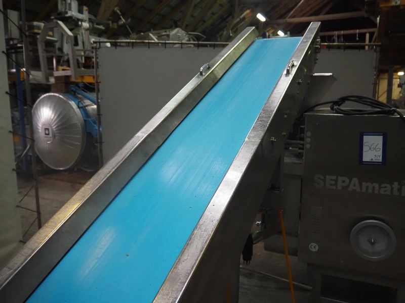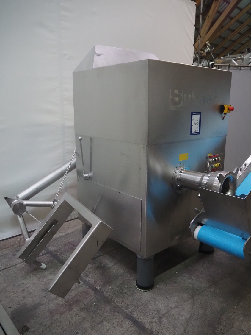 Grinder / separator line, consisting of: Seydelmann mixer-grinder with lifter for 200 liter meat bins, type: MG160B, machine number: 92379-1, 380 V, 50 Hz, 70 A, plate diameter: 160 mm, dimensions: 2000 mm x 1700 mm x 2200 mm.Switch cabinet, dimensions: 1230 mm x 1000 mm x 600 mm.Mobile elevating belt, s/s frame, plastic belt, belt width: 370 mm, elevating height: 1950 mm, total dimensions: 2950 mm x 850 mm x 2080 mm.Sepamatic separator, type: SEPA 1200, machine number: 195712, 400 V, 50 Hz, 12 A, 6 kW, 24 volt, plastic belt, belt width: 180 mm, perforations: 3 mm, total dimensions: 1500 mm x 1400 mm x 1750 mm.S/s trolley with extra drum, perforations: 4 mm, total dimensions: 850 mm x 700 mm x 1100 mm.