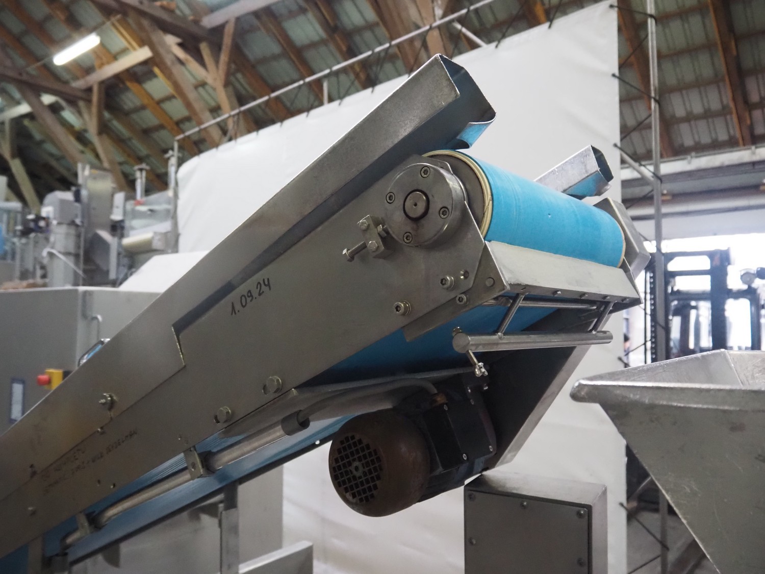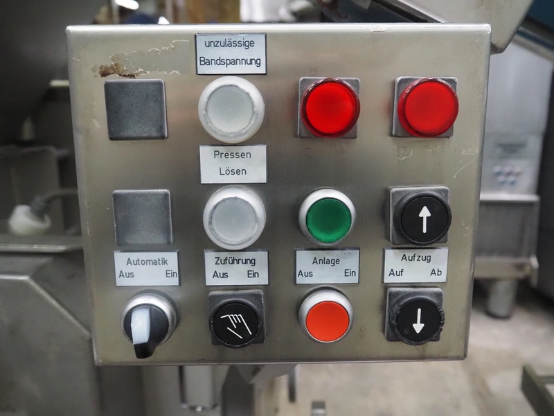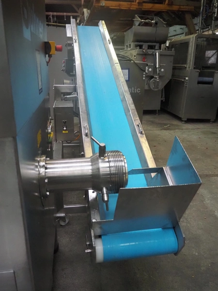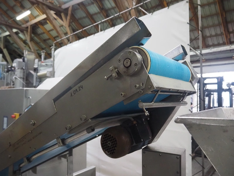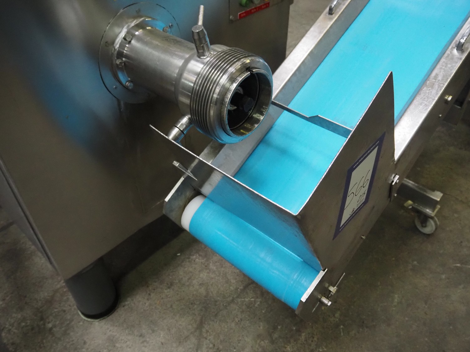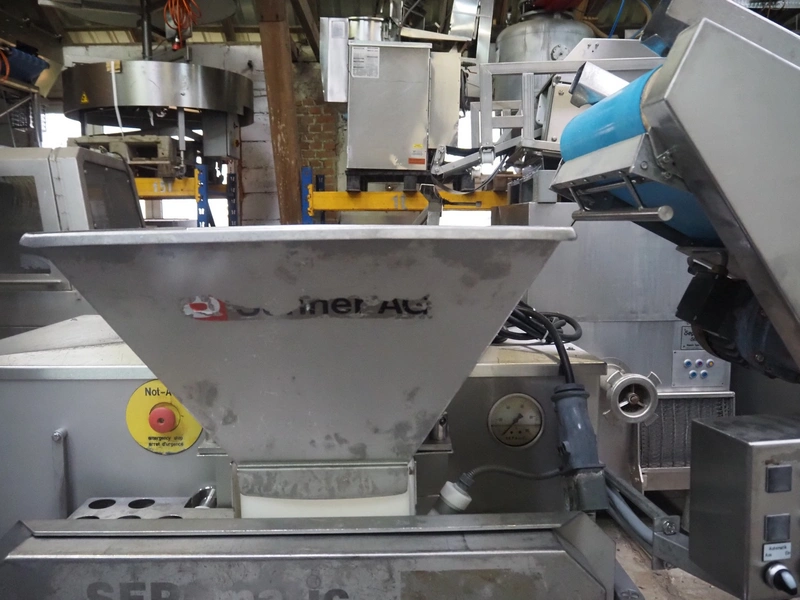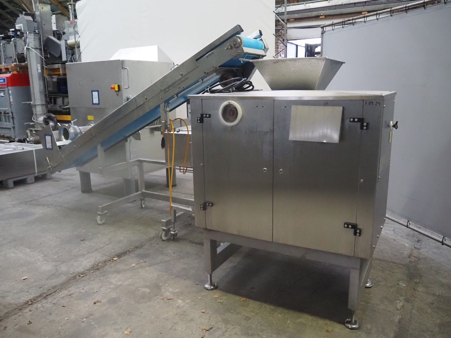 Grinder / separator line, consisting of: Seydelmann mixer-grinder with lifter for 200 liter meat bins, type: MG160B, machine number: 92379-1, 380 V, 50 Hz, 70 A, plate diameter: 160 mm, dimensions: 2000 mm x 1700 mm x 2200 mm.Switch cabinet, dimensions: 1230 mm x 1000 mm x 600 mm.Mobile elevating belt, s/s frame, plastic belt, belt width: 370 mm, elevating height: 1950 mm, total dimensions: 2950 mm x 850 mm x 2080 mm.Sepamatic separator, type: SEPA 1200, machine number: 195712, 400 V, 50 Hz, 12 A, 6 kW, 24 volt, plastic belt, belt width: 180 mm, perforations: 3 mm, total dimensions: 1500 mm x 1400 mm x 1750 mm.S/s trolley with extra drum, perforations: 4 mm, total dimensions: 850 mm x 700 mm x 1100 mm.