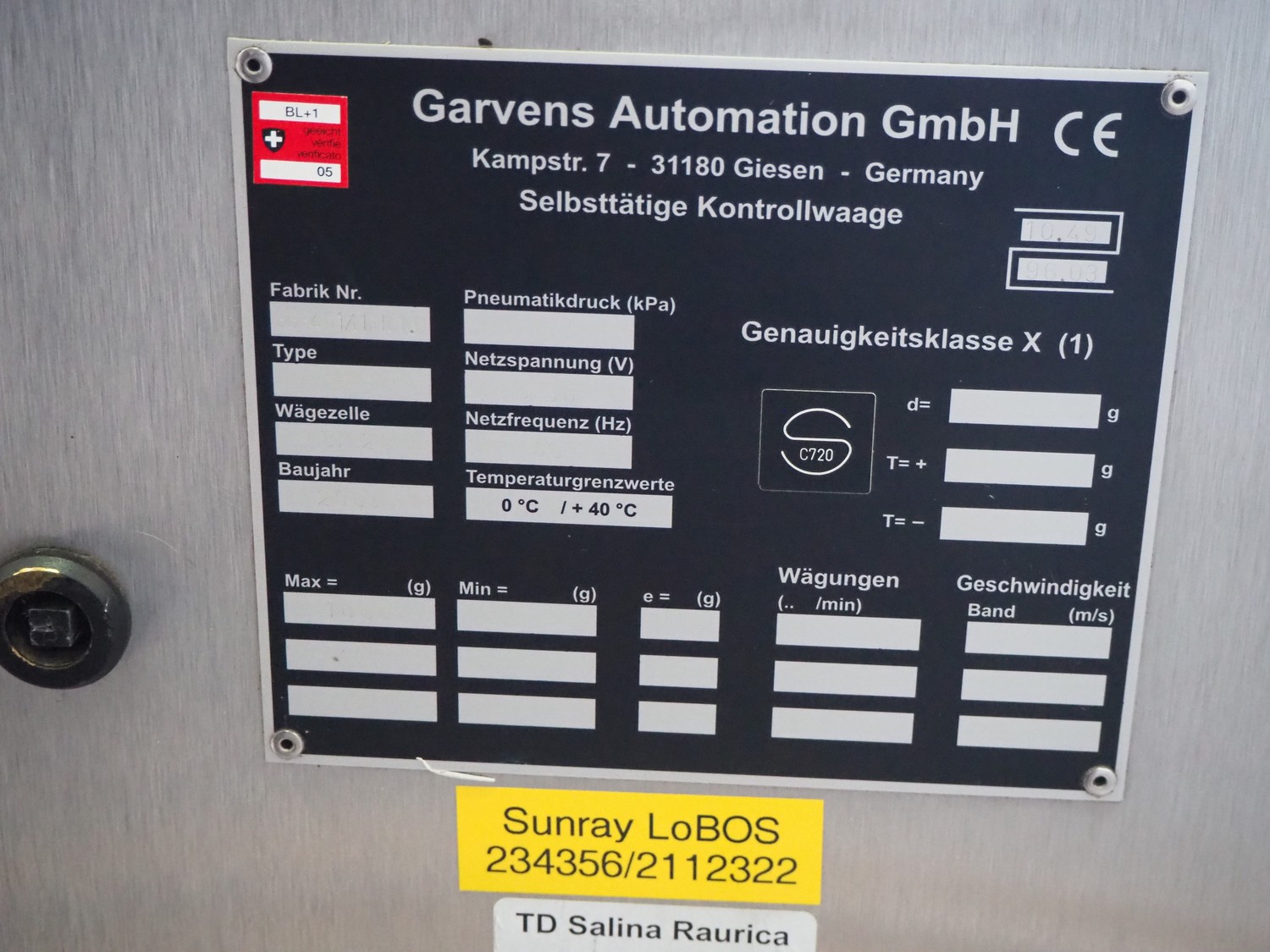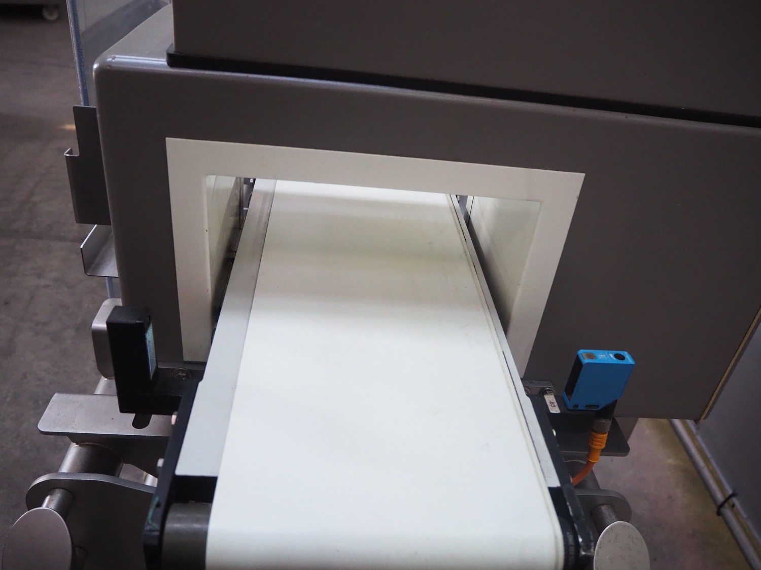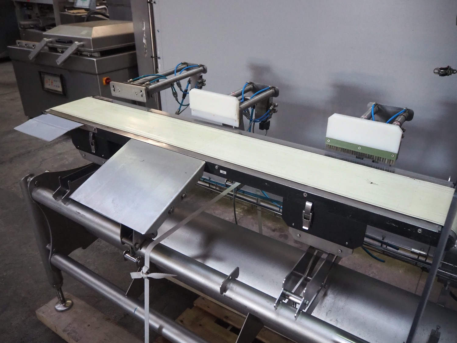 Garvens Mettler Toledo checkweigher and metal detector with 3 rejectors, type: S-Terminal - HMI, number: 24104064, plastic belt, belt width: 185 mm, clearance: 250 mm x 110 mm, total dimensions: 2500 mm x 1000 mm x 1850 mm. Missing checkweigher.