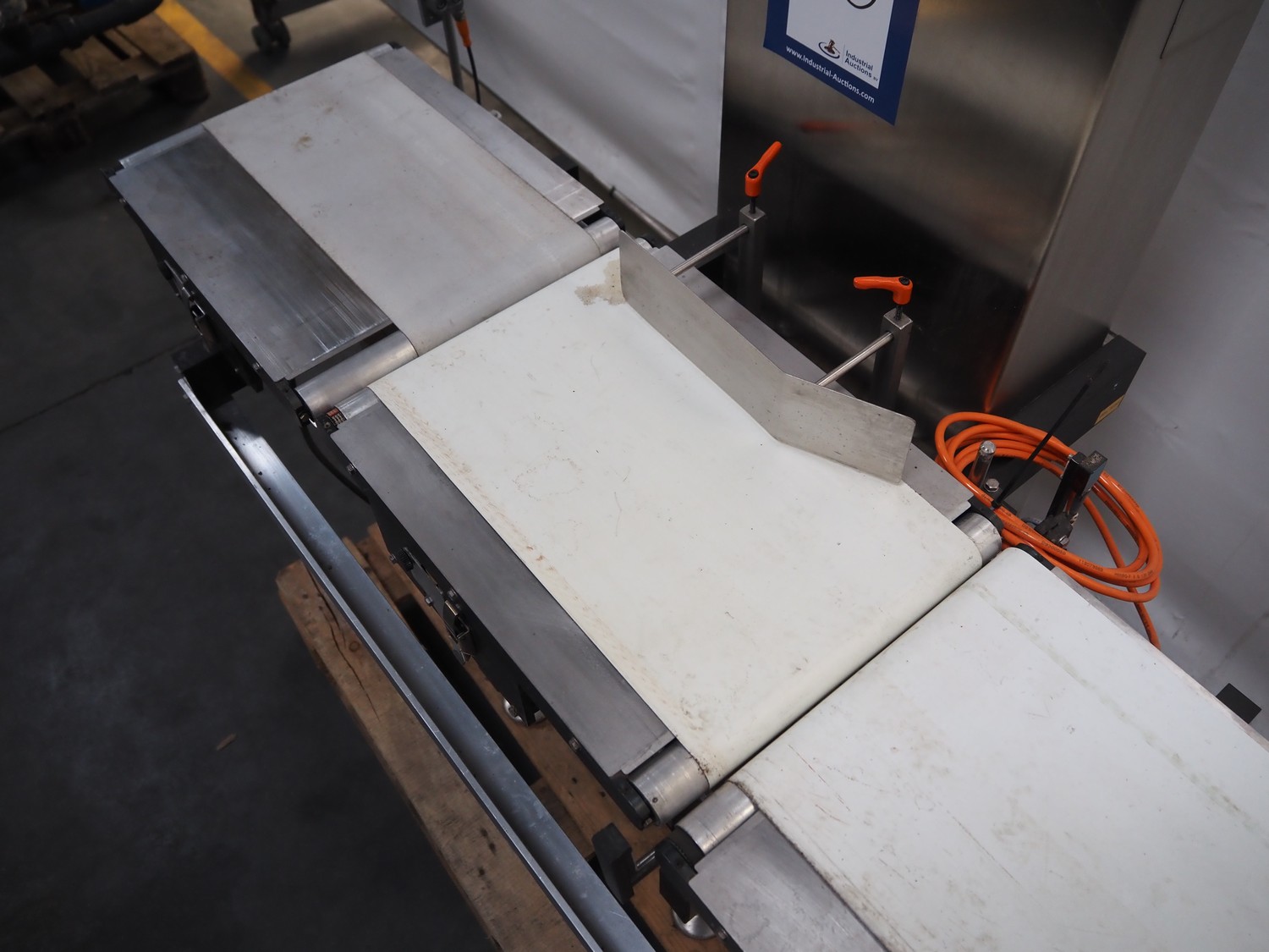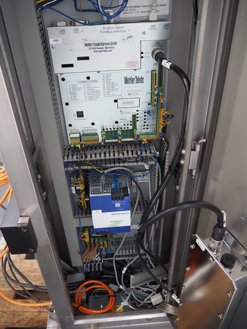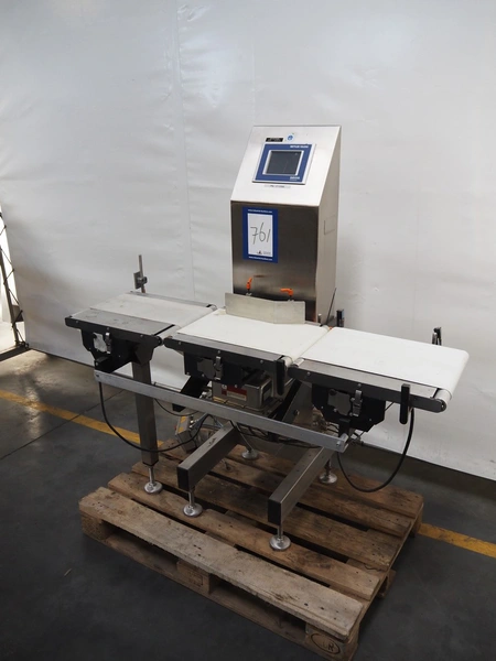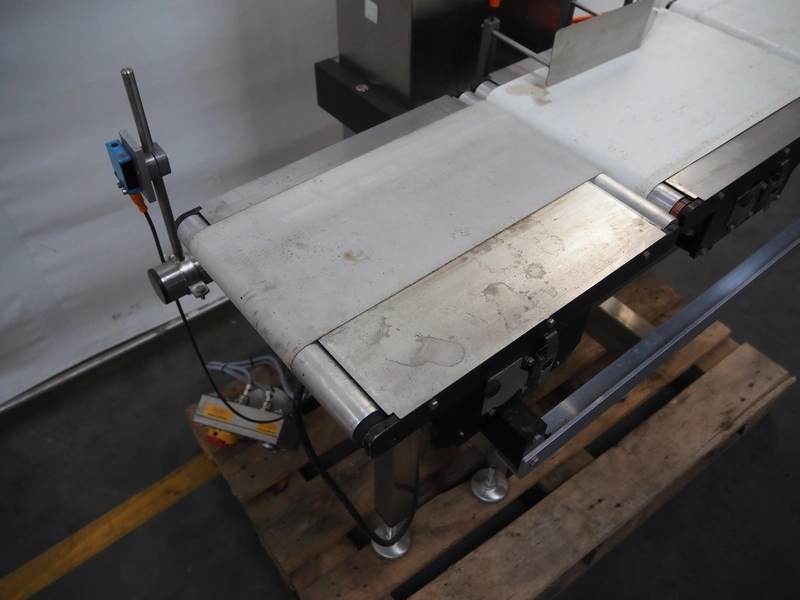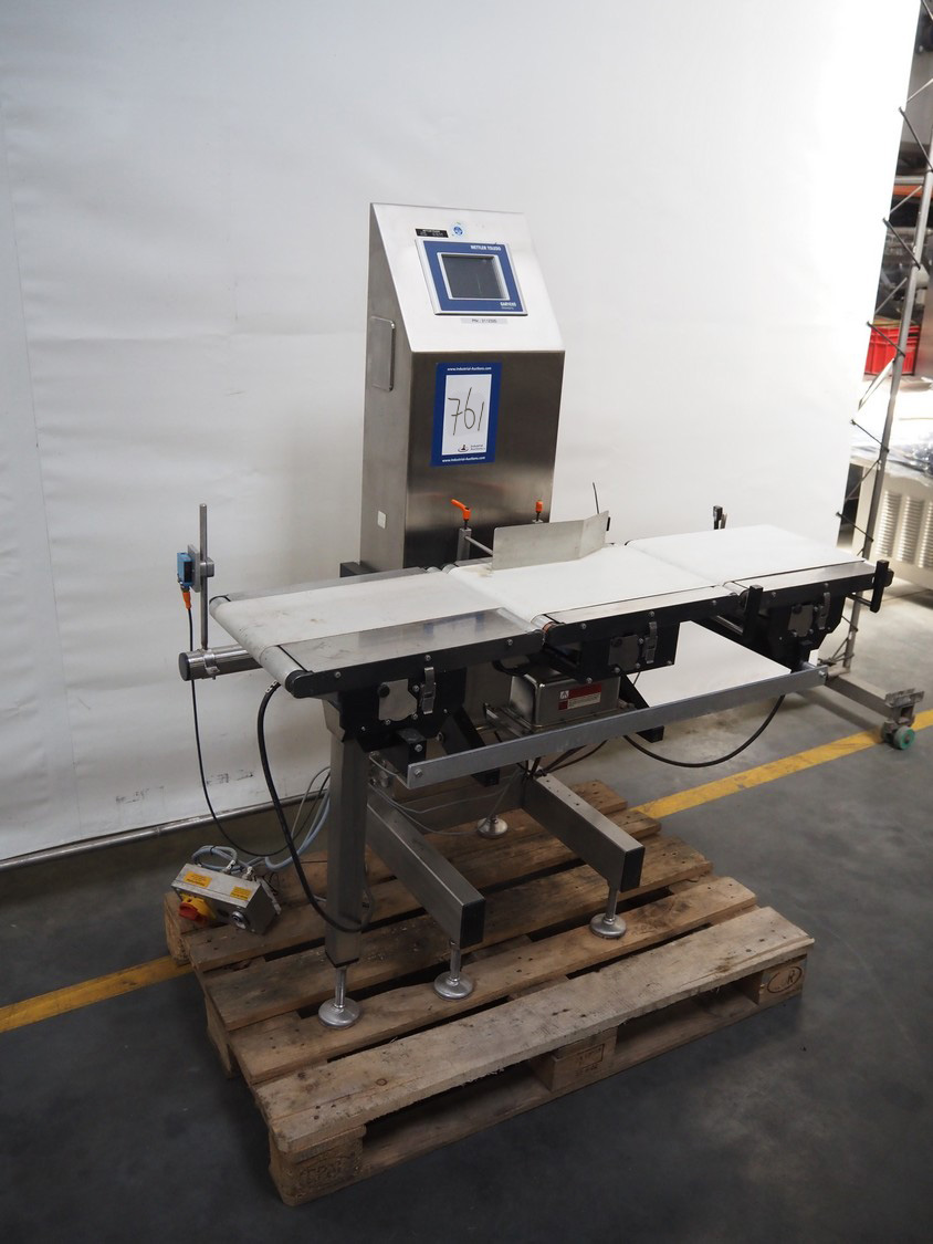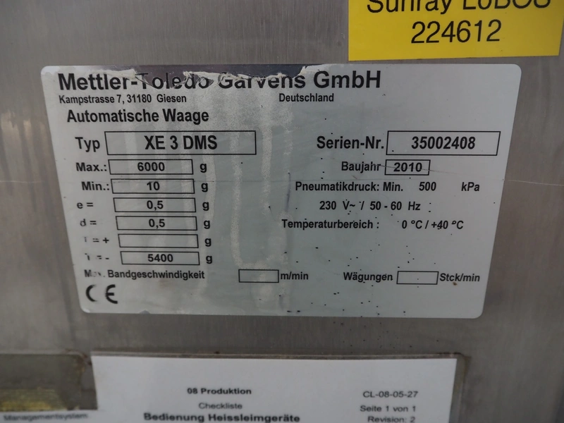 Mettler Toledo checkweigher, type: XE 3 DMS, serial number: 35002408, year of construction: 2010, 230 V, 50/60 Hz, max/min weight: 6000 g/10 g, e = 0.5 g, d = 0.5 g, plastic belt, belt width: 195 mm, 265 mm and 275 mm, total dimensions: 1360 mm x 800 mm x 1450 mm.