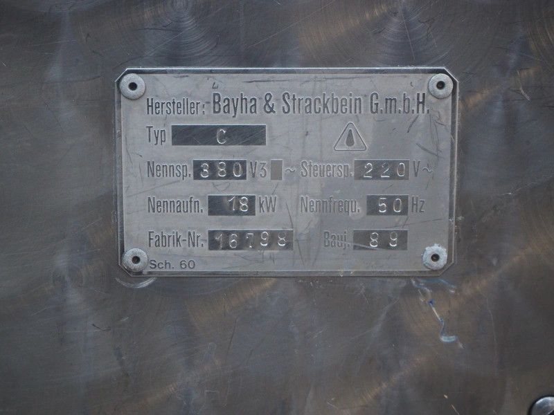 Bayha & Strackbein GmbH cooking vessel, type: C, fabrication number: 16798, year of construction: 1989, 380 V, 3 Ph, 50 Hz, 18 kW, inside dimensions: 900 mm x 800 mm x 400 mm, total dimensions: 1350 mm x 100 mm x 1050 mm.