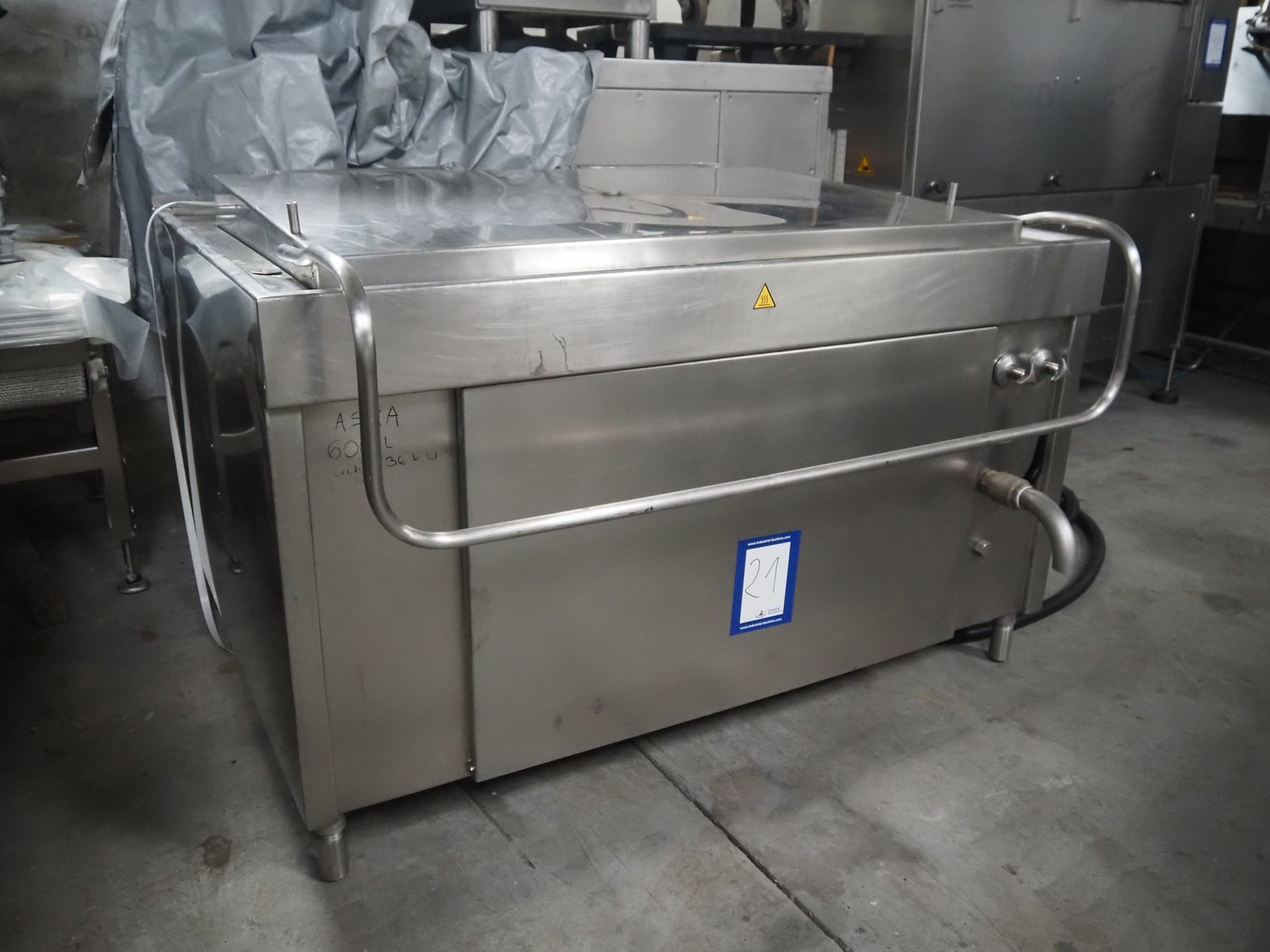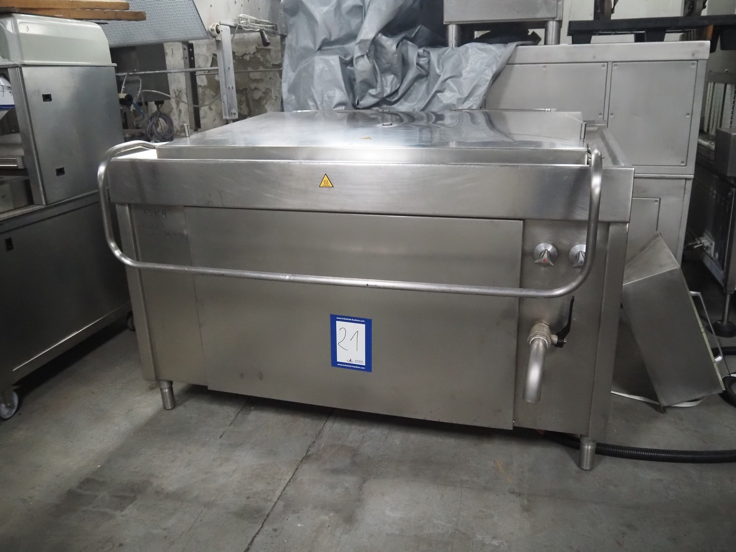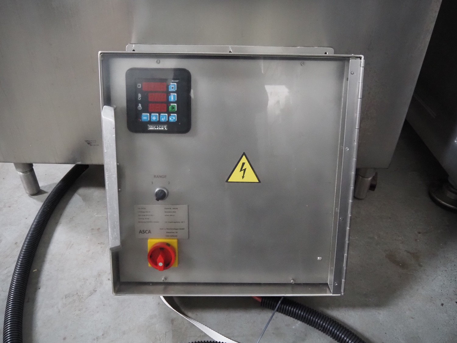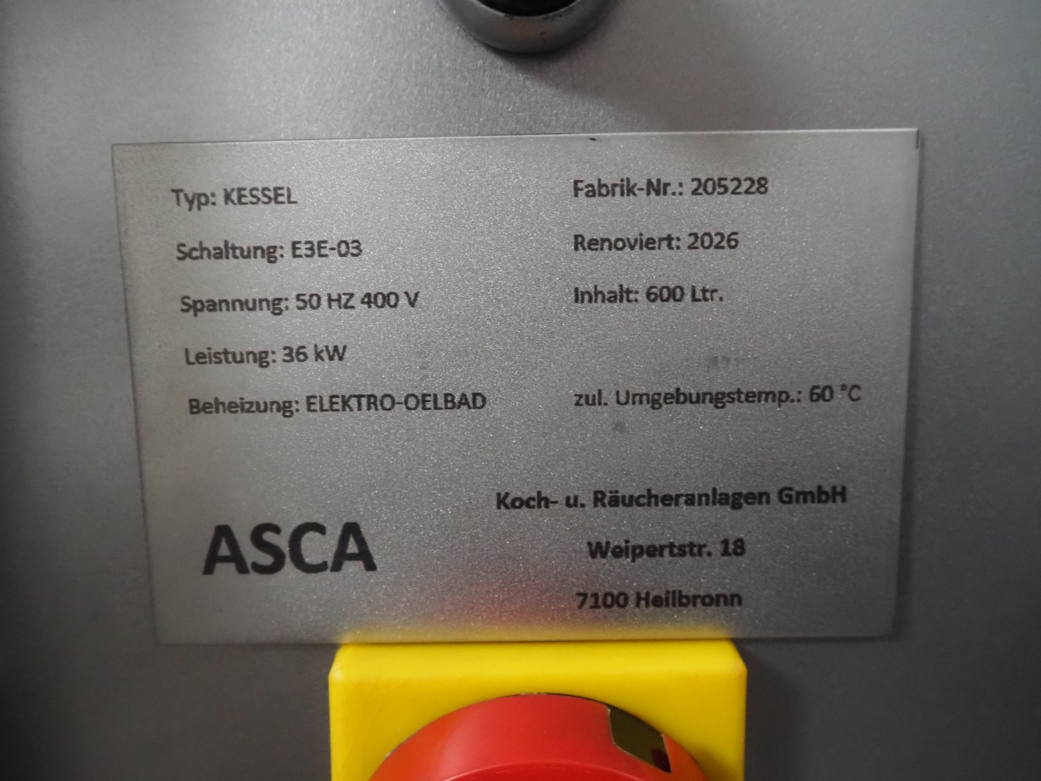 ASCA cooking vessel, type: KESSEL, number: 205228, 400 V, 50 Hz, 36 kW, capacity: 600 liter, inside dimensions: 1420 mm x 900 mm x 450 mm, total dimensions: 1700 mm x 1450 mm x 1200 mm.