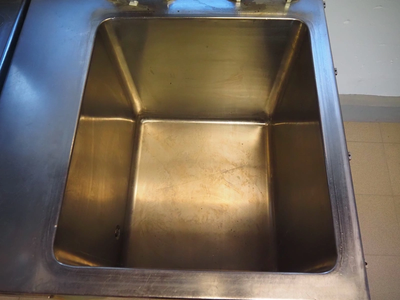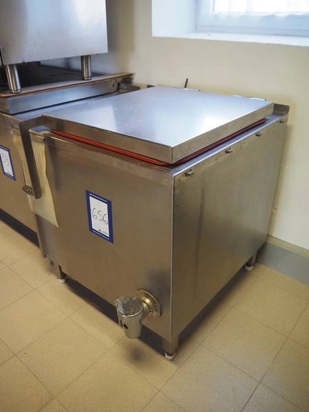 Cooking vessel, inside dimensions: 610 mm x 700 mm x 610 mm, total dimensions: 950 mm x 1050 mm x 1050 mm.