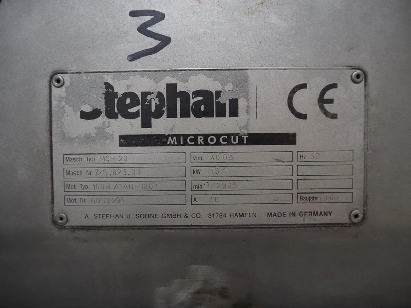 Stephan mobile micro cutter, machine type: MCH 20, machine number: 725.823.01, year of construction: 1999, 400 V, 50 Hz, 26 A, 15 kW, dimensions: 1600 mm x 920 mm x 1600 mm.