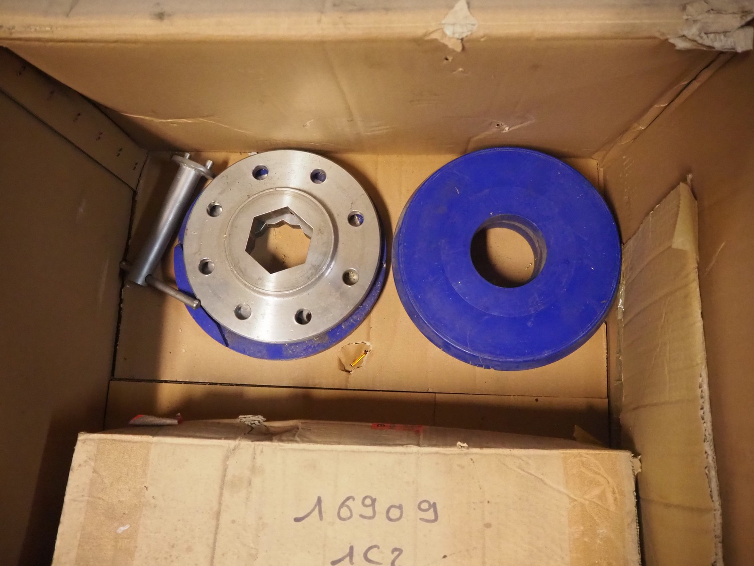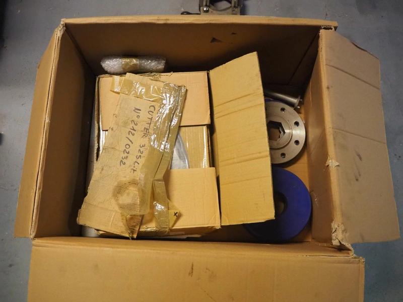 Box with parts for CFS/ Kramer + Grebe cutter, 6 knives, 325 L, dimensions: 800 mm x 600 mm x 550 mm.