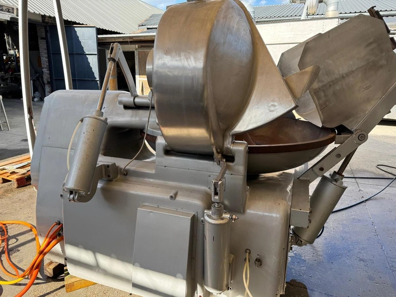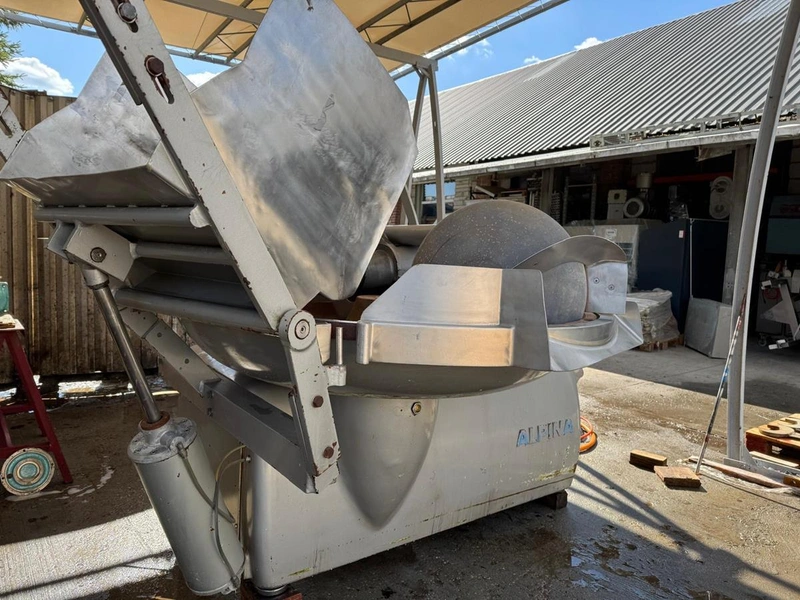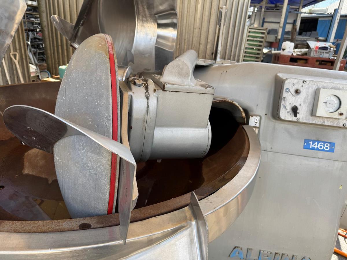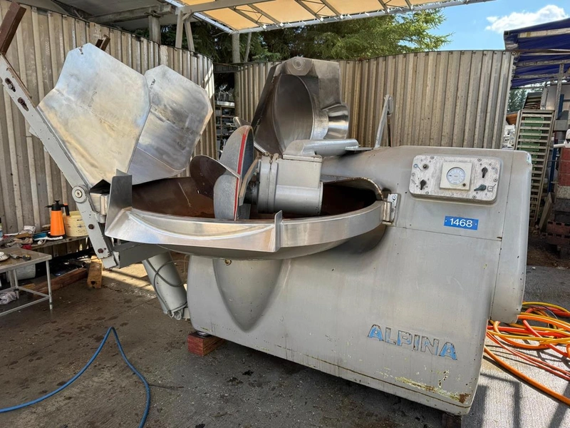 Alpina bowl cutter with lifter for meat bins and ejector, steel bowl, dimensions bowl: Ø 1450 mm x 320 mm, total dimensions: 2800 mm x 2100 mm x 2100 mm.